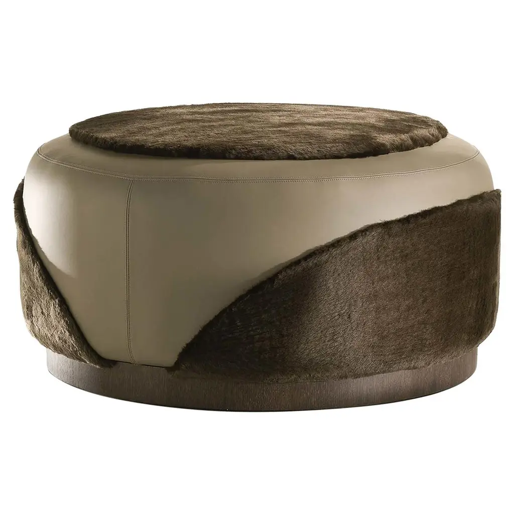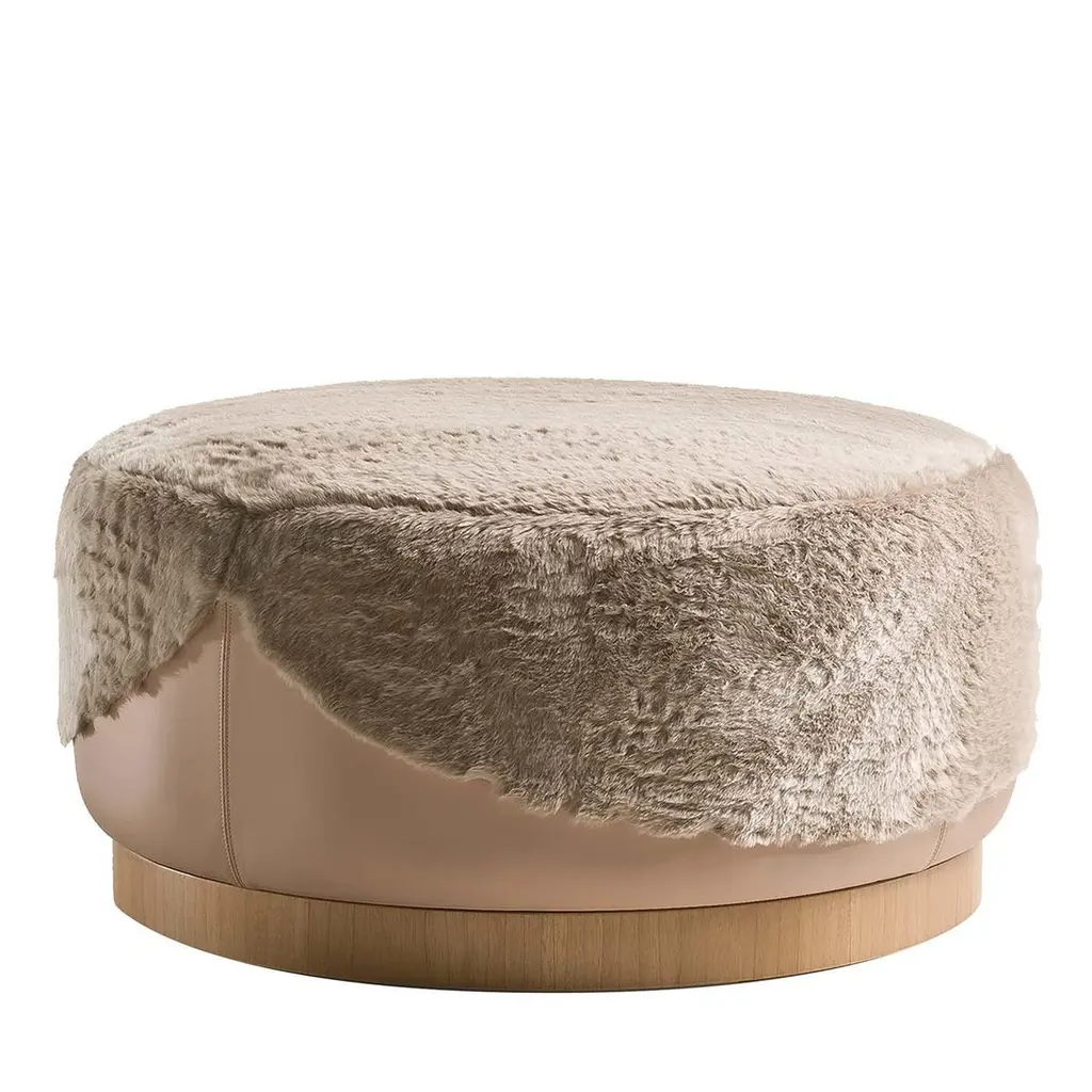 A delicate color palette and a striking combination of textures make this design a superb addition to a modern interior, where it will be a precious addition to a contemporary living room as extra seating or to a rustic private study as a base to rest trays or other objects. The plinth base in walnut has a natural finish and supports a fully upholstered body in a dust pink-colored leather adorned with inserts and top in faux fur for a luxuriously soft effect.