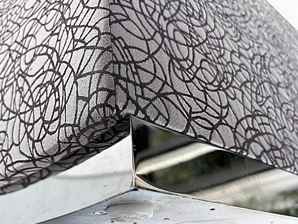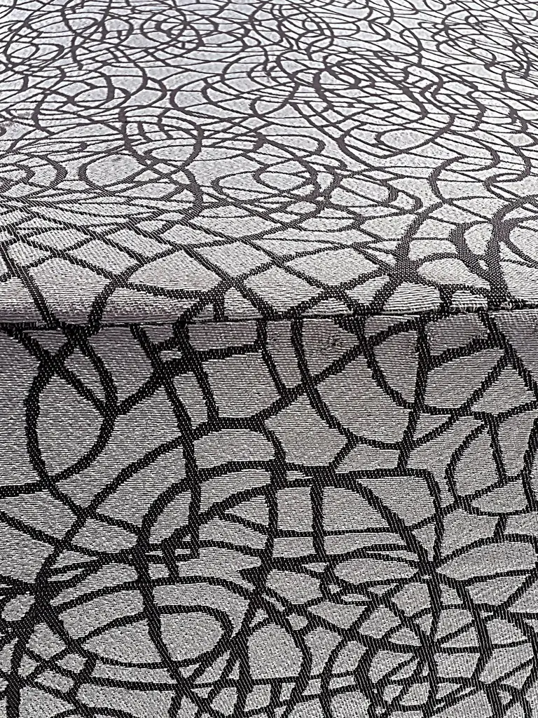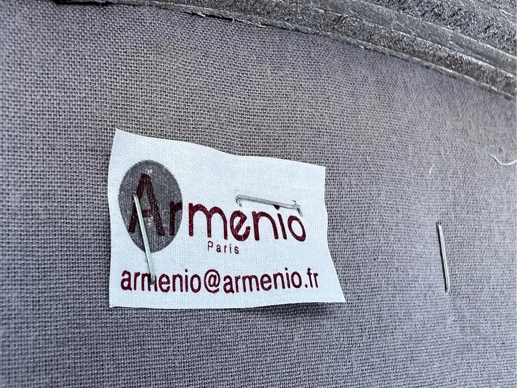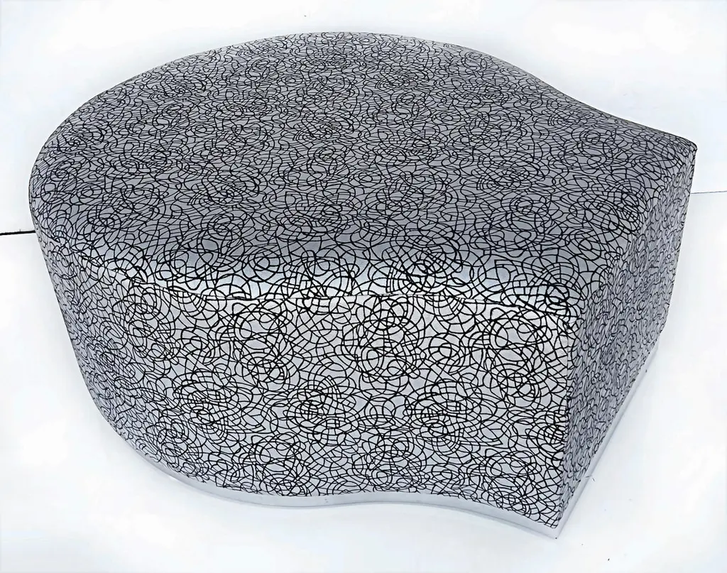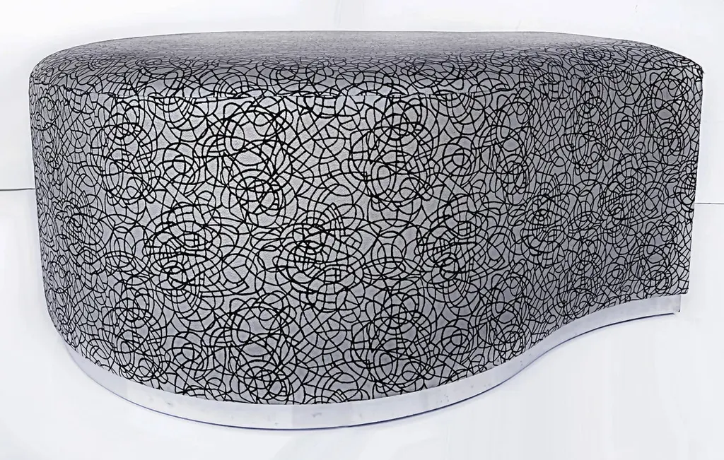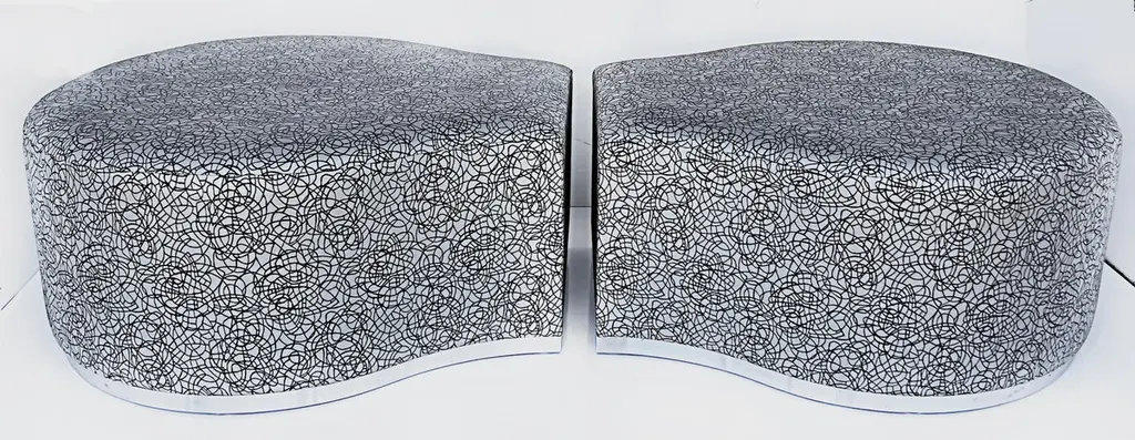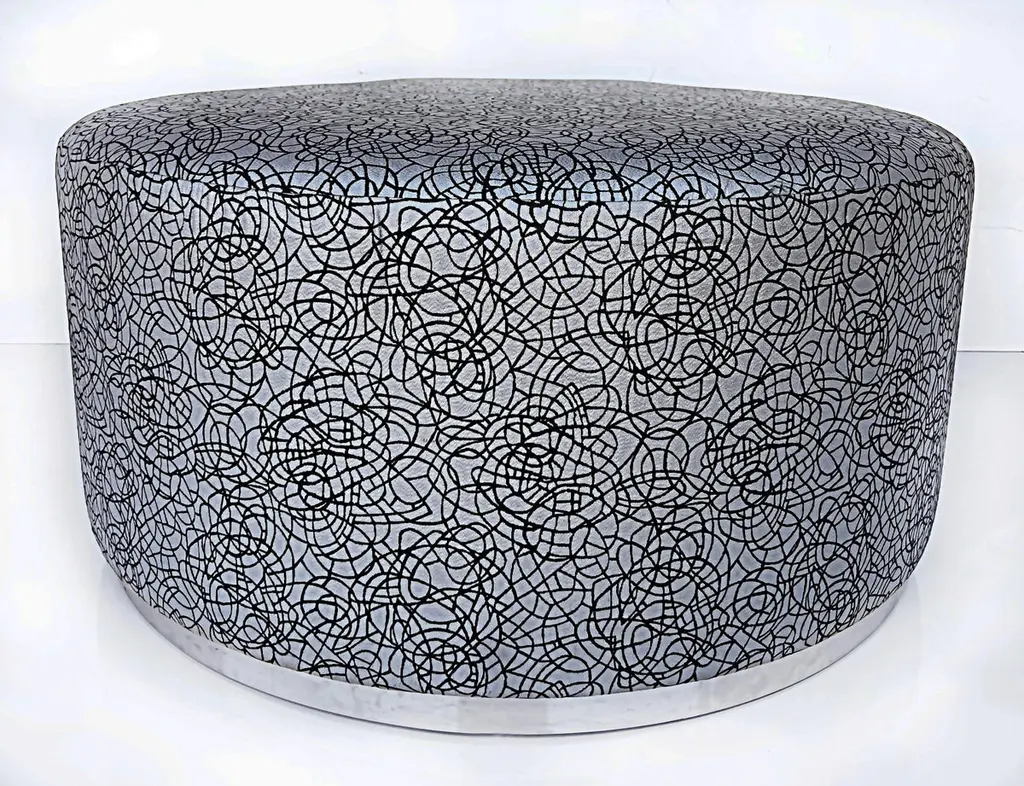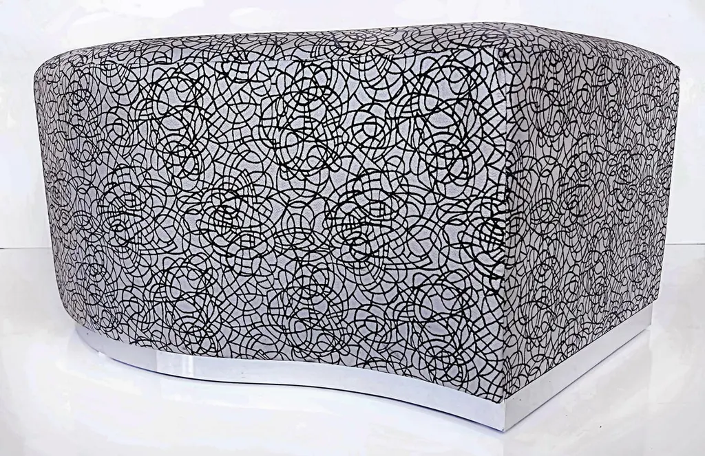 Overscale Ottomans by Armenio, Paris for Christian Dior Boutique store display pairOffered for sale is a pair of unusually shaped overscale fine-quality ottomans that were commissioned and custom-made in Paris for use in Christian Dior boutiques. The ottomans are marked with the Armenio Tapissier Décorateur Paris tags on the undersides. These were never made available for sale to the public. They are quite elegant with their shape and their abstract gray graffiti pattern upholstery. They stand on a wood platform and are supported by a substantial chrome band at the base. They are a one-of-a-kind design solely for Dior. We have 2 pairs available from the Dior boutique.Measures: 40" W × 35" D × 17.5" H.