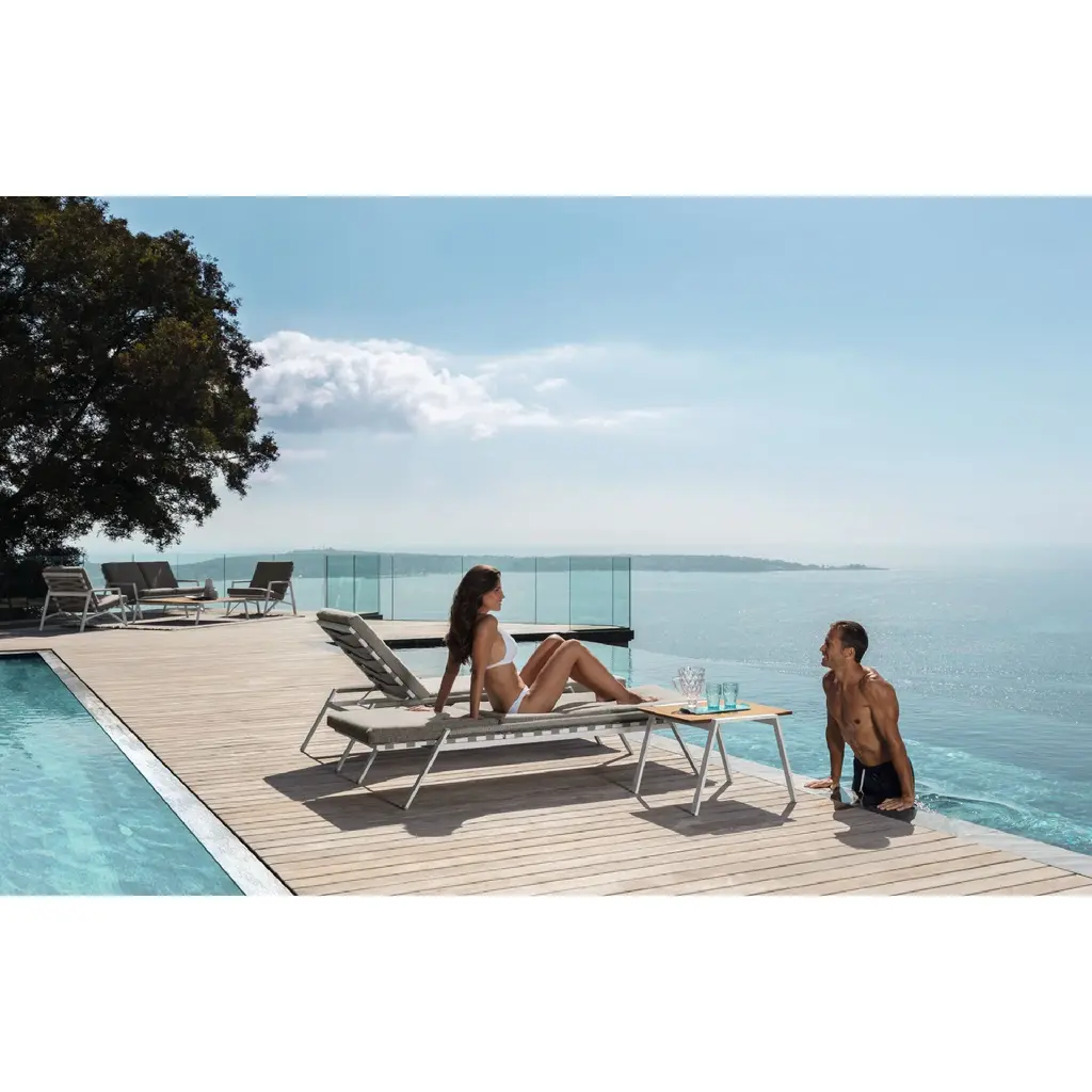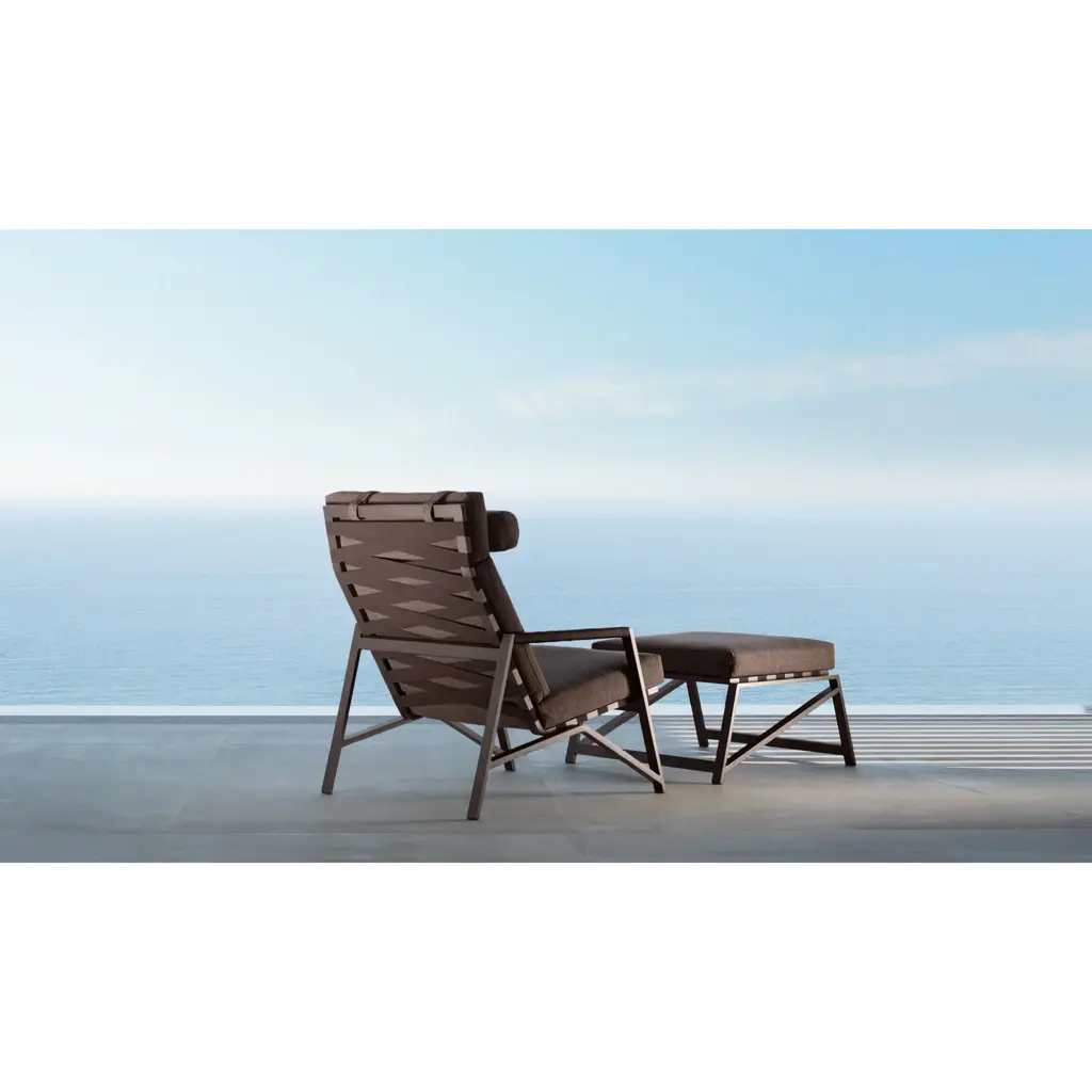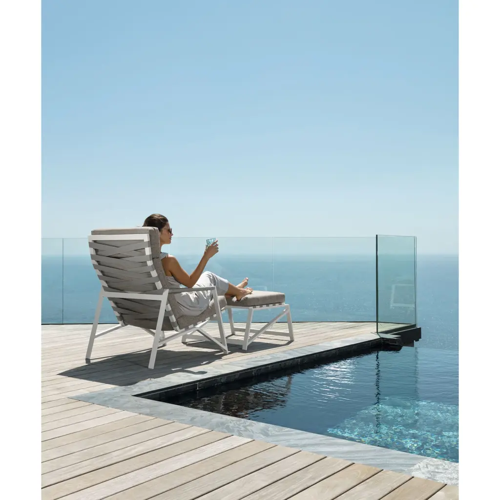 The outdoor pouf completes the country spirit of the Cottage together with the sofa and the armchairs. Powder-coated aluminum frame and synthetic elastic belts support the seat. The cushions are removable, easy to wash and weather resistant. Quick dry foam padding.