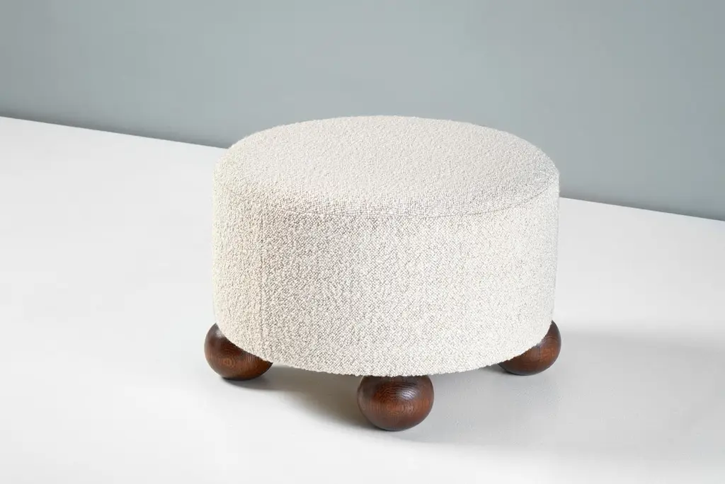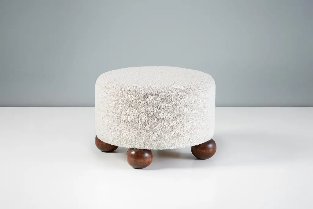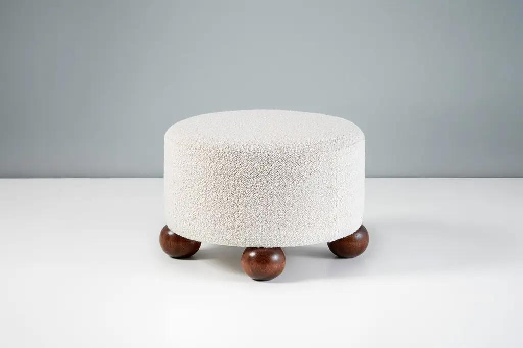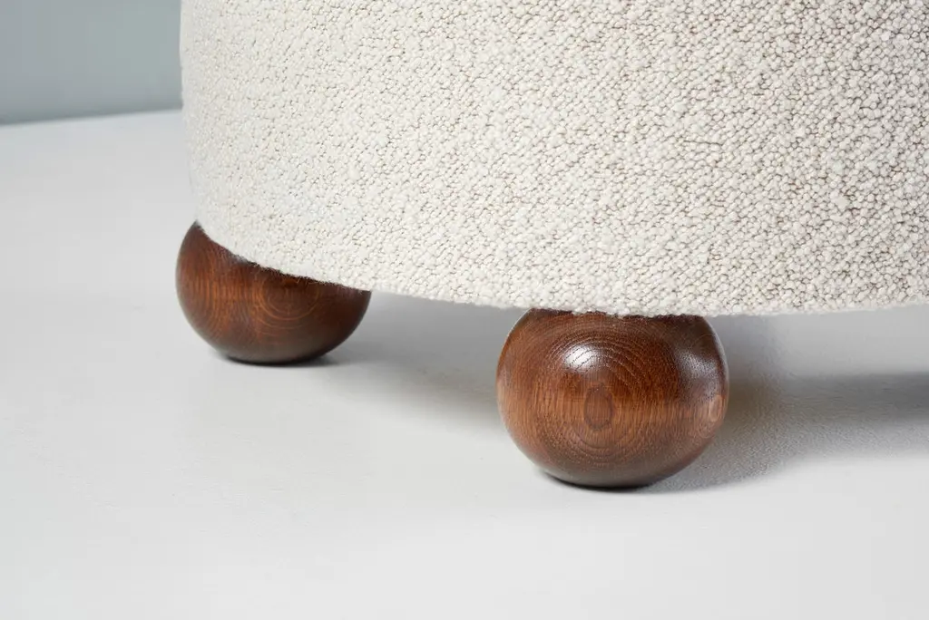 Dagmar - Luupo Round OttomanThe Luupo Ottoman offers a versatile and sophisticated seating option for any modern interior. The round, inviting form sits on top of solid oak or walnut ball feet in a range of rich finishes. These examples are upholstered in Karakorum 'Ecume' boucle fabric by Dedar Milan and have fumed oak ball feet. This ottoman is available to order in a range of different materials and with a choice of 3 leg finishes, it is also available in a 45cm tall version.Dimensions: D 55 cm / H 40 cm.
