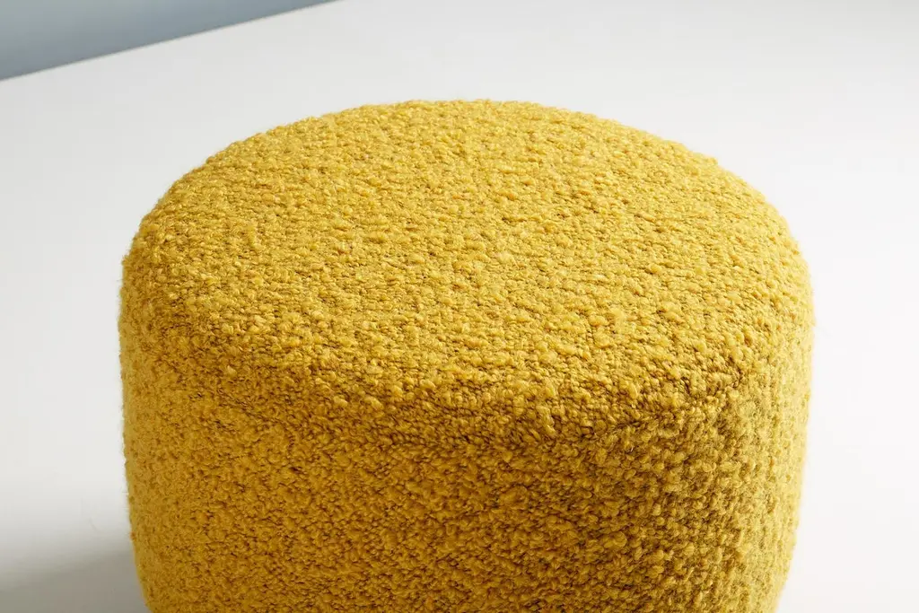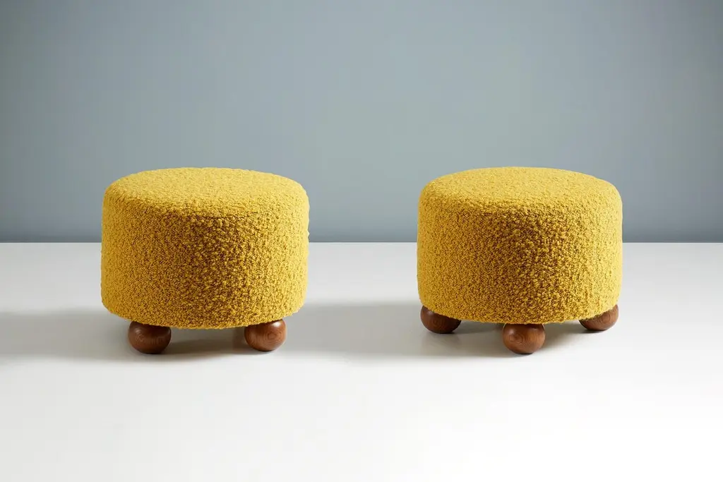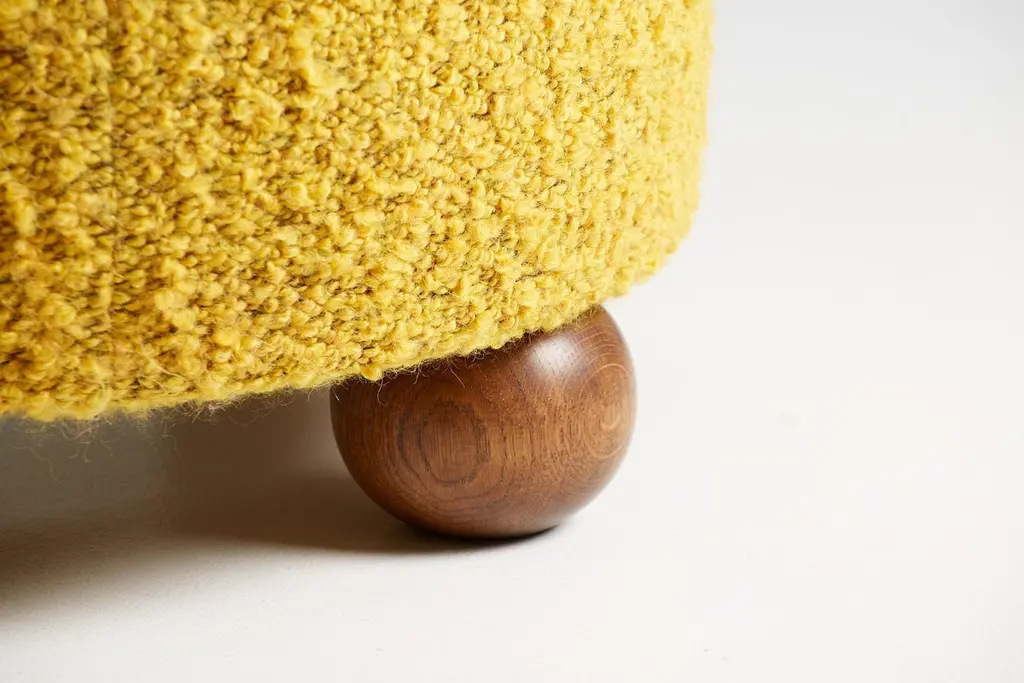 Dagmar Design - Round Ottoman.Custom-made ottomans developed & produced at our workshops in London using the highest quality materials. These examples are upholstered in Pierre Frey OPIO boucle fabric in a vivid yellow colour-way The distinctive ball feet are made from solid fumed & oiled oak. This ottoman is available to order in a range of different materials and with a choice of 4 leg finishes. Measures: D 60 cm / H 45 cm.