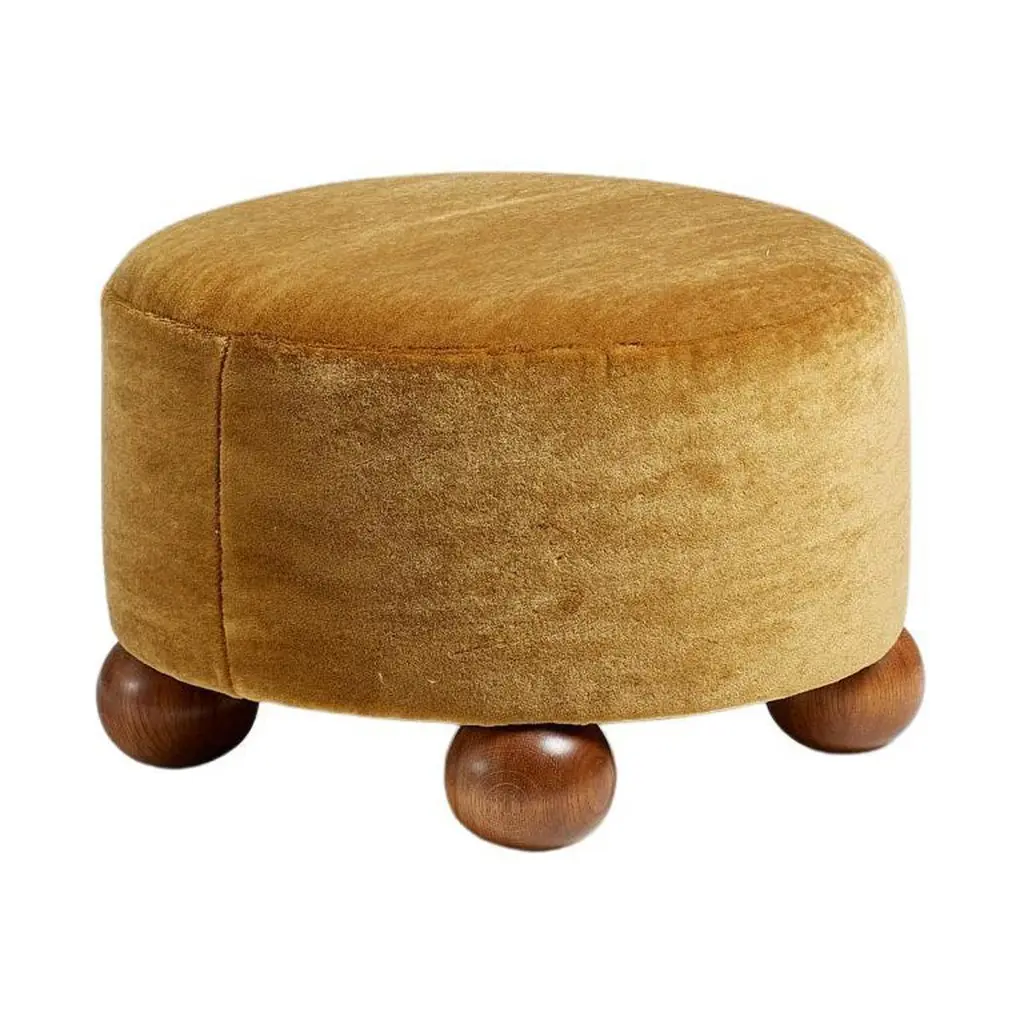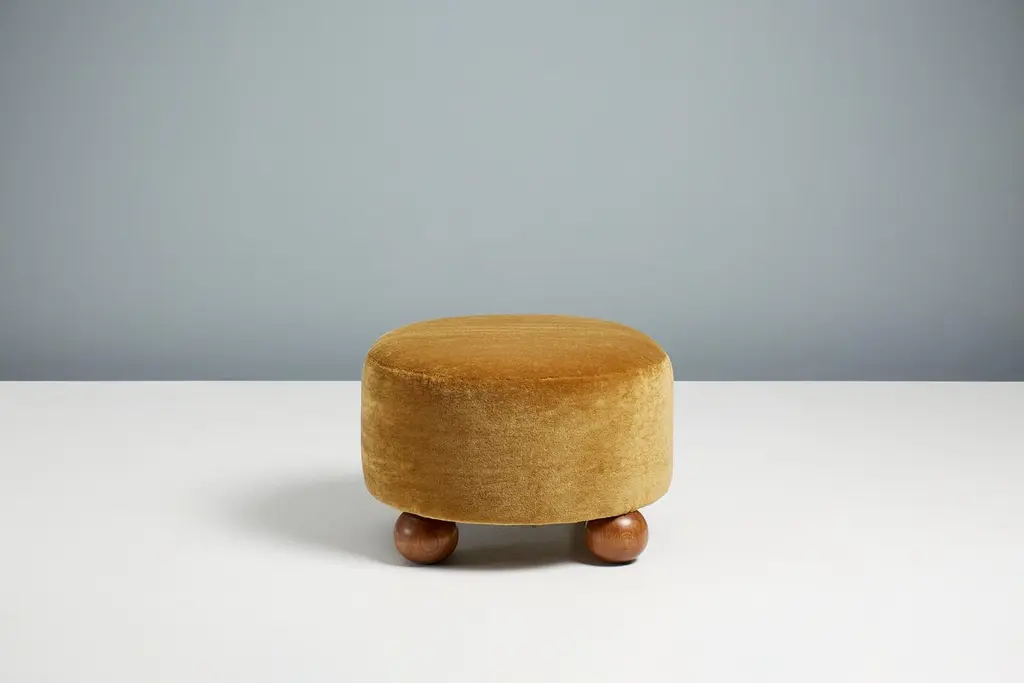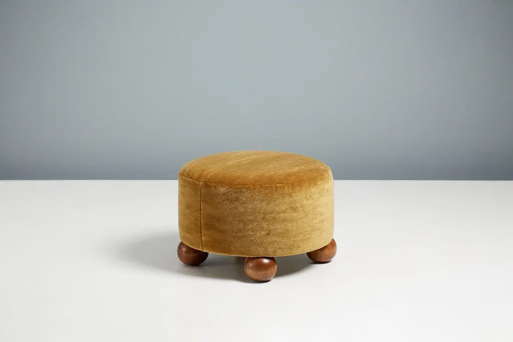 Dagmar Design - Round OttomanCustom-made ottomans developed & produced at our workshop in Sweden using the highest quality materials. These examples are upholstered in a mustard mohair velvet by Pierre Frey with fumed oak ball feet. This ottoman is available to order in a range of different materials and with a choice of 4 leg finishes. Please contact us for more information. This ottoman is also available in a 45cm tall version.Measures: D 55 cm / H 40 cm.