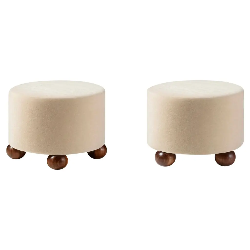 Pair Of Custom Made Round Mohair Velvet Ottomans With Oak Ball Feet
