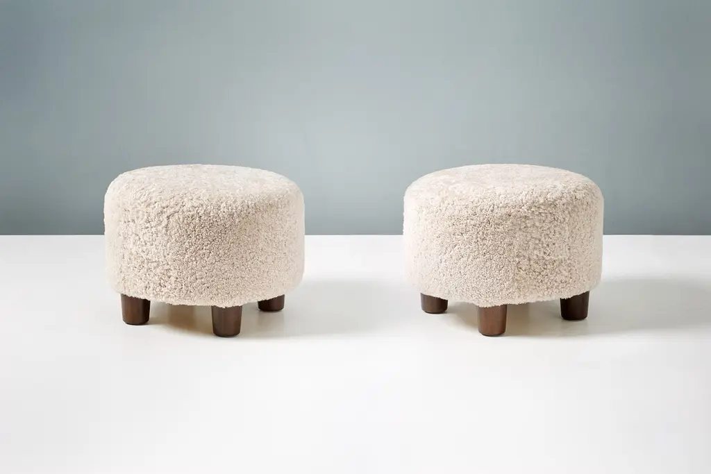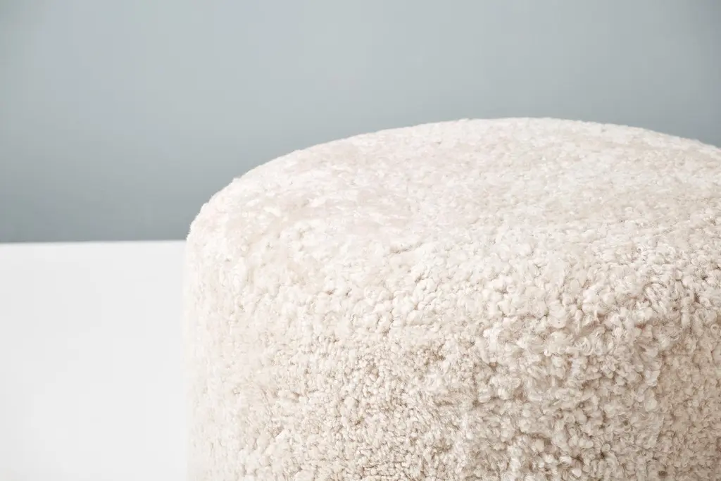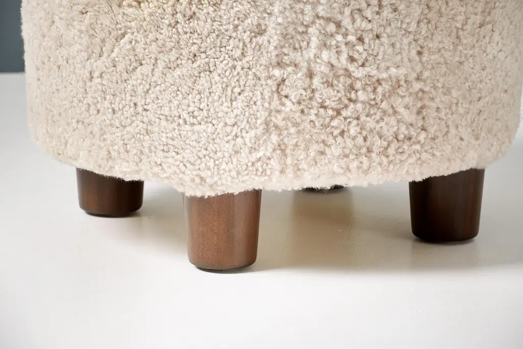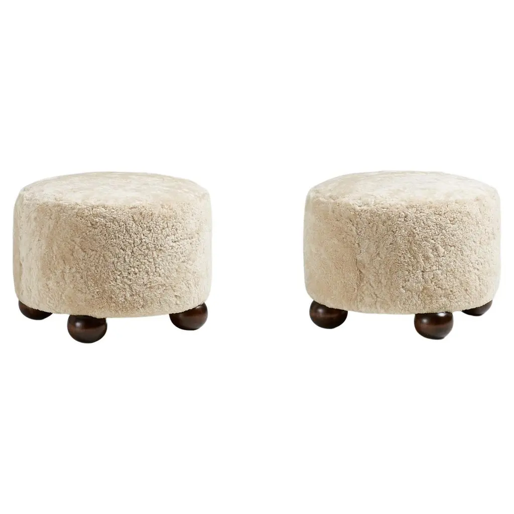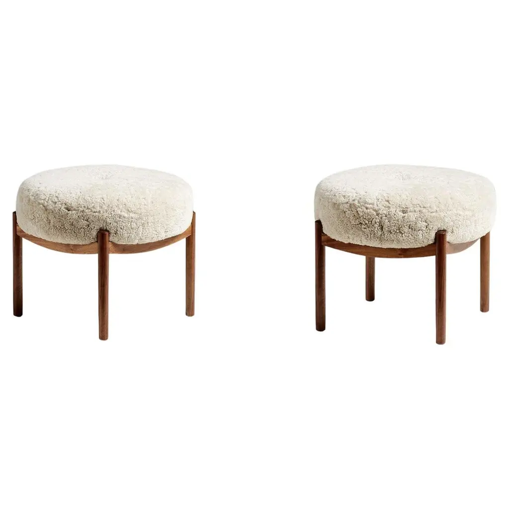 A pair of round custom made shearling ottomans on hardwood base with stained beech legs. The foam body is covered in premium, tufted Australian shearling. These items are made to order in our London workshop, multiple pieces are available by request.