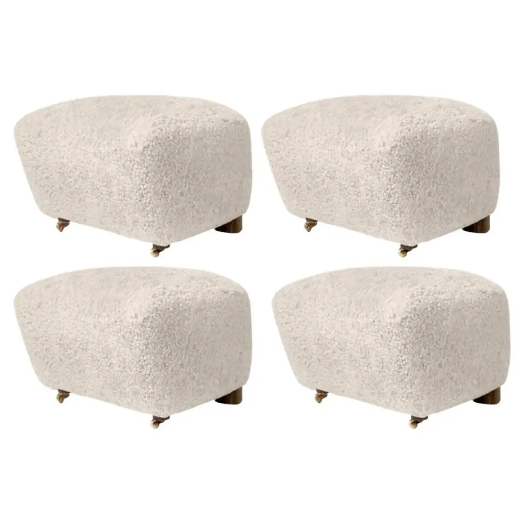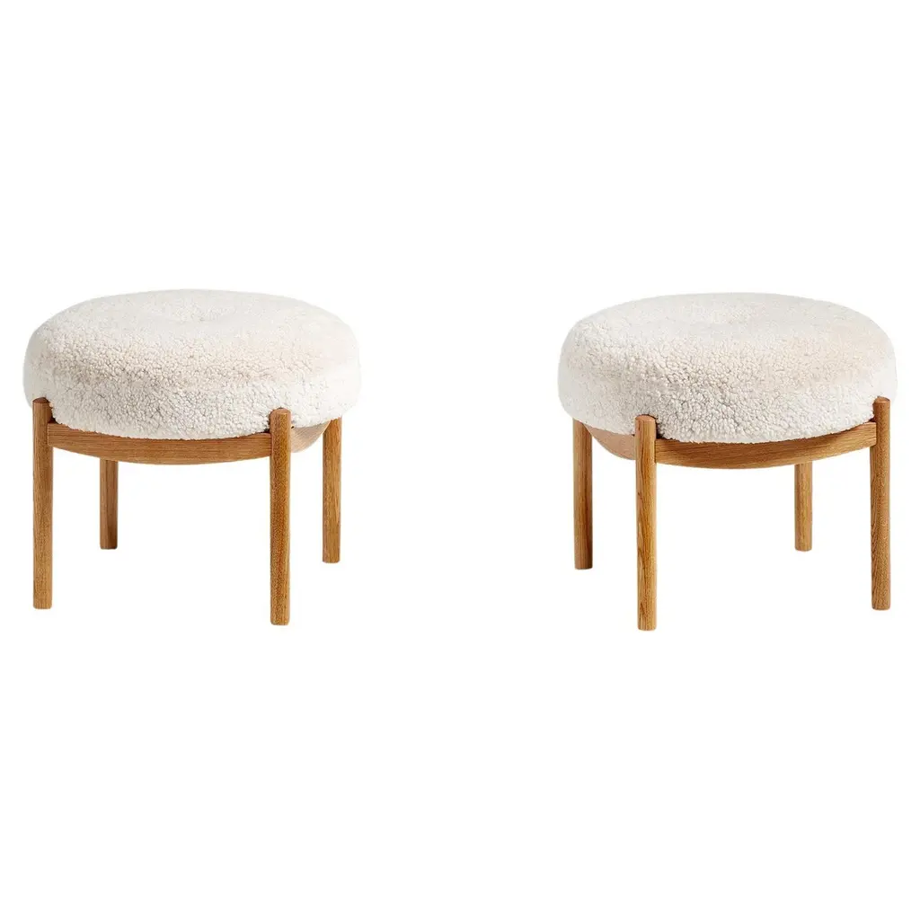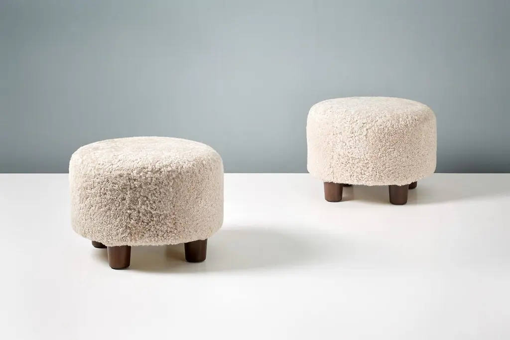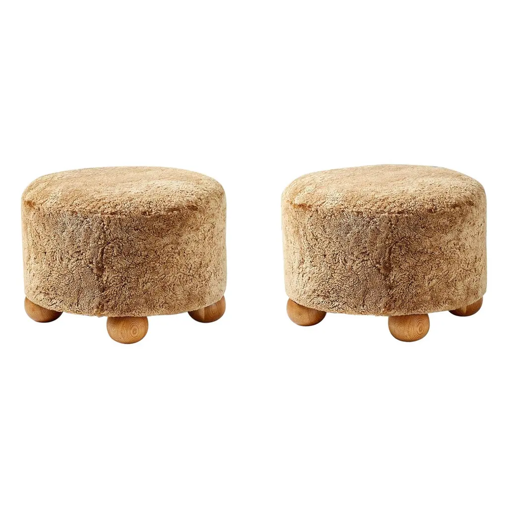A pair of round custom made shearling ottomans on hardwood base with stained beech legs. The foam body is covered in premium, tufted Australian shearling. These items are made to order in our London workshop, multiple pieces are available by request.