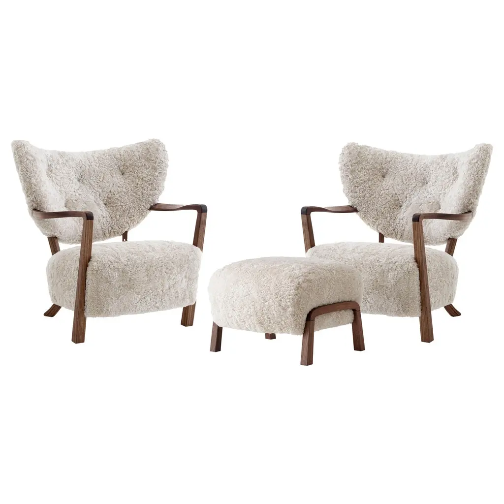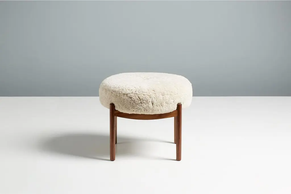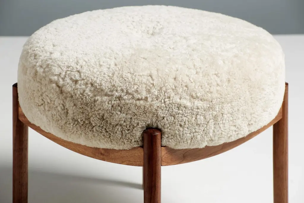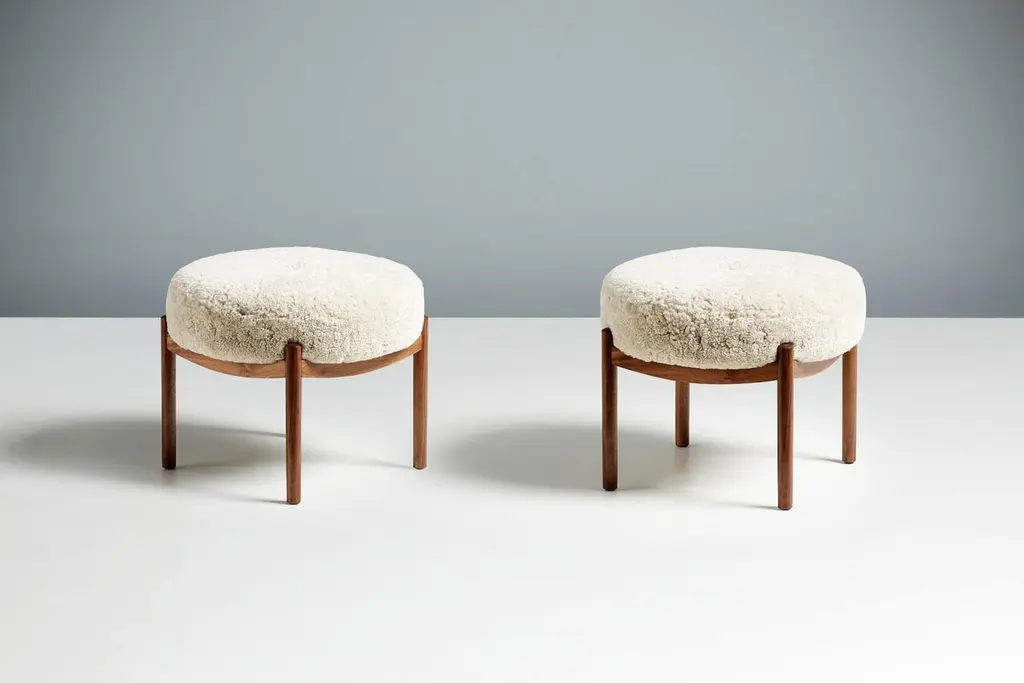 Pair Of Custom Made Walnut & Sheepskin Esko Ottomans