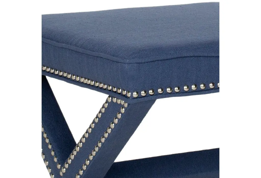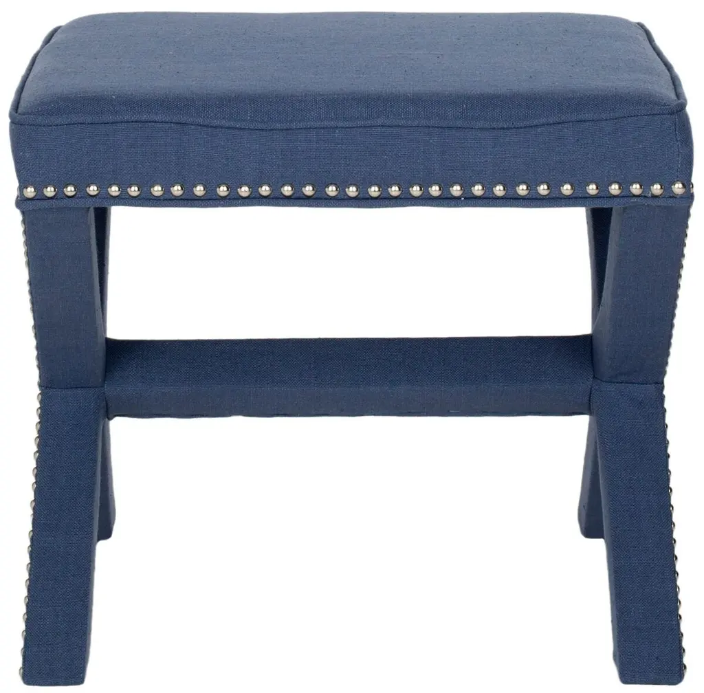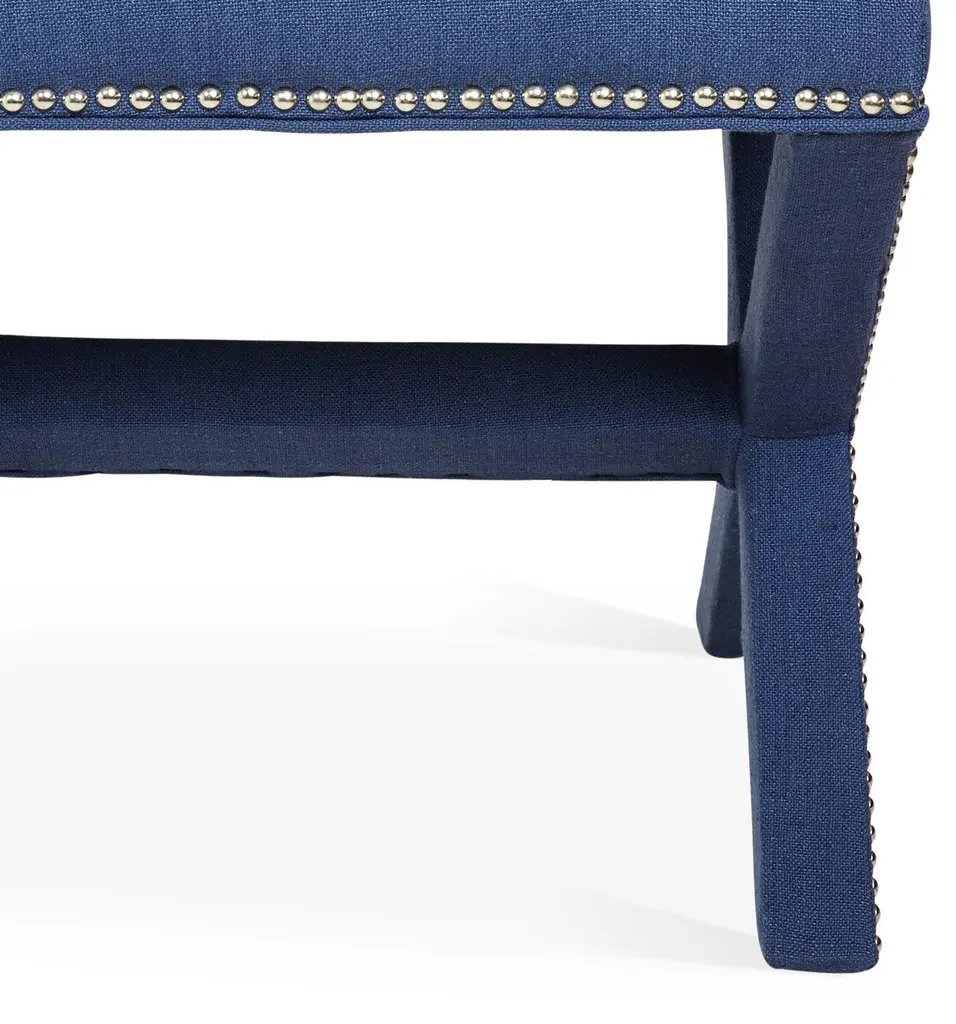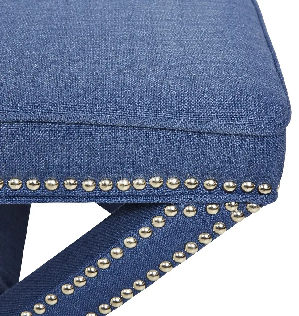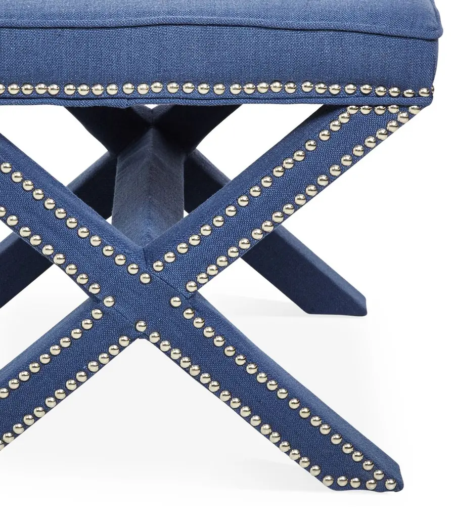 This X-base ottoman is an instant classic, featuring a streamlined shape and sophisticated nailhead detail that complements both traditional and modern settings. Its versatility allows it to be used individually or in pairs as extra seating or surface space, making it a stylish and functional addition to any room.