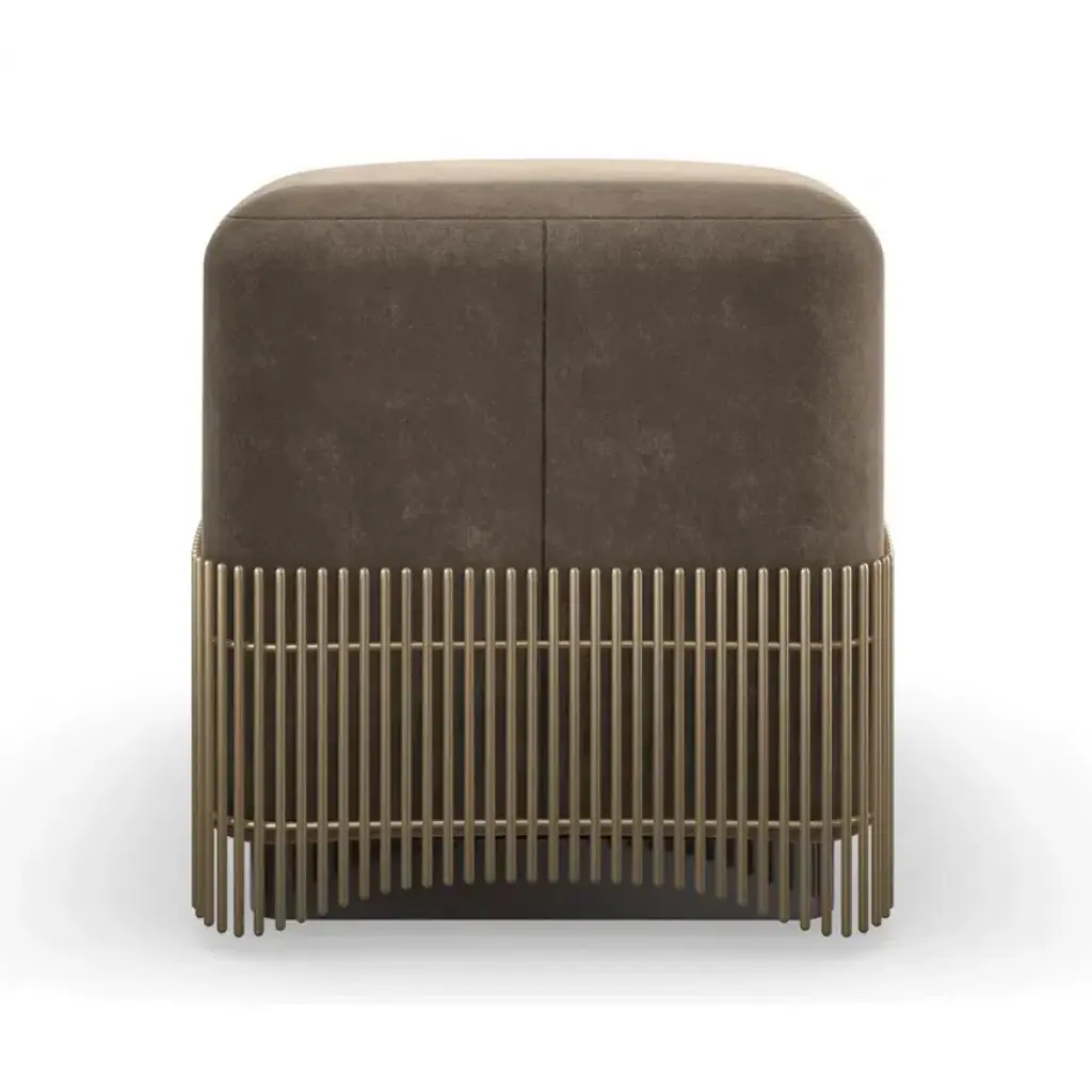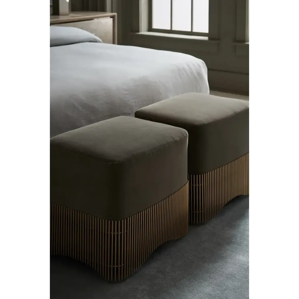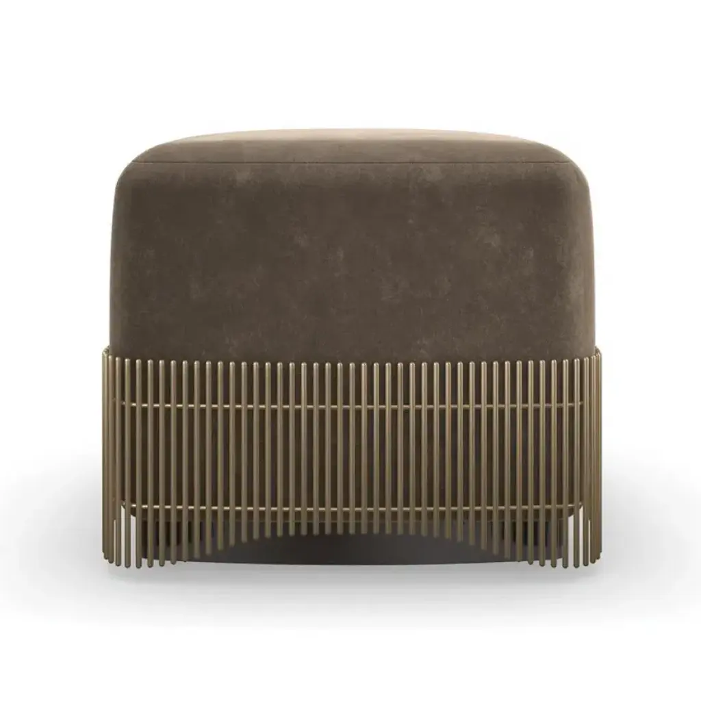 Luxury in a small package, this petite ottoman introduces a sense of rhythm and fluidity to living and bedroom interiors. Moss-green mohair is warmly complemented by a uniquely designed, metal rod skirt in Brushed Gold, introducing a gentle wave pattern that gives just a glimpse of its wood plinth base. Hidden casters make it easy to move from room to room. Well-scaled for vanities and dressing areas, or style in pairs to create a luxe landing at the end of a bed.