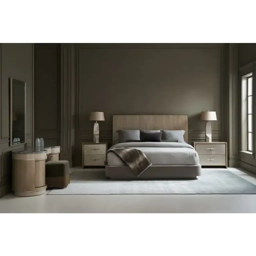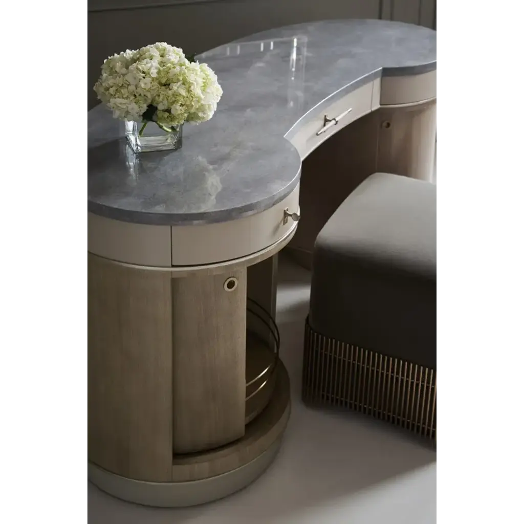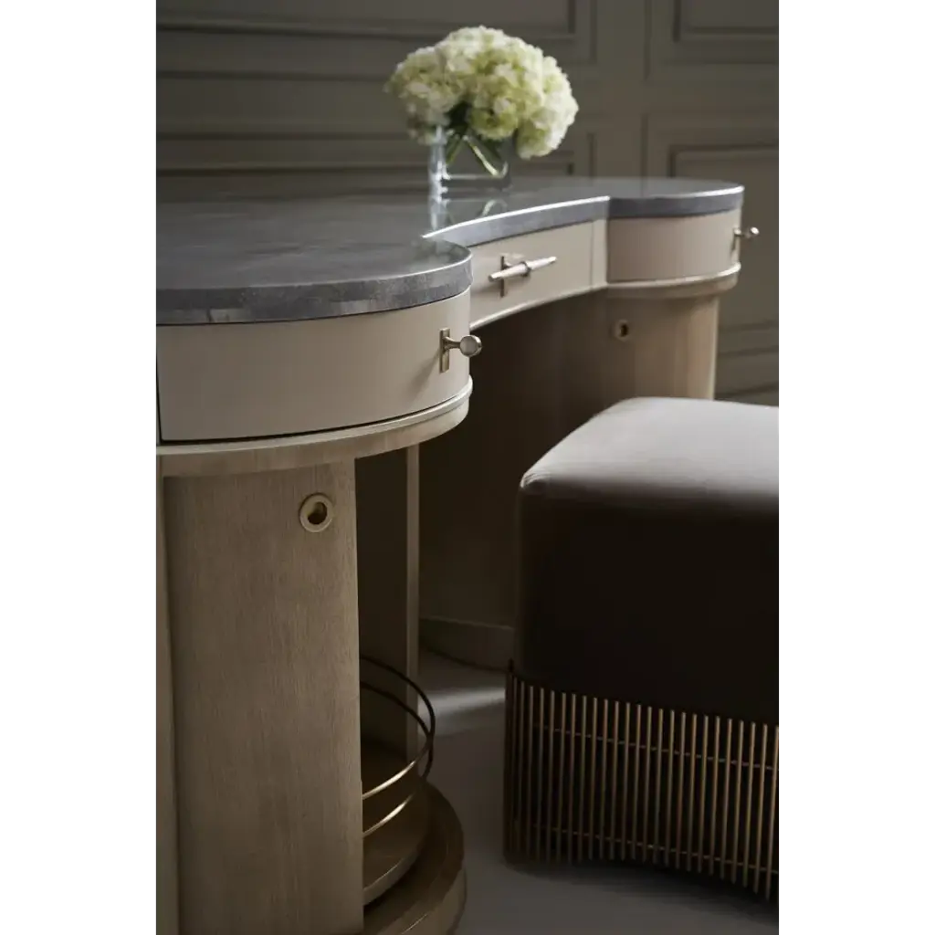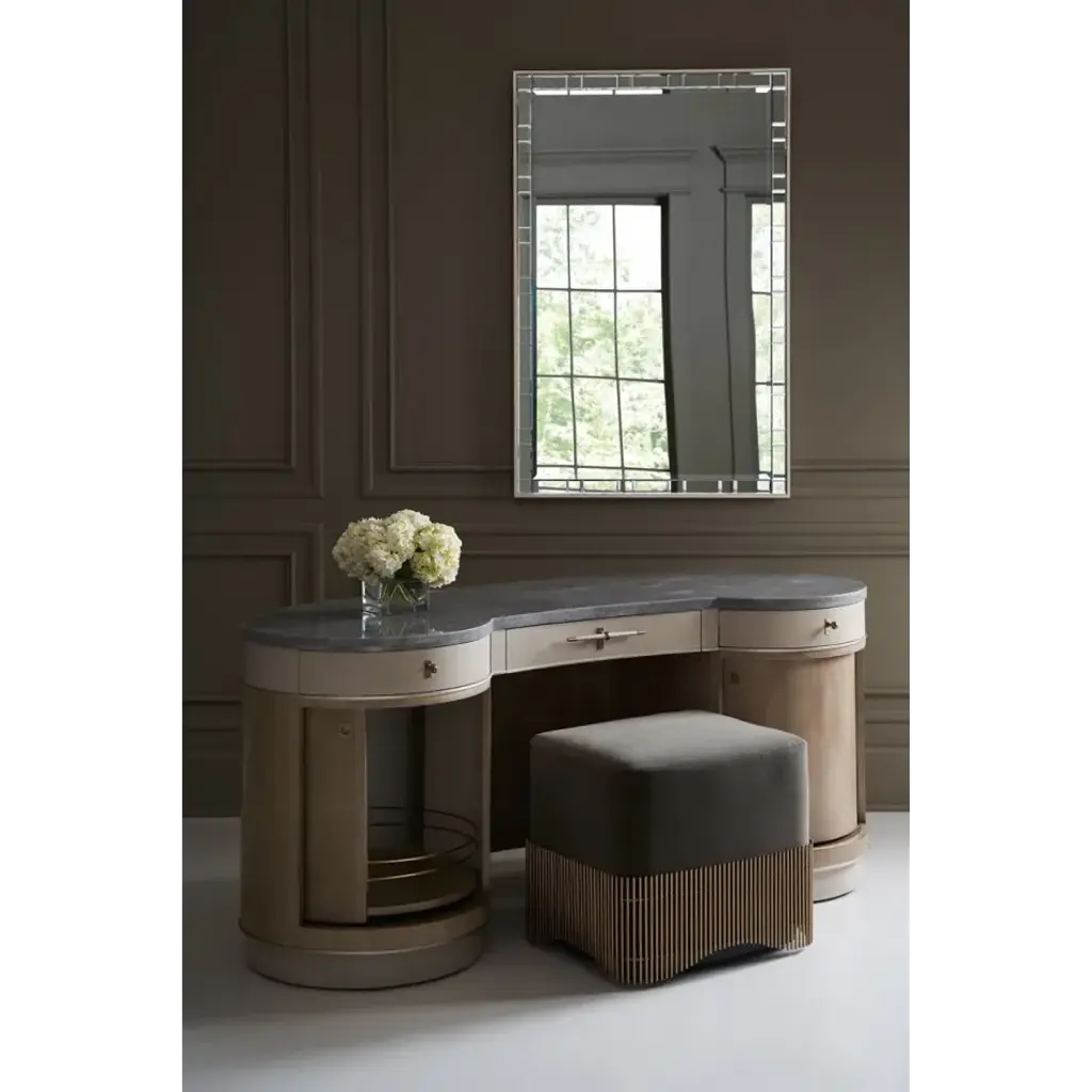 Luxury in a small package, this petite ottoman introduces a sense of rhythm and fluidity to living and bedroom interiors. Moss-green mohair is warmly complemented by a uniquely designed, metal rod skirt in Brushed Gold, introducing a gentle wave pattern that gives just a glimpse of its wood plinth base. Hidden casters make it easy to move from room to room. Well-scaled for vanities and dressing areas, or style in pairs to create a luxe landing at the end of a bed.