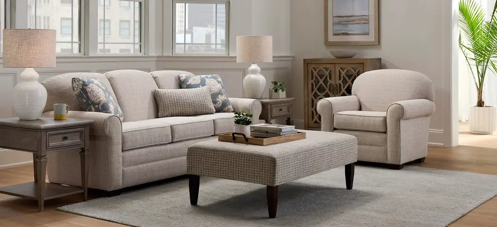 The Petunia cocktail ottoman is ready to bring classic flair and versatile function to your home. With distinctive duotone houndstooth upholstery, tapered legs, and ample surface for serving or extra seating, it complements the Petunia living room collection and makes a timeless statement on its own.