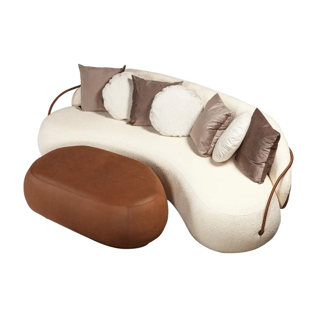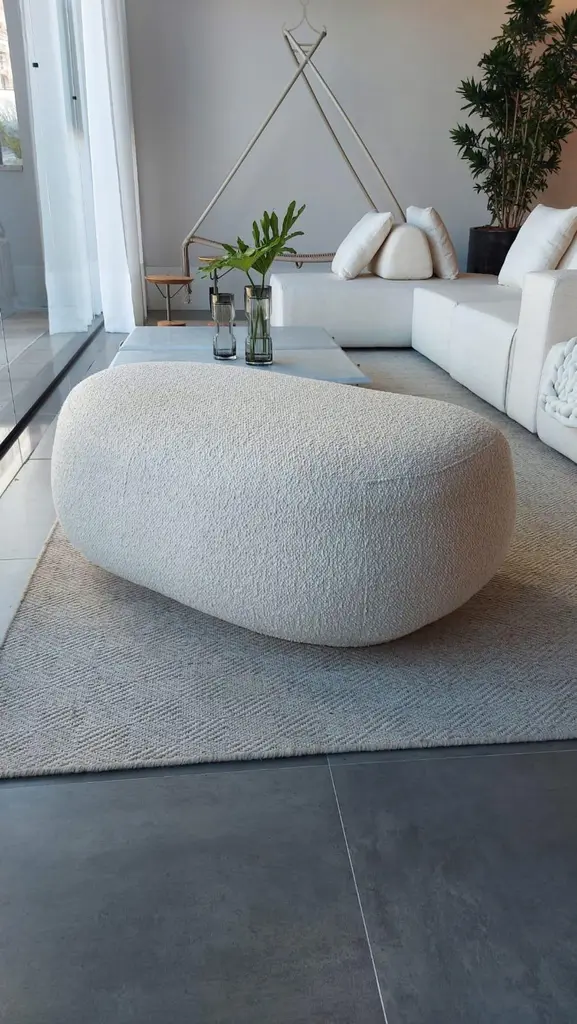 From Italian: StoneThe designer Marta Manente is of Italian descent, her great-grandparents migrated from Italy over 100 years ago and lived in the region of Bento Gonçalves – Brazil on the mountains that surround the Rio das Antas. The river that made the initial profession of the family of wooden log rafts, transporting wood in times of river floods to various places in the state. The river is memorable in stories told by his father who was a carpenter, and is currently the family's resting place. Where the stones at the bottom of the river were cut by the movement of the waters, the setting for this century-old story, which lives to this day between pebbles and cold water, full of good energies.The Pietra ottoman is designed with pure, organic shapes. Covered with a comfortable fabrics, off-white boucle or a polyester with a “natural skin” in coffee color. The Pietra Ottoman can be used separately in the decoration, or fitting in front of the Pietra sofa. (see the suggestive image)The rounded shape of the ottoman fits the front of the curved sofa, increasing depth for better comfort. (see Pietra Couch).The piece's by Pietra Collection are sold separately (couch, armchair, pouf and pillows) - this reference is only for the ottoman (The image is only suggestive).