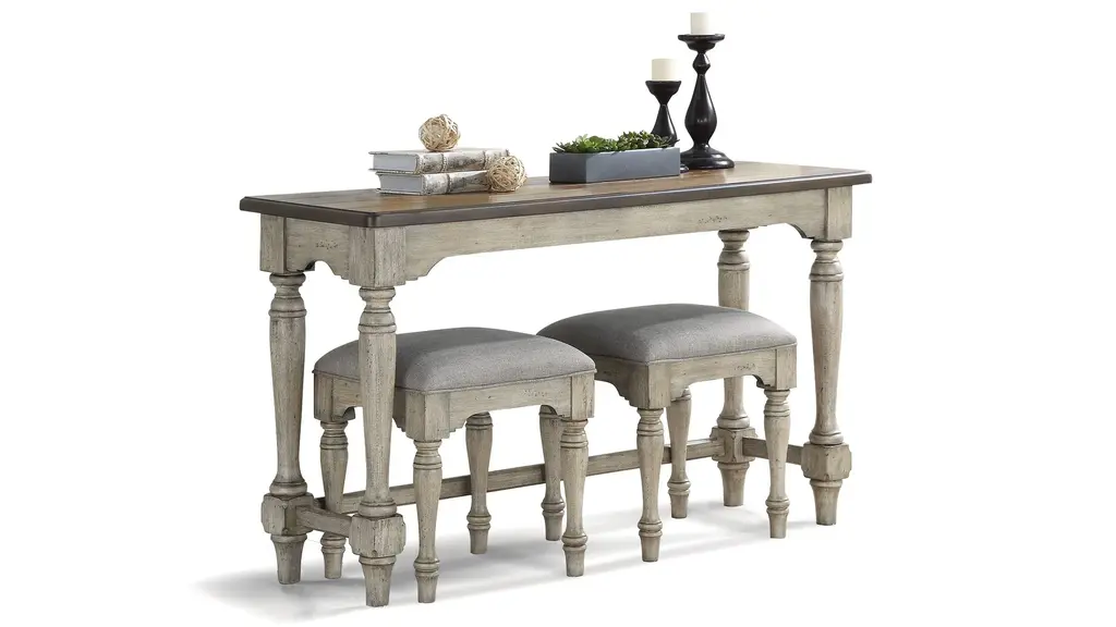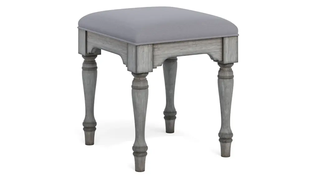Comfortably prop up your feet in cottage-inspired style with the Plymouth Ottoman. Featuring a distressed graywash finish and turned legs for a charming vintage look, this ottoman is upholstered in a soft, easy-to-clean coordinating fabricmaking it ideal to use for impromptu seating when needed. Conveniently store the ottoman under the coordinating Plymouth sofa table when not in use.