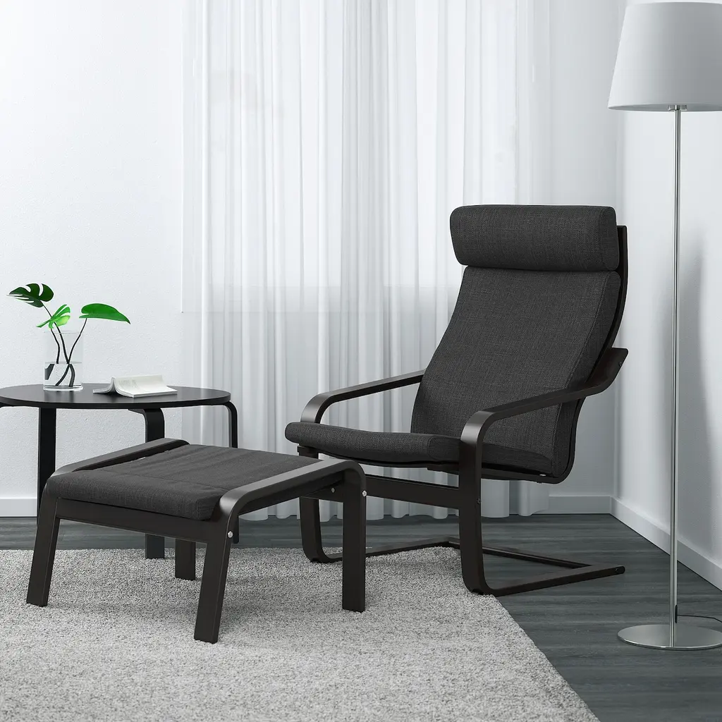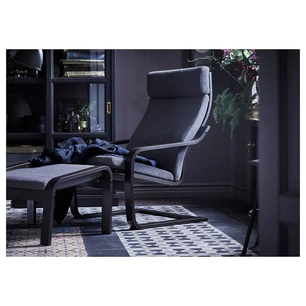 POÄNG Ottoman - black-brown/Hillared anthracite. A variety of seat cushion designs makes it easy to change the look of your POÄNG chair and your living room. The frame is made of layer-glued bent beech which is a very strong and durable material.