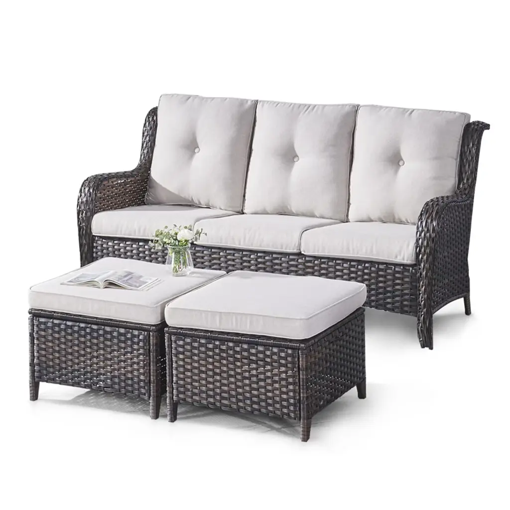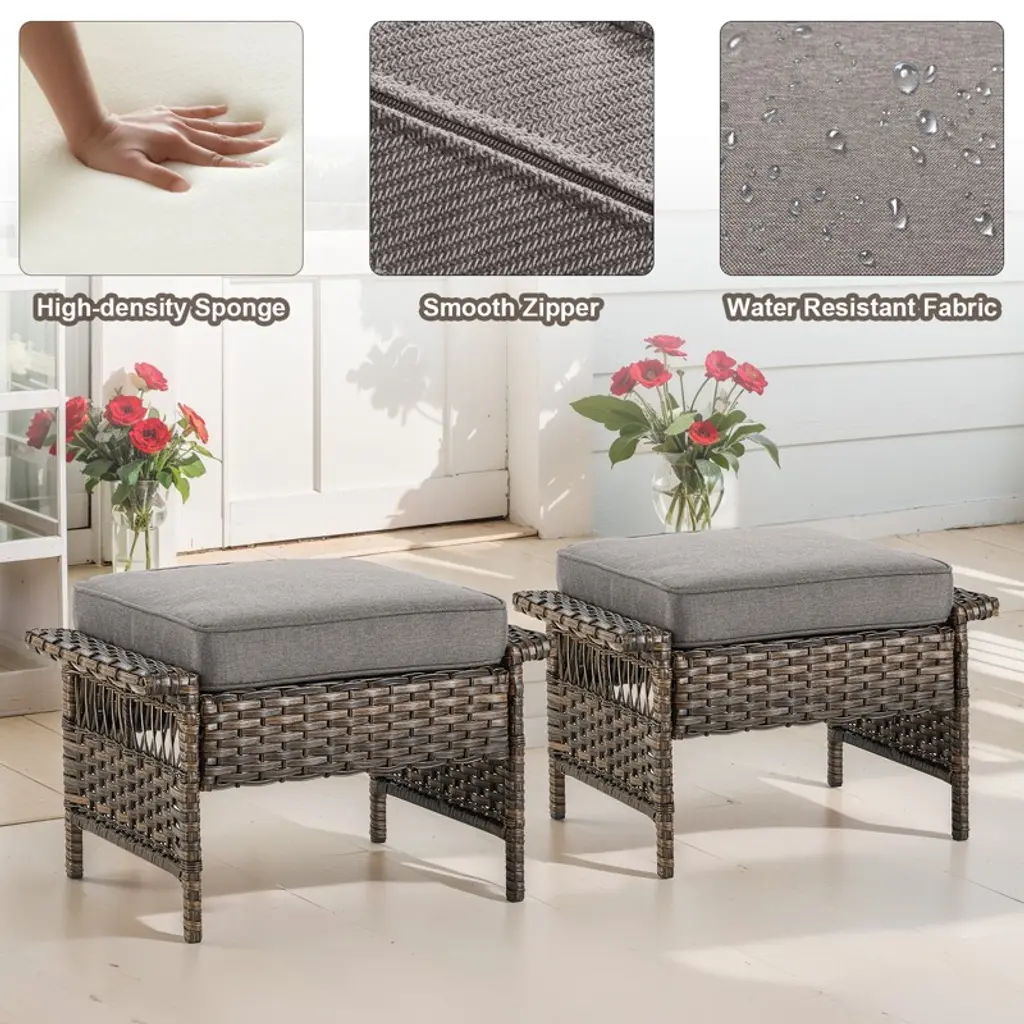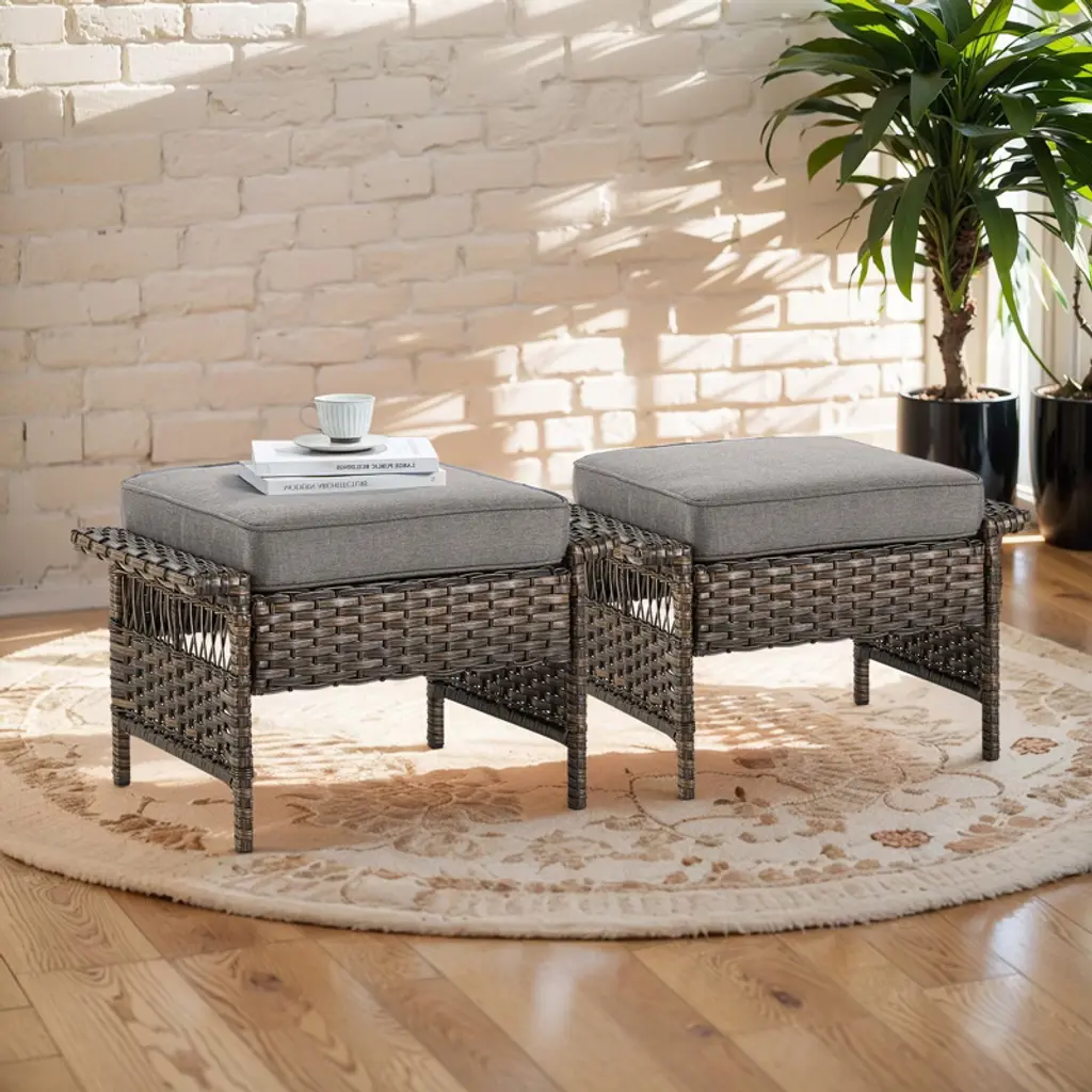 This versatile ottoman effortlessly adapts to your outdoor living needs, serving multiple purposes with stylish functionality. Its thick, plush cushioning provides exceptional comfort as a footrest when paired with chairs, while two combined units instantly transform into a practical coffee table perfect for holding drinks, books, or snacks. When placed beside seating, it functions as a convenient side table for beverages or decor, and when extra guests arrive, it readily converts into sturdy additional seating. Built to last with a robust 250-pound weight capacity, this multi-functional piece combines comfort, utility and durability for all your outdoor relaxation and entertainment needs.