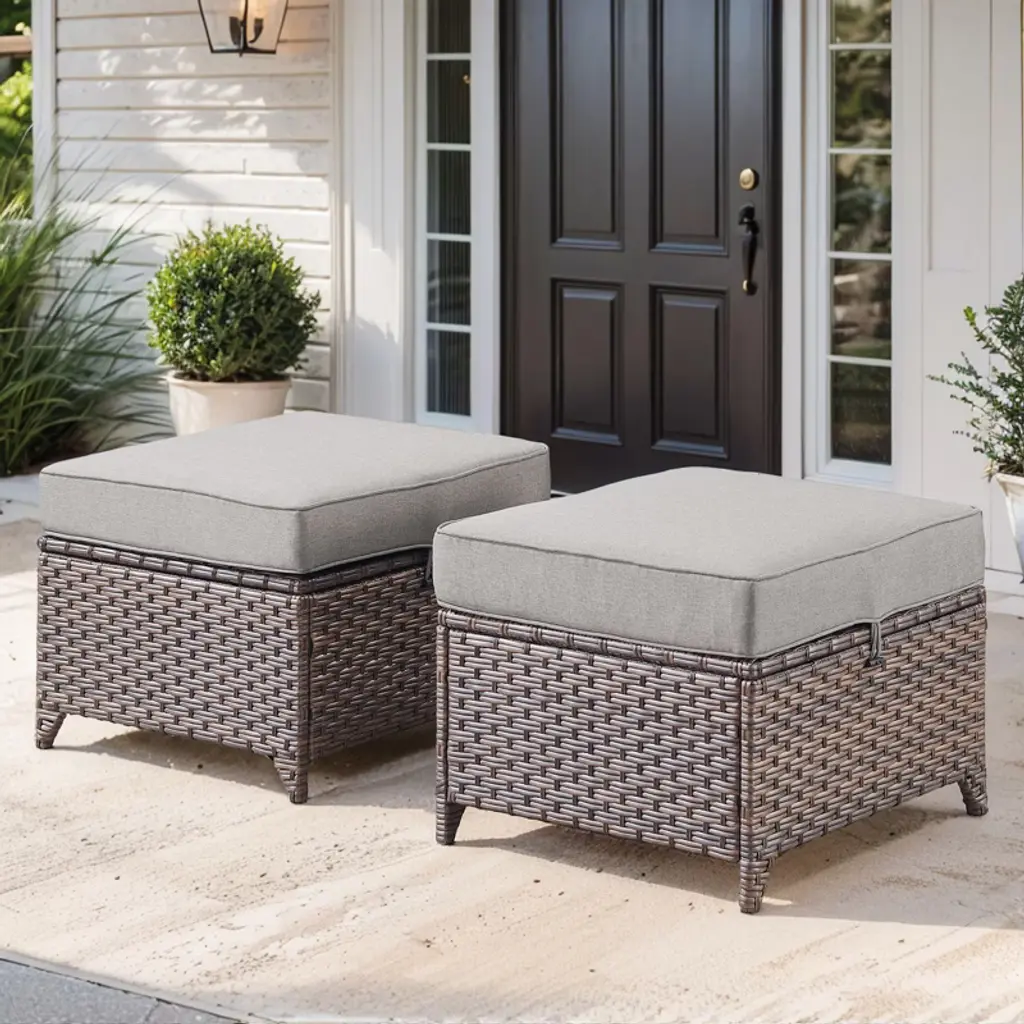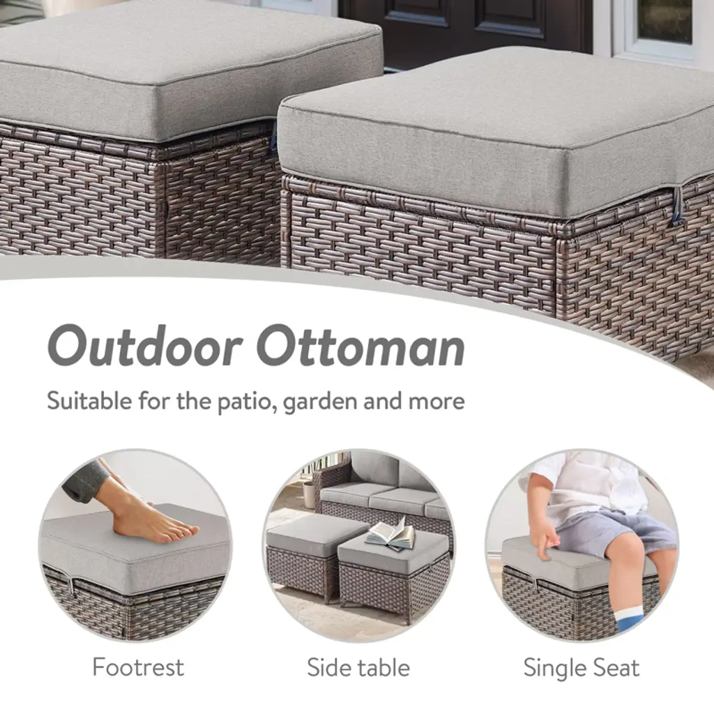 This two-piece comfortable outdoor wicker ottoman set will be the perfect addition to your patio wicker furniture for your outdoor needs. It is made of high quality PE wicker wrapped around a sturdy steel frame for weather resistance and durability. The delicate brown wicker is paired with soft, thick cushions to create a neutral and elegant tone that is understated and lightweight, complementing any d"|cor.The maximum weight capacity of 250lbs makes it versatile and can be used as a spare seat, a side table, or in combination with other wicker furniture for optimal use. This set is a great accent to any space in which you can enjoy and relax with family or friends.
