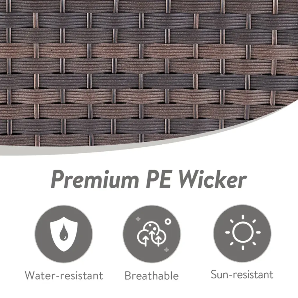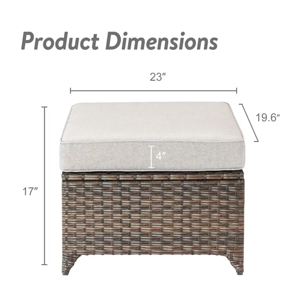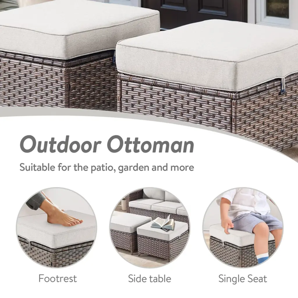 This two-piece comfortable outdoor wicker ottoman set will be the perfect addition to your patio wicker furniture for your outdoor needs. It is made of high quality PE wicker wrapped around a sturdy steel frame for weather resistance and durability. The delicate brown wicker is paired with soft, thick cushions to create a neutral and elegant tone that is understated and lightweight, complementing any d"|cor.The maximum weight capacity of 250lbs makes it versatile and can be used as a spare seat, a side table, or in combination with other wicker furniture for optimal use. This set is a great accent to any space in which you can enjoy and relax with family or friends.