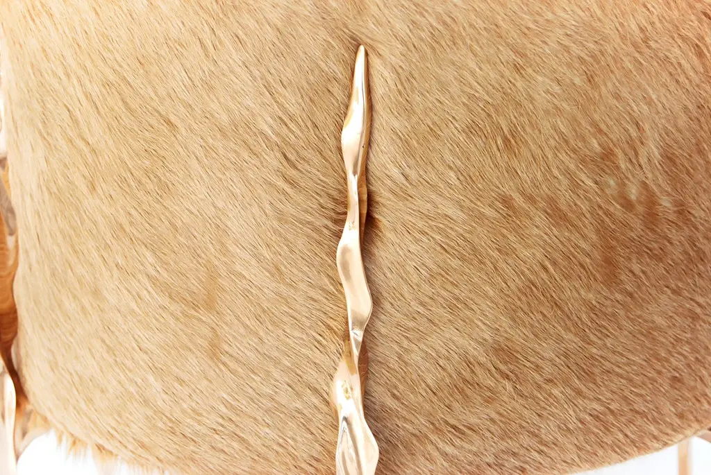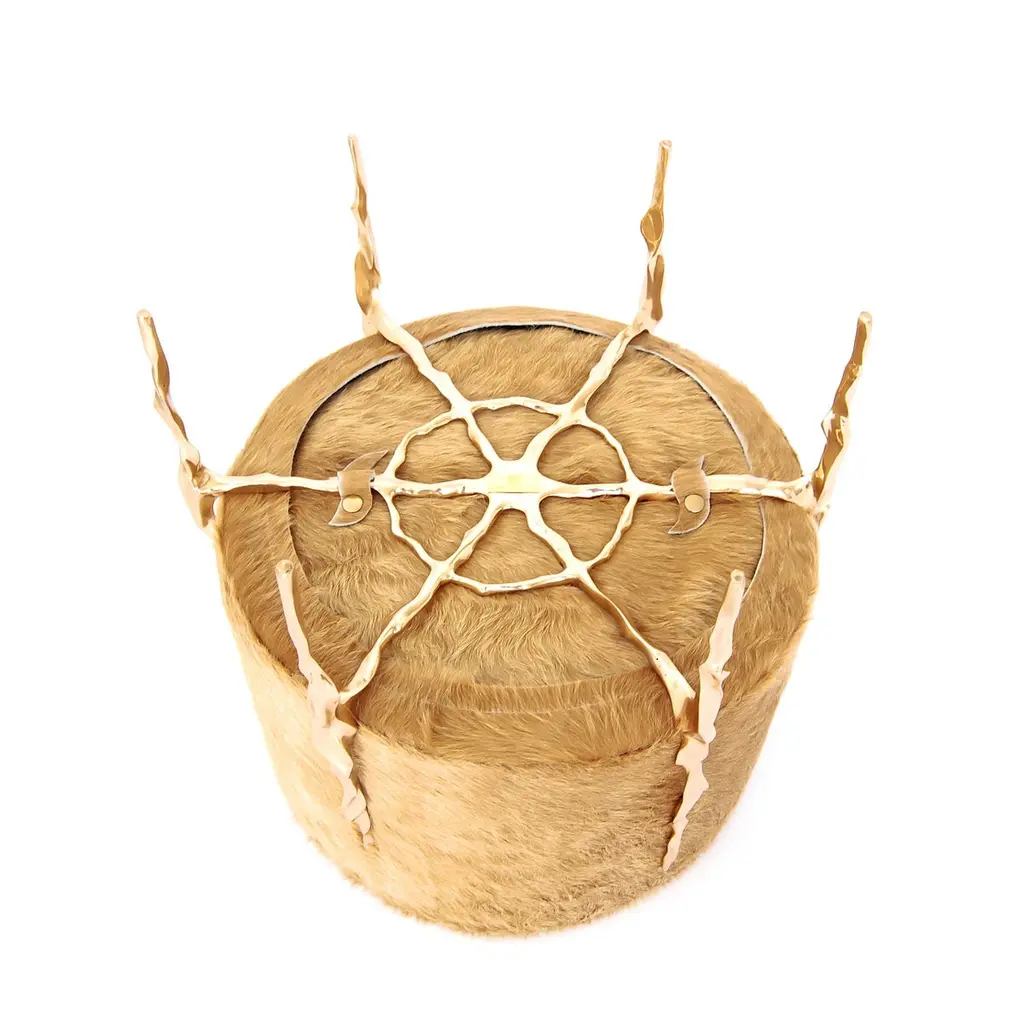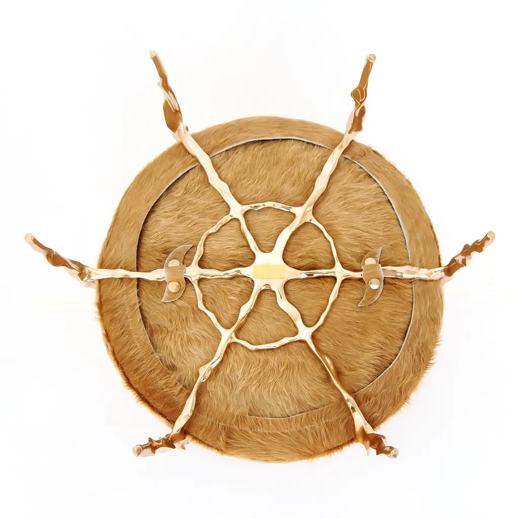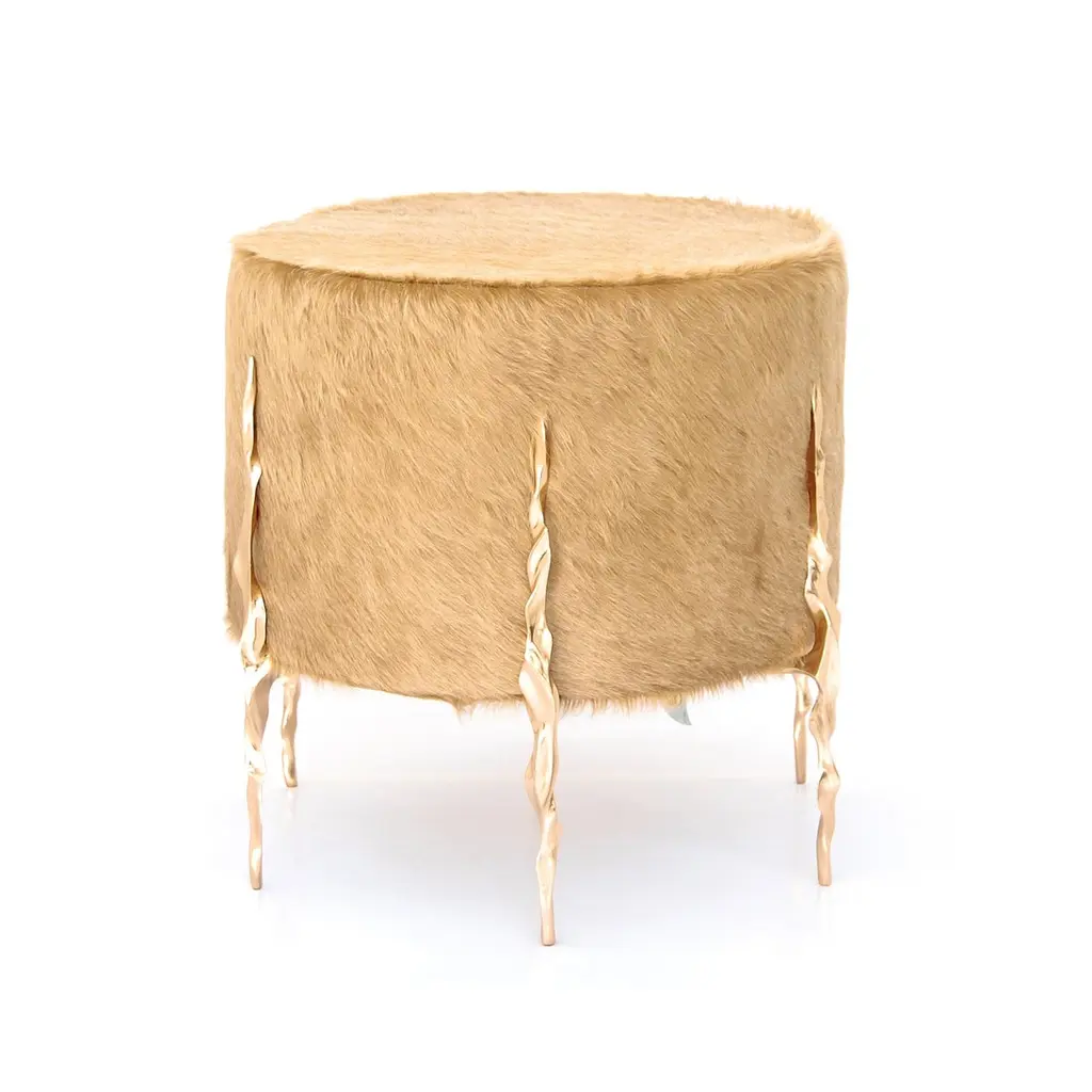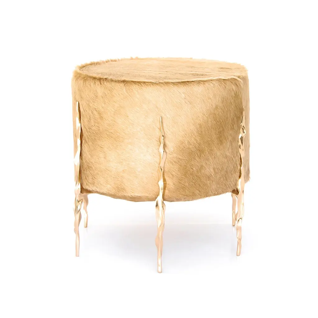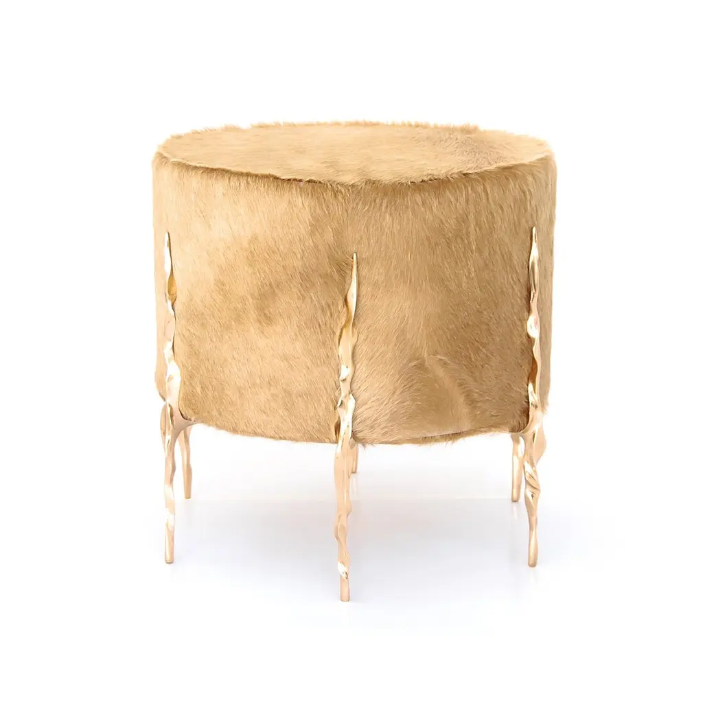 Polished bronze ottoman by Fakasaka Design.Dimensions: W 45 cm, D 45 cm, H 45 cm.Materials: polished bronze, leather. FAKASAKA is a design company focused on production of high-end furniture, lighting, decorative objects, jewels, and accessories. Established in 2007, Fakasaka is the eponymous design company by Brazilian artist Fernando Akasaka distinguished by a penchant for producing intricate detailed cast bronze collectible design objects, furniture and jewelries. Fakasaka explores the contrast between the manmade and the natural through shapes and finishes that create a clear aesthetic. The constant challenge to balance elements is met with an outcome that is a striking assortment of bronze furniture and objects in oxidised and polished finishes, accented with precious regional stones, granites and rich prehistoric reptilian motifs.
