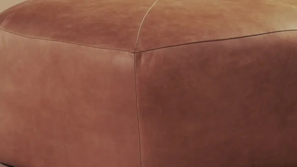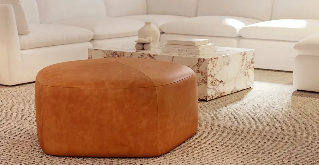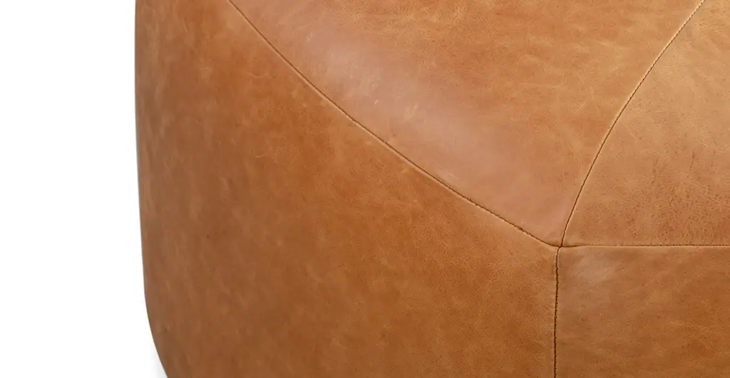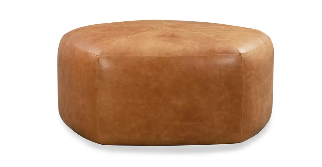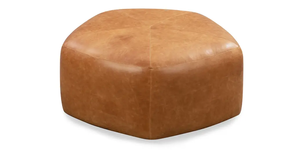 From every angle, this versatile ottoman is designed to delight the informed eye. Its unique pentagon profile offers a comfy accompaniment for your sofa, easy chair or as an accent table when layered with a chic serving tray. Its rubberwood frame is corner blocked for sturdiness, forming the foundation for its feather down blend surface topper. Its buttery Italian tanned leather upholstery is pure-aniline dyed in the cognac tan color to accentuate the hide’s natural scuffs, scratches and textures, which help it patina nicely. Exquisite star-like stitching brings out the geometric genius of this stylish footrest.