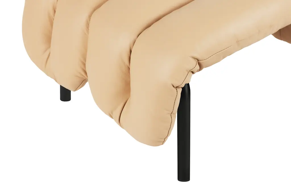 The detachable upholstery of the Puffy Lounge Chair is fat and plump, its generous shape spills freely over the sides of a tubular steel frame which, in stark contrast, is hard-lined and strong. The two key elements of this seating design by Faye Toogood are in purposeful and playful juxtaposition. The elementary frame is inspired by the rational structure of classic modernist design, whilst the extravagant quilt-like upholstery warmly embraces and envelopes, is comforting and reassuring. The Puffy Chair frame is available in powder-coated or sand-blasted steel finishes and a choice of thick canvas, chunky bouclé or luxurious leather upholstery.