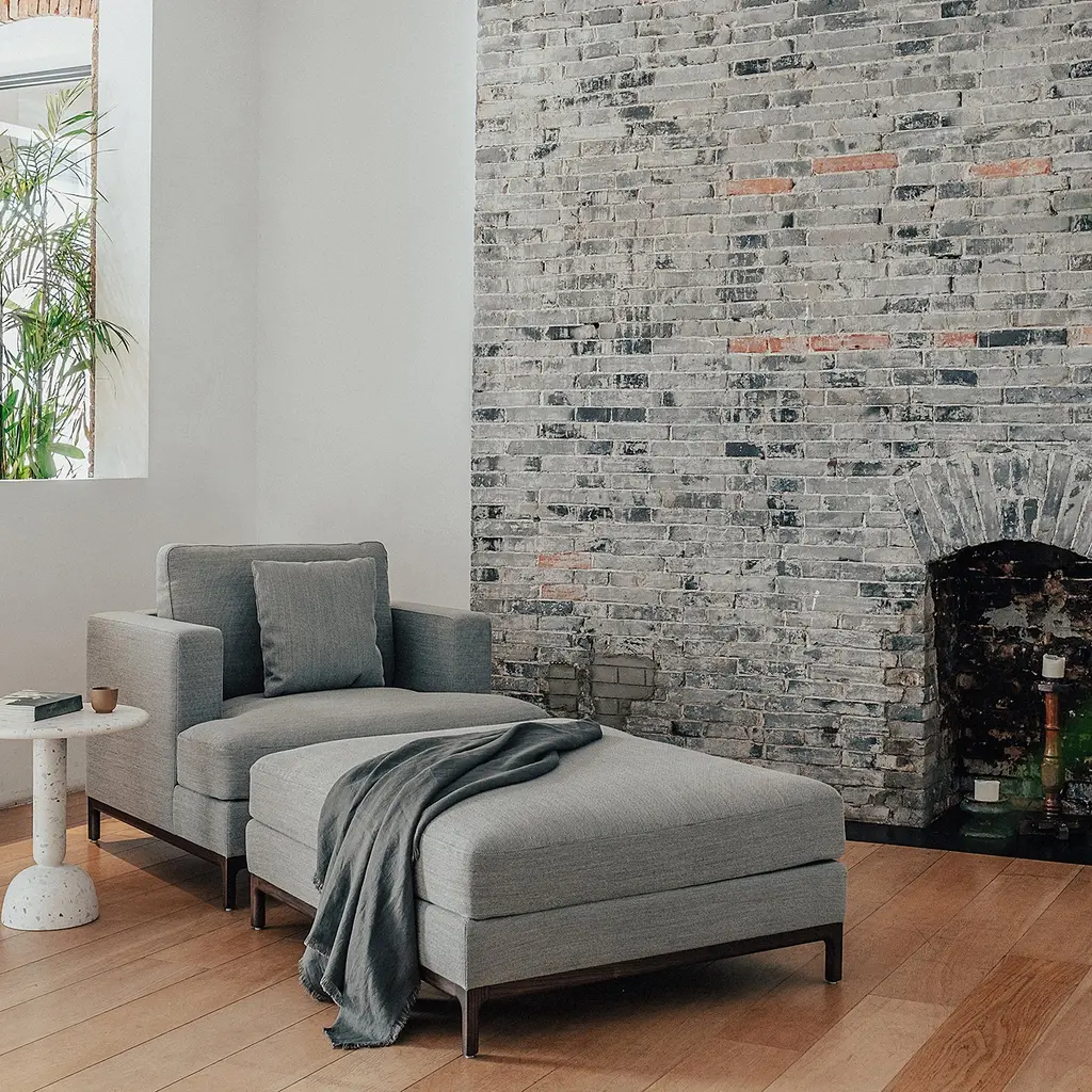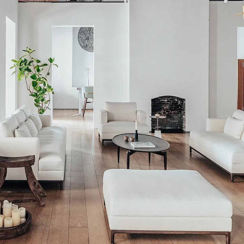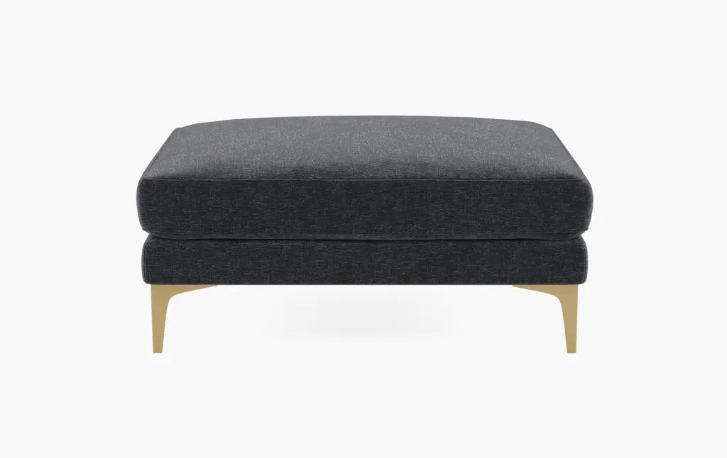 This low-profile ottoman features a cushioned top supported by a solid wood base, offered in oak or walnut finishes. Upholstered in fabric or leather, it complements the broader seating collection and serves as a versatile companion piece.