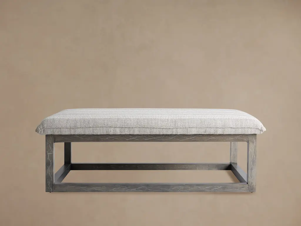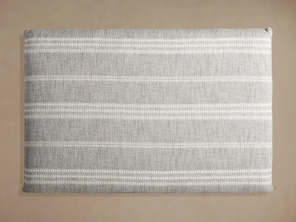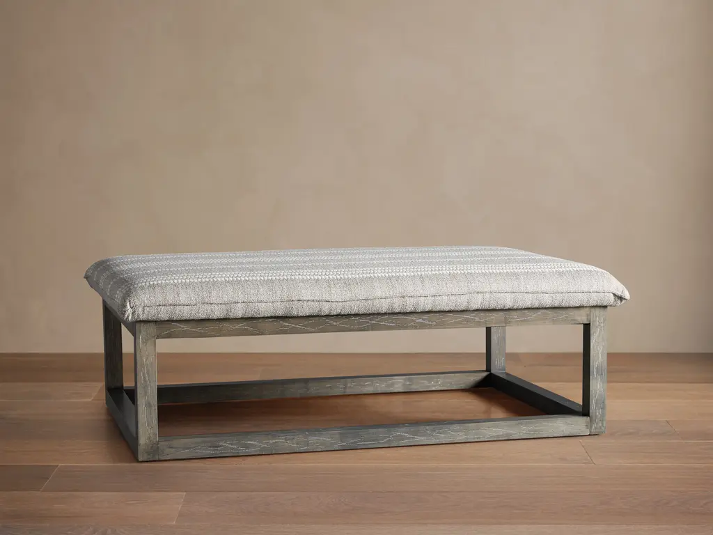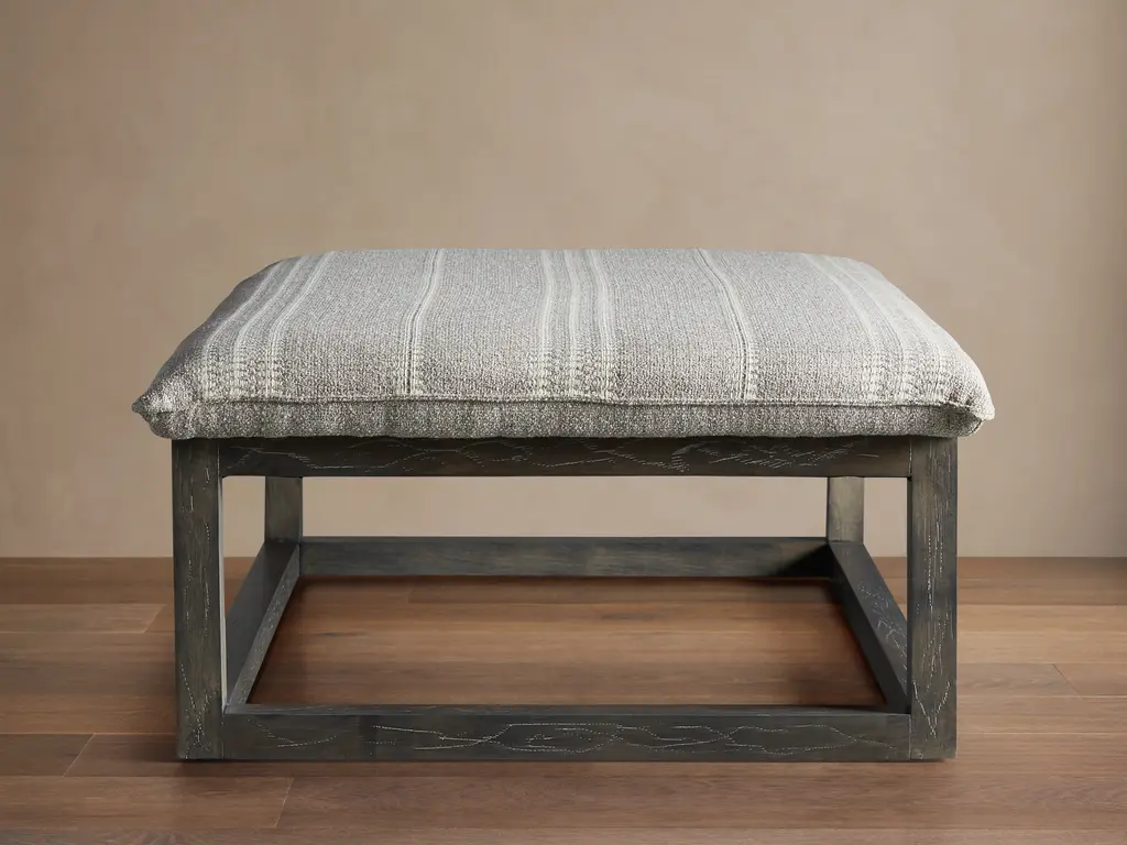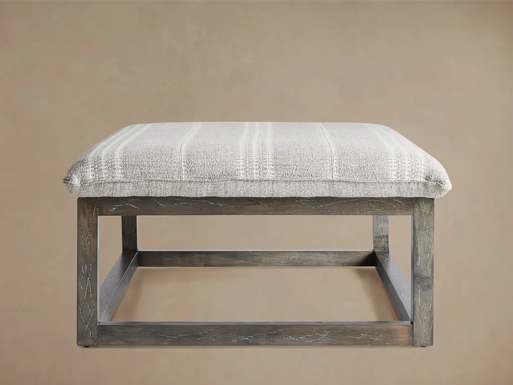 Built with craftsmanship, our Ranch ottoman provides a functional surface as well as a supportive place to rest your feet. Upholstery artisans construct each frame from solid, reinforced hardwood for lasting strength and stability. Expertly upholstered cushions are fitted with cozy, rug-inspired fabric that showcases versatile grey and cream tones. And, eco-friendly foam padding made from sustainable, plant-based materials provides a relaxing, plush surface.