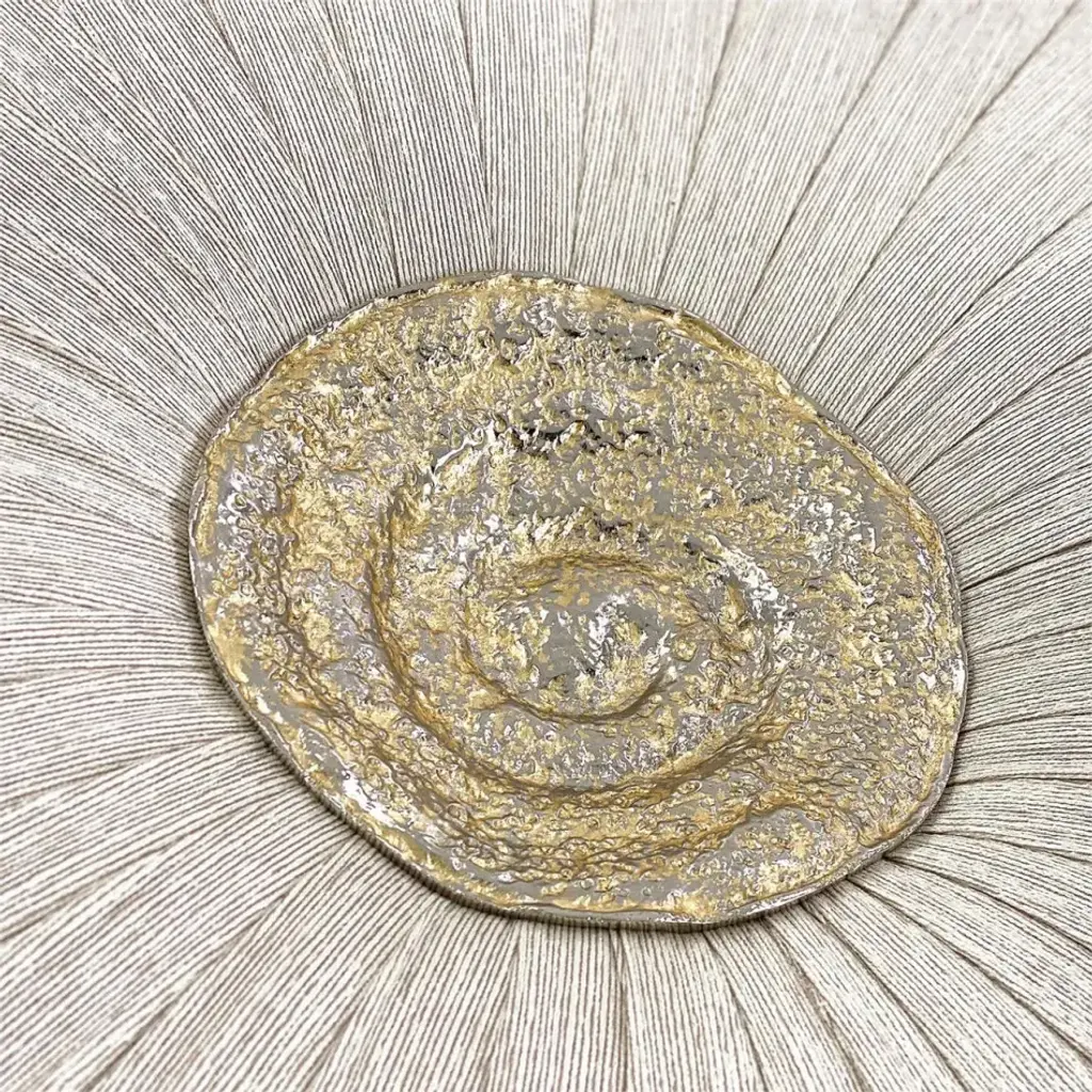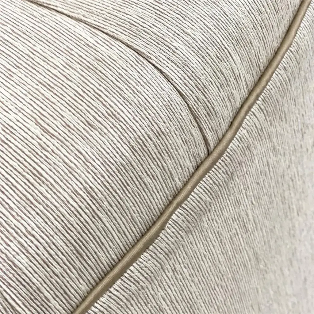 This round ottoman is fully upholstered in a pearl fabric. The center features an accent handle in a sheer champagne finish.