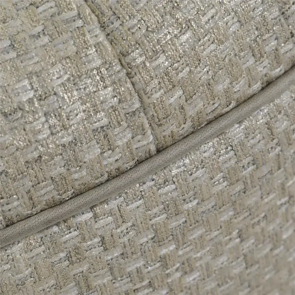 Rendino Small Ottoman shown in 2228 fabric. A round, fully upholstered ottoman features a center accent handle in a sheer champagne finish.