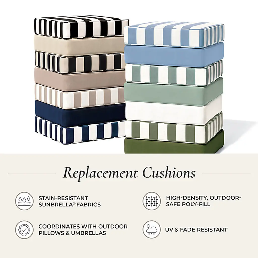 With our Outdoor Replacement Cushions, you can give your furniture – and your look – an instant makeover. Made with the finest techniques and materials, these rugged, all-weather cushions have zippers for easy cleaning, and will stay looking great on your patio or porch year after year. Replacement Cushion Cover features: