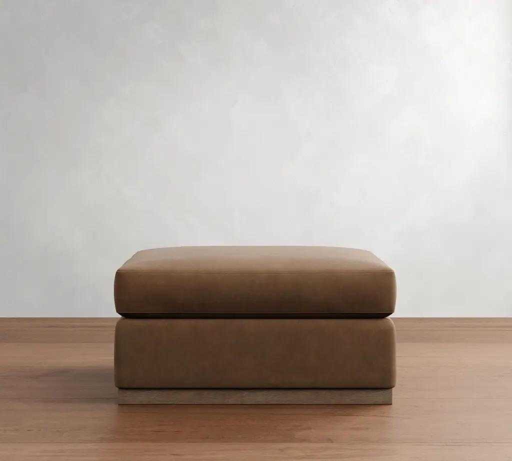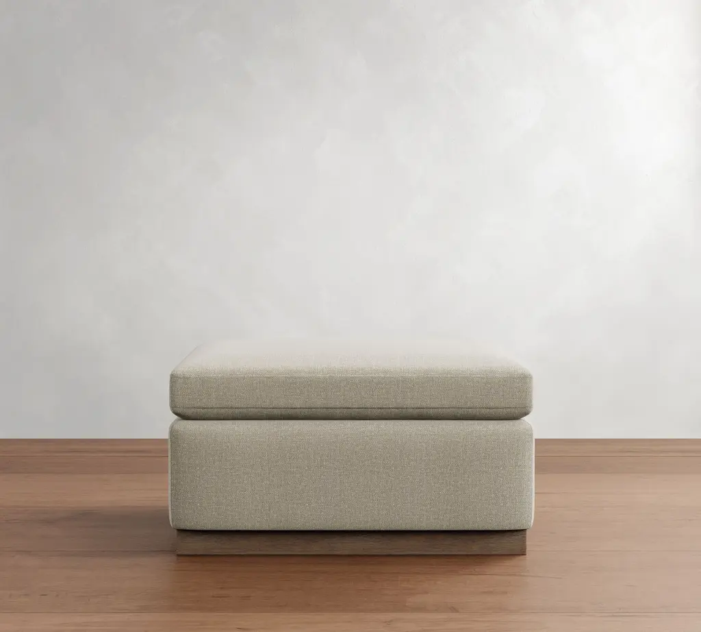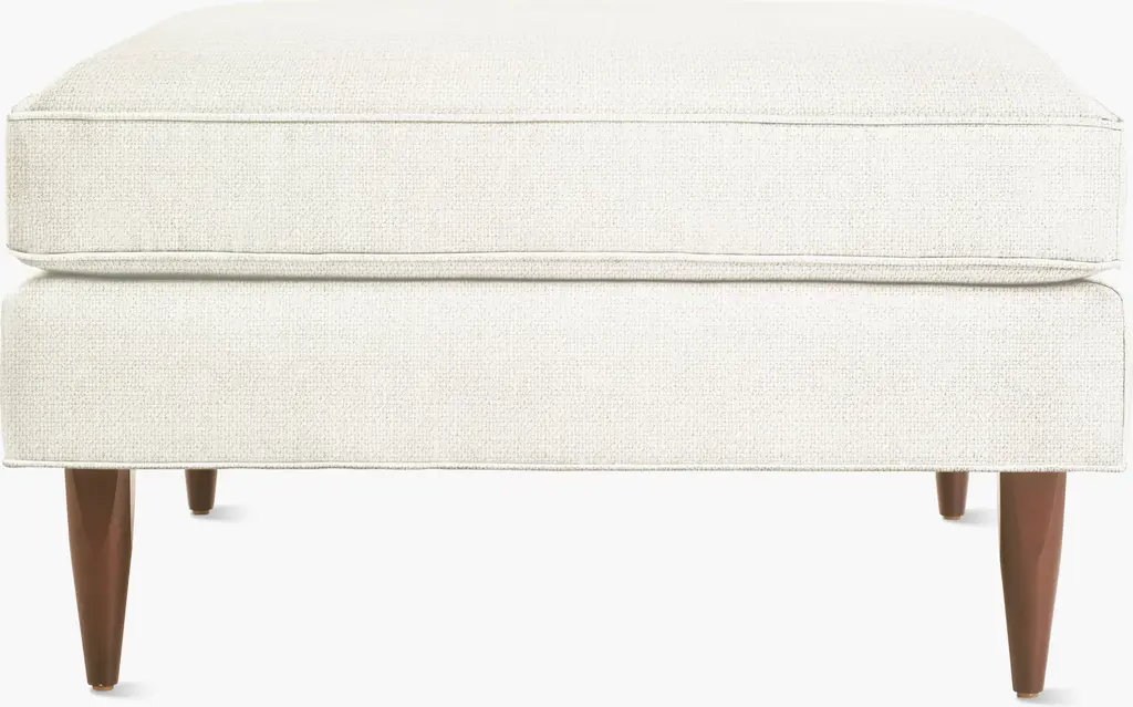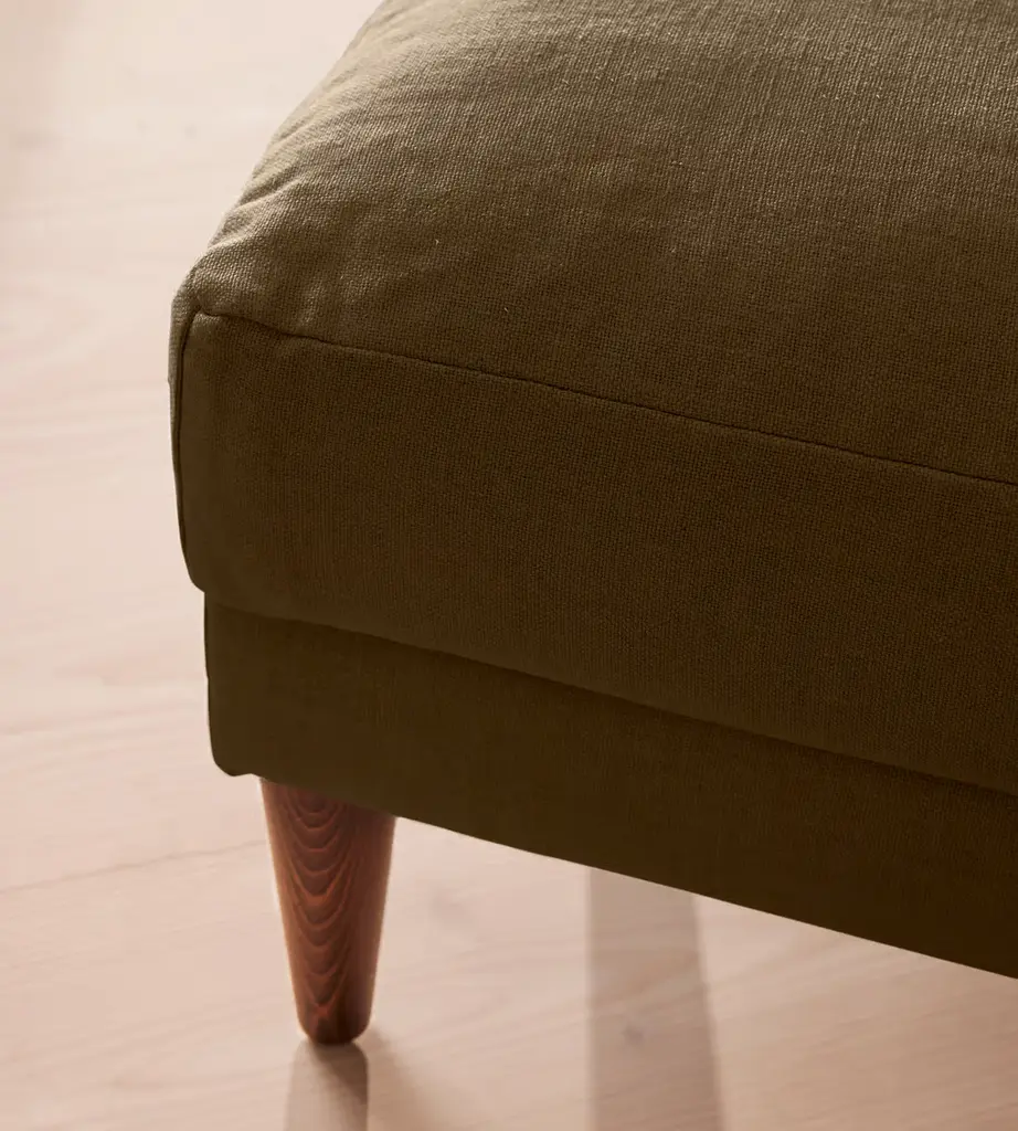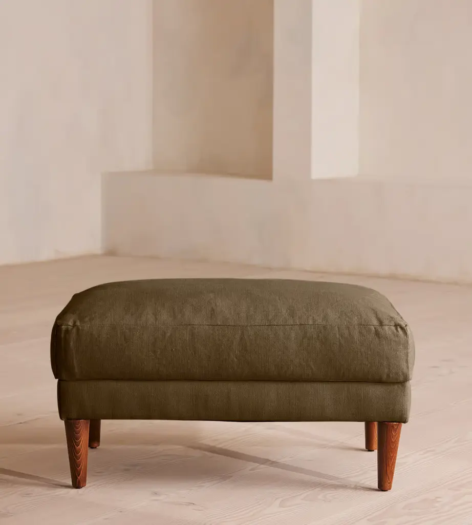 Handcrafted in North Carolina, our Reya ottoman is ideal for putting your feet up and relaxing. Inspired by the furniture at DUMBO House, Brooklyn, the foam cushioned profile is upholstered in linen with turned walnut legs. Use as an extra seat for guests, or as a footstool to create a cosy reading nook as we do in the Houses.