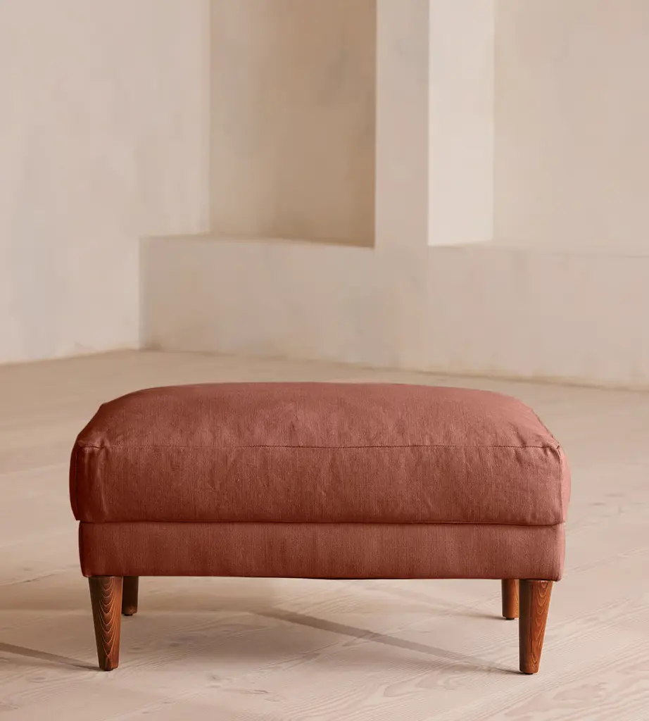 Handcrafted in North Carolina, our Reya ottoman is ideal for putting your feet up and relaxing. Inspired by the furniture at DUMBO House, Brooklyn, the foam cushioned profile is upholstered in linen with turned walnut legs. Use as an extra seat for guests, or as a footstool to create a cosy reading nook as we do in the Houses.