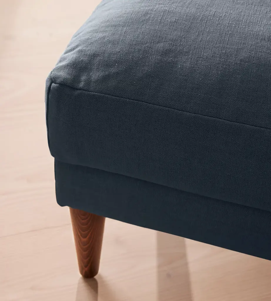 Handcrafted in North Carolina, our Reya ottoman is ideal for putting your feet up and relaxing. Inspired by the furniture at DUMBO House, Brooklyn, the foam cushioned profile is upholstered in linen with turned walnut legs. Use as an extra seat for guests, or as a footstool to create a cosy reading nook as we do in the Houses.