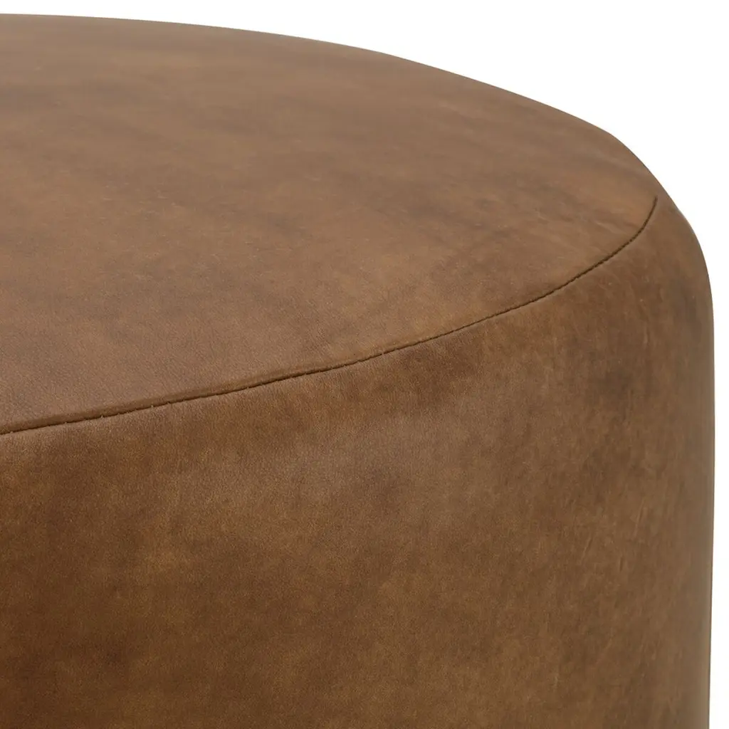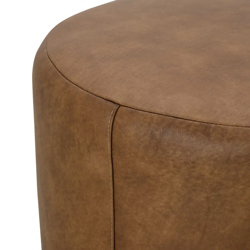 The ultimate accent ottoman, the Rhodes Leather Large Round Ottoman adds a touch of accessible elegance to any living space. Perfectly scaled for bunching and impromptu gatherings around a cocktail table, this generously-sized piece is equally useful for seating or as an extra spot to place a drink or snack, especially with the addition of a tray. The feel of the leather is luxurious, making it a sophisticated and practical addition to your home.