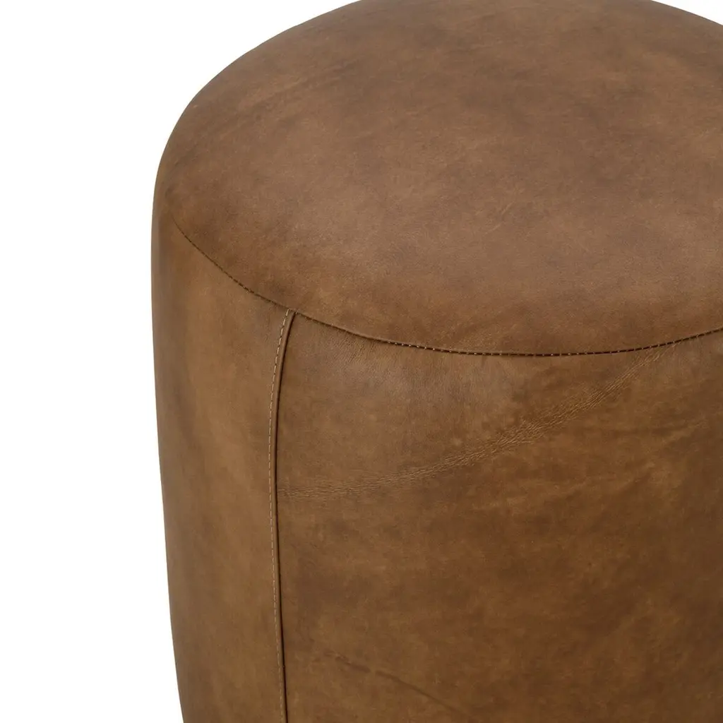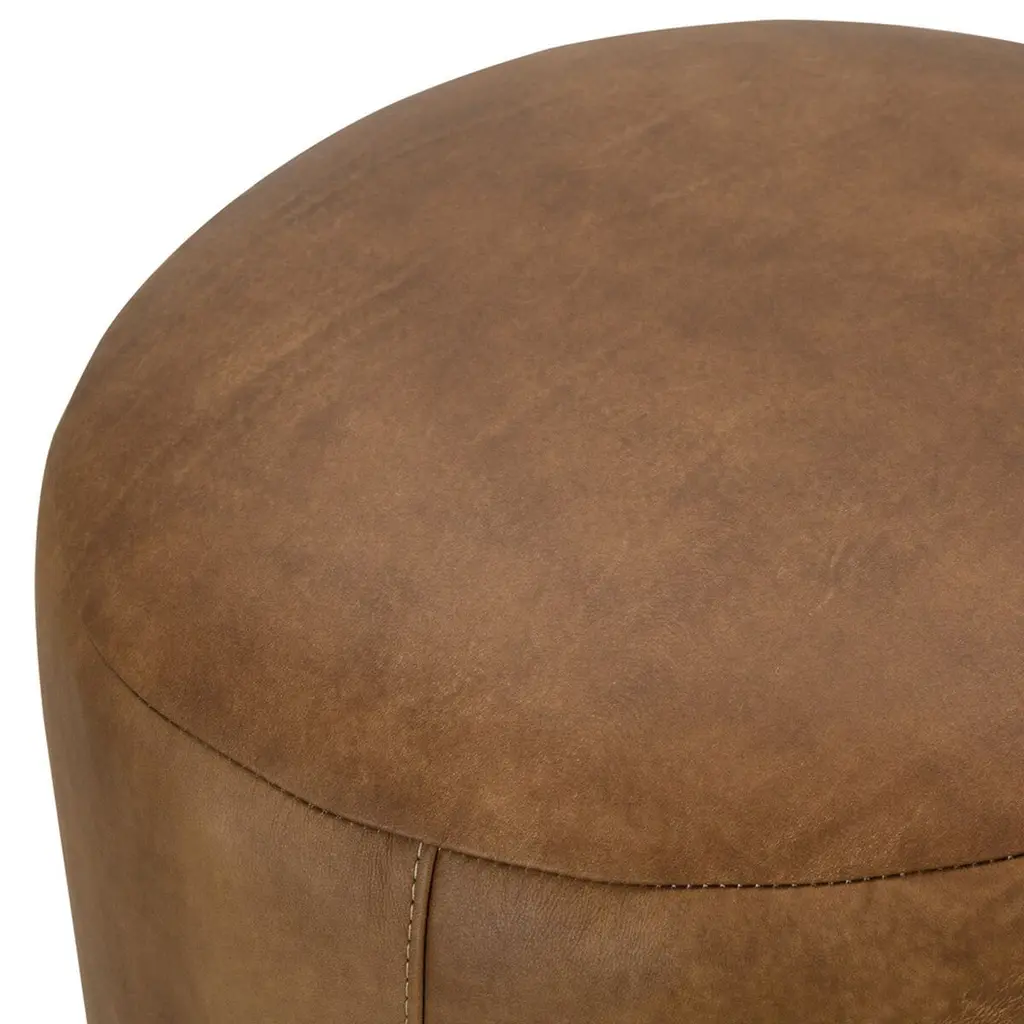 The ultimate accent ottoman, the Rhodes Leather Round Ottoman is perfectly scaled for bunching and impromptu gatherings around a cocktail table. This ottoman adds a touch of accessible elegance to any living space, with the feel of luxurious leather enhancing its sophisticated charm.