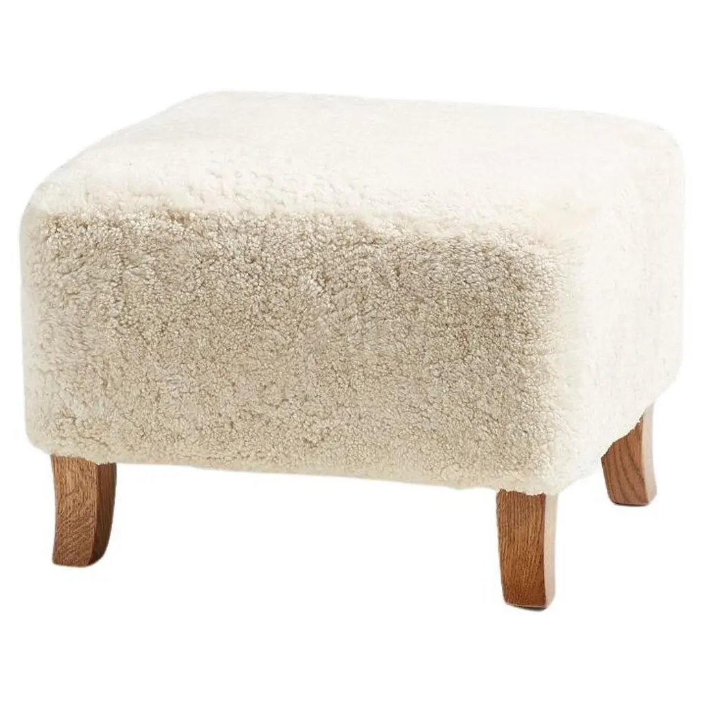 Place this round ottoman just about anywhere for a subtle retro vibe. Upholstered in a faux Mongolian shearling with a high pile of fur. Parawood legs are wire-brushed for a warm vintage feel.