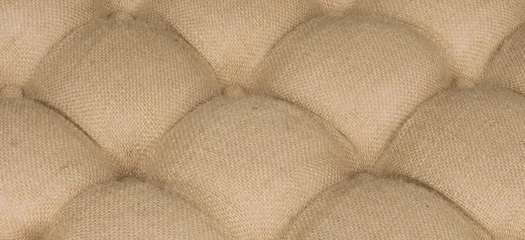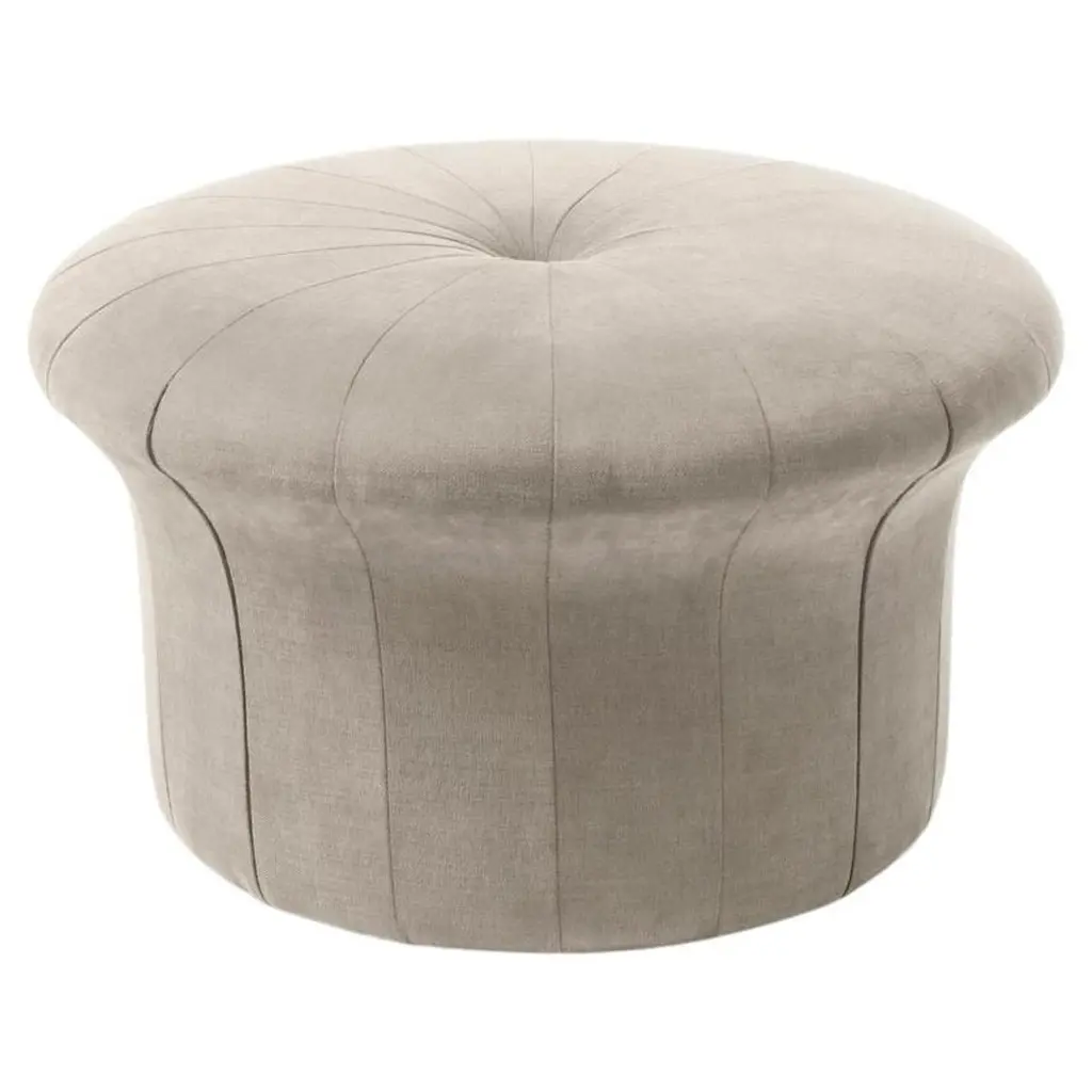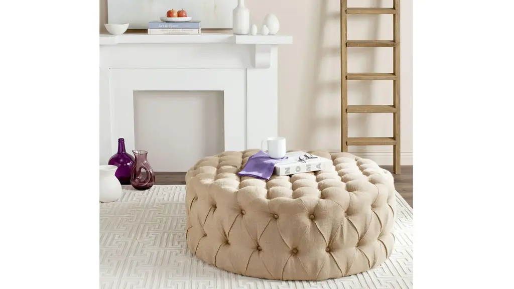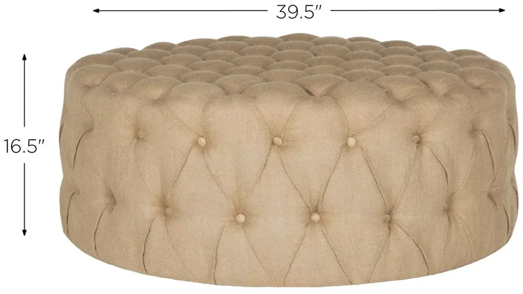 Brimming with sophistication, the elegant Roitfeld Ottoman recalls the 1930s Hollywood glamour with its textural beige jute fabric button tufted on all sides. The oversized round shape and foam fill create a wonderful surface for use as a coffee table or extra seating.