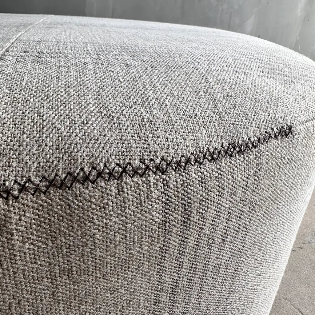 Gio 36" Round Ottoman Introducing the GIO Round Linen Ottoman, crafted from heavy weight linen in a natural color with a coco brown ticking stripe. Made from luxurious 18oz linen for a soft touch, this ottoman showcases a hand-stitched x pattern along the top seam. The solid wood constructed frame, combined with foam and cotton padding, ensures durability and comfort. Designed to hold its shape, this versatile piece can also serve as a chic cocktail ottoman. The intentionally off-center stripes add a modern touch, elevating the overall design to a new level of sophistication. Size: 36" D x 17"H 100% Pure Linen FABRIC: Natural Linen with Dark Brown Ticking style stripes