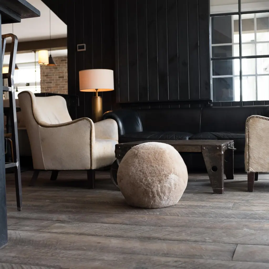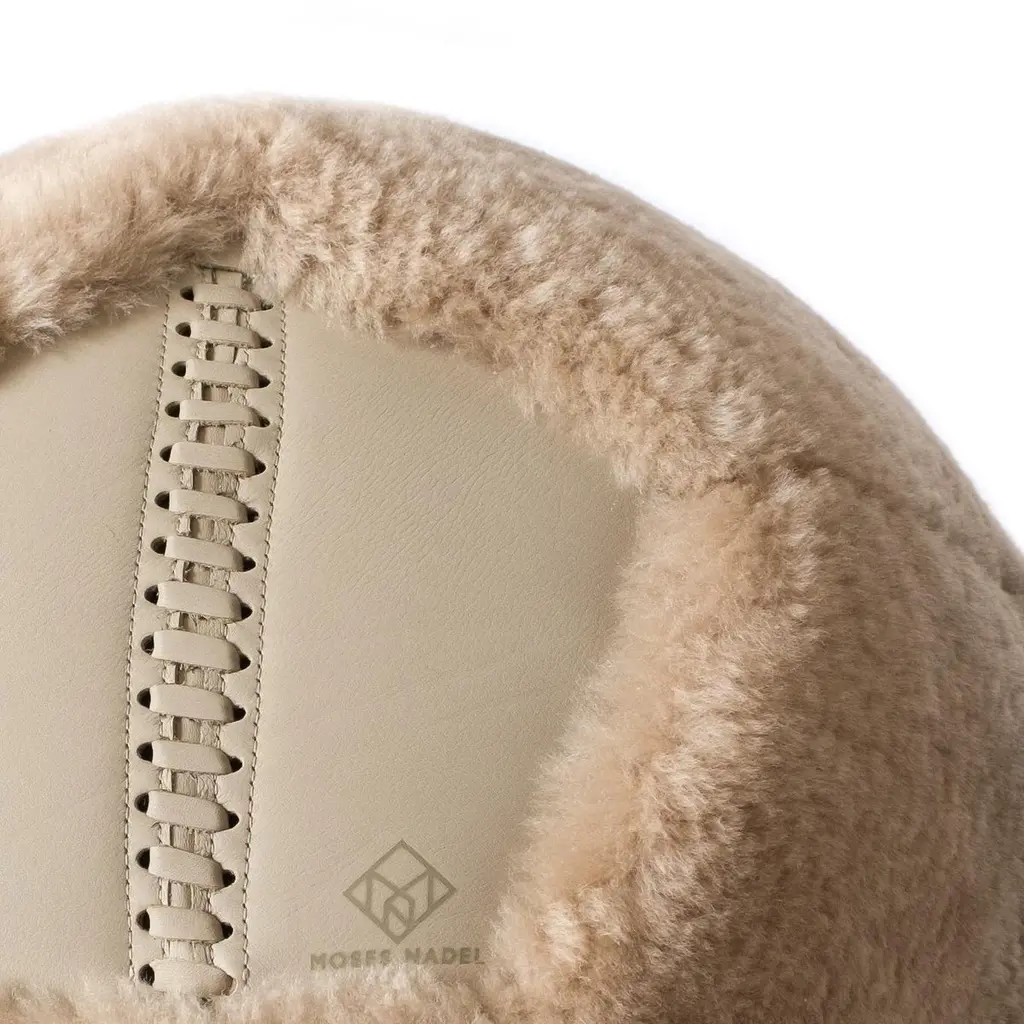 Functionality combined with elegance, the Ottoman X is a versatile piece of sculptural furniture. Cozy and inviting plush wool shearling has a textural hand and a soft feel. Its round shape is functional and playfully engaging. This shearling wool ottoman is commonly used to rest your feet and as alternative seating. Handcrafted and hand-filled with an elongated laced closure detail. Our products are made to order in Long Island, NY.Color: Camel ShearlingDimensions: 14"Ø. Because our products are handcrafted, dimensions may vary slightly. Materials: Shearling, Leather, Foam. This product is made of natural materials.Style no: IOT1502-18-PS22Production time: 6-8 weeks. Rush fee is an additional 25%.