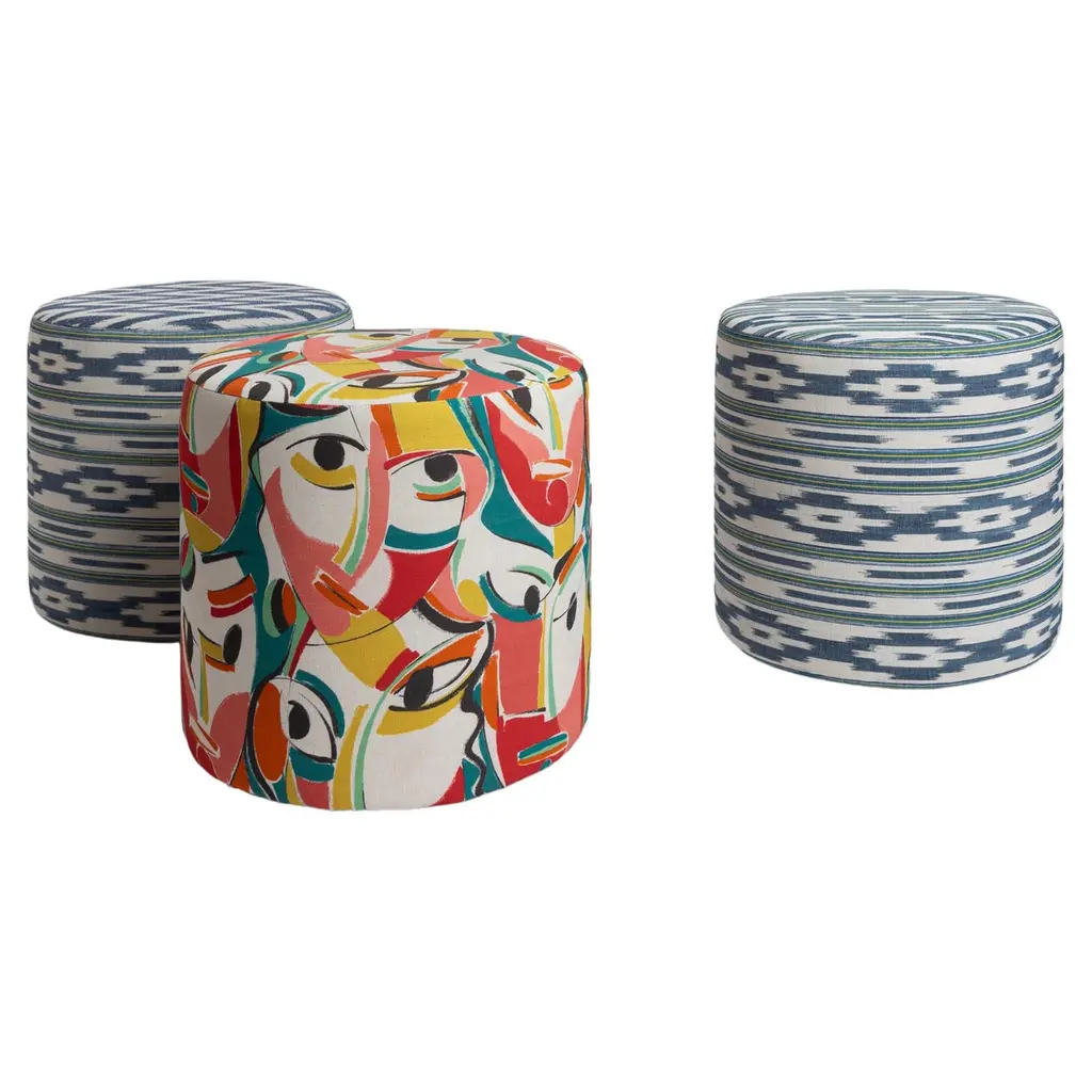 Round Ottoman Seat With Printed Fabric, Blue And Green