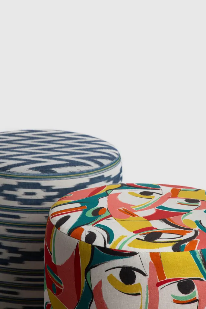 Beautiful round ottoman seat handmade in Mexico City and available in different custom fabrics.This seat was designed to bring a bold element to spaces lacking a pop of color, while keeping it looking and feeling cozy. It can be added to a room in singles or sets of two or three and can double as a foot stool or just a decorative element.In our extreme eye to detail, we like sourcing our fabrics from all around the world, using only interesting prints that catch our eye on trips to countries like India, Philippines and Spain. The seat is crafted in Mexico by mexican artisans and craftsmen.This piece would be the perfect addition to any space in need of a modern and colorful twist.