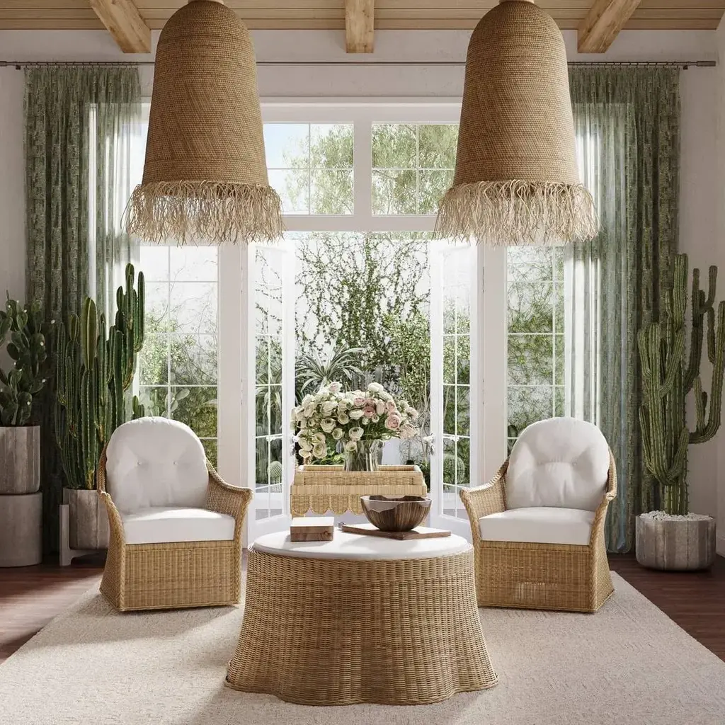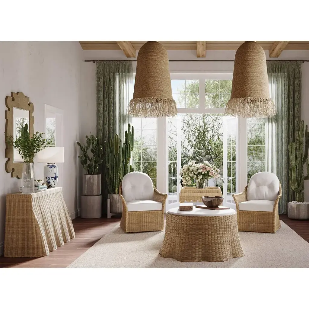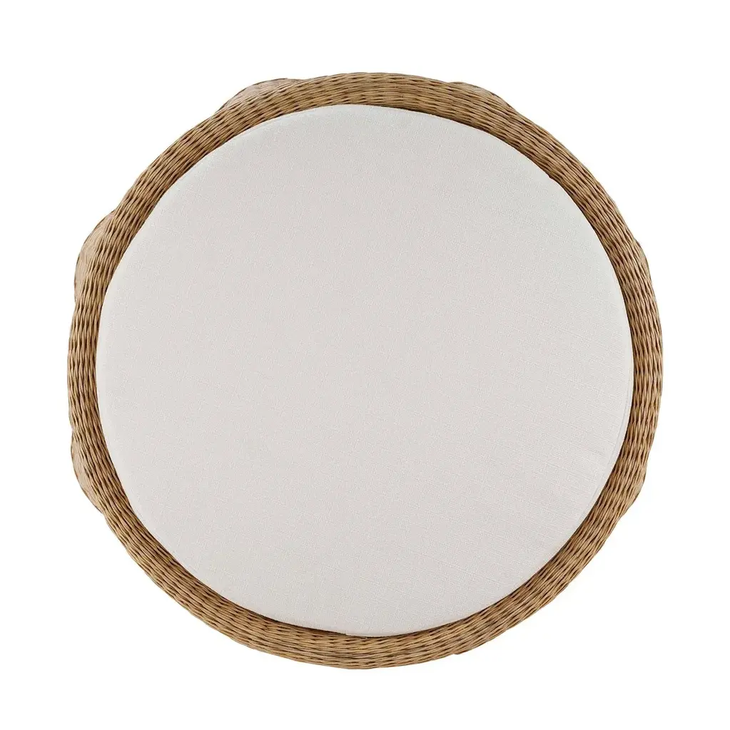 Measuring 41" W x 41" D x 19" H, this stunning piece combines natural beauty with functional design, making it a perfect centerpiece for any room. Crafted with high-quality rattan, this round stool features a charming natural finish that adds a warm and inviting vibe to your decor and has a round arctic white upholstered cushion. The round shape and delicate curves create a sophisticated draped silhouette, making it an eye-catching addition to your living room, sunroom, or patio. Ideal for hosting guests or enjoying a cozy evening at home, this versatile seat seamlessly complements any decor style. Brand new and ready to enhance your space, this piece is the perfect blend of beauty and practicality. Dimensions: 41" W x 41" D x 19" H