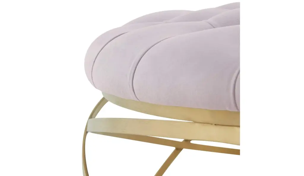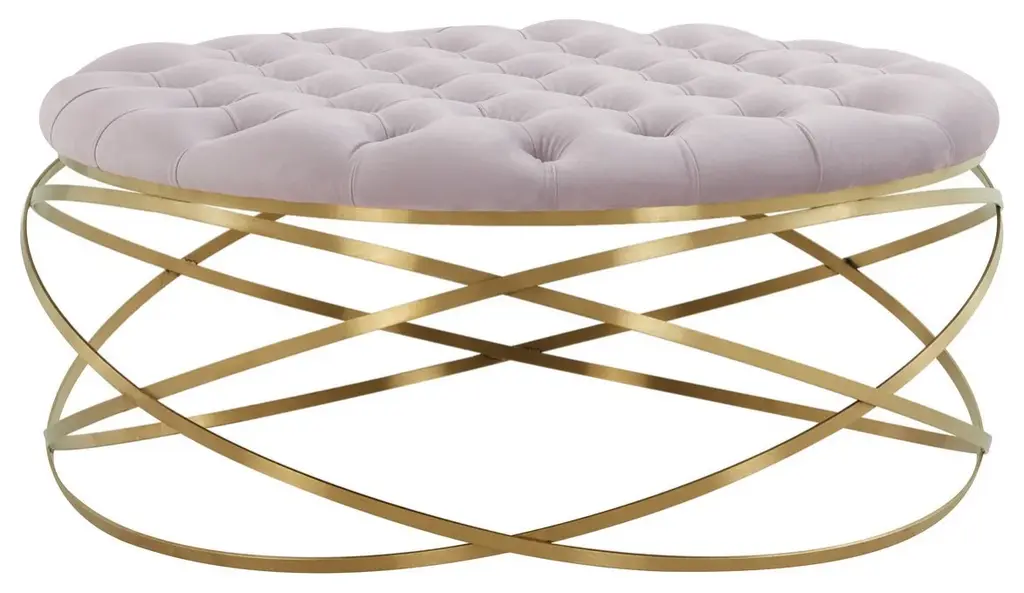 The focal point in any sophisticated interior, this Rumi Ottoman is a masterpiece of metalwork. Rumi's illusionary open frame shines brilliantly in a glimmering gold finish, and plush tufted pale taupe velvet completes the glamorous look.