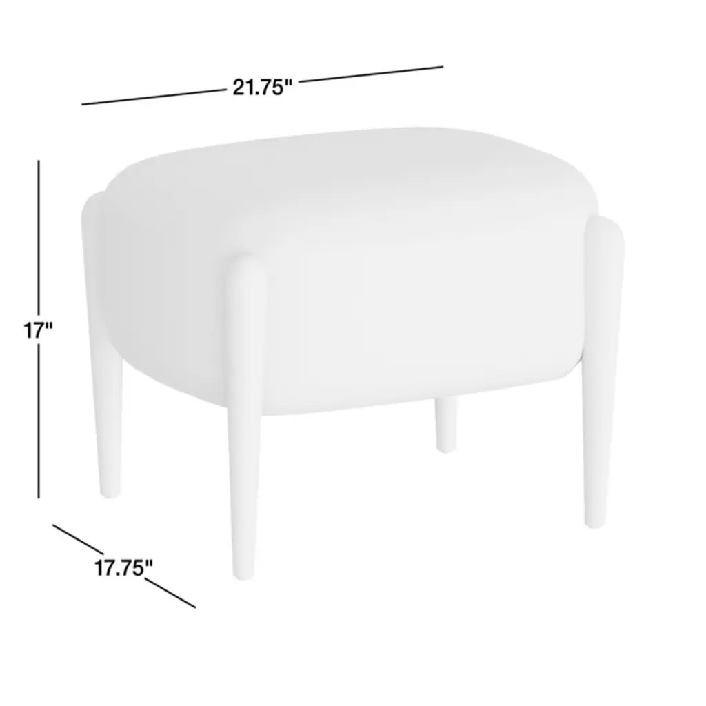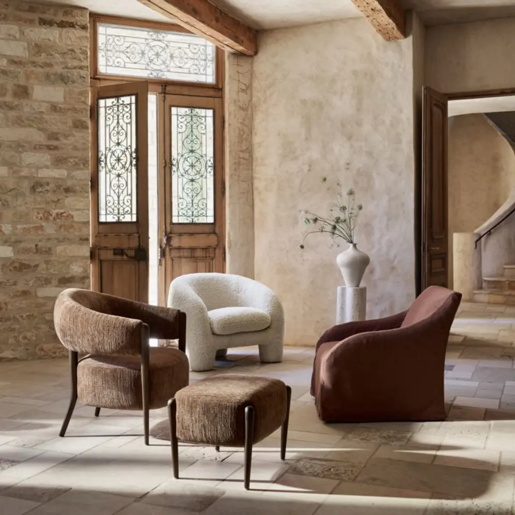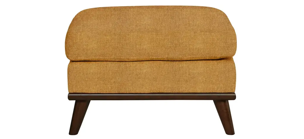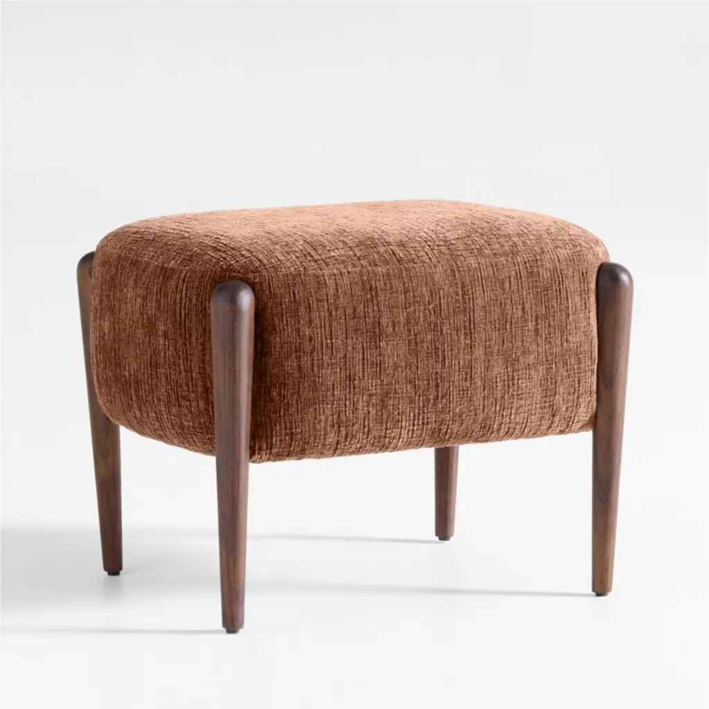 Tapered wood and soft, rounded forms add Scandinavian flavor to Santi's contemporary proportions. Turned legs of dark walnut-finished oak frame the curved contours of the substantial seat, thoughtfully cushioned to provide a supportive yet comfortably soft place to prop feet. The plush upholstery in deep sienna brown offers the luxe feel of chenille with striated texture for an organic look. The ottoman complements the coordinating armchair.