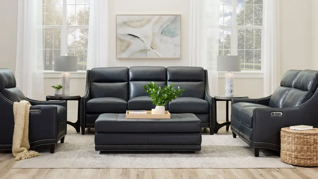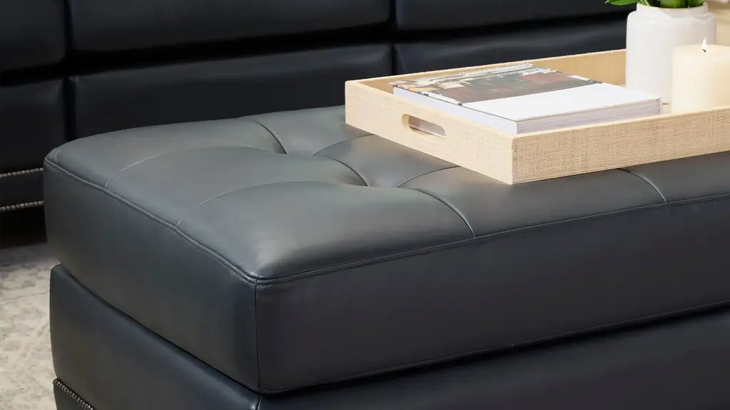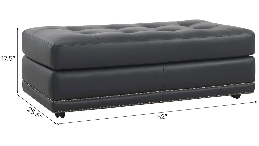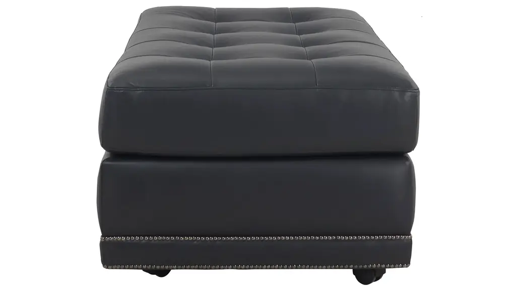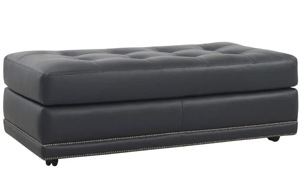 Indulge in the comfort and sophistication of the timeless Sebastian leather cocktail ottoman with casters. A versatile piece for use as a footrest, extra seat, or cocktail table, it features top grain leather in unforgettable blue or tranquil gray for a touch of luxury with functional benefits you'll love.