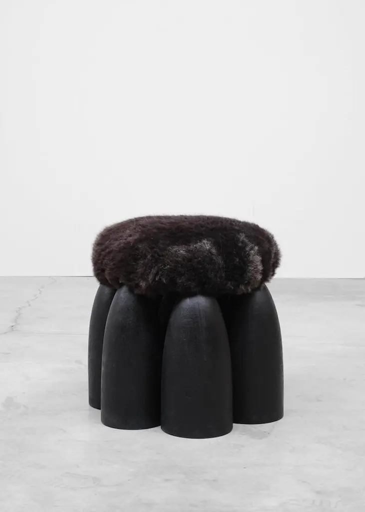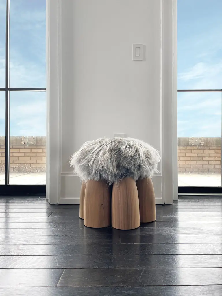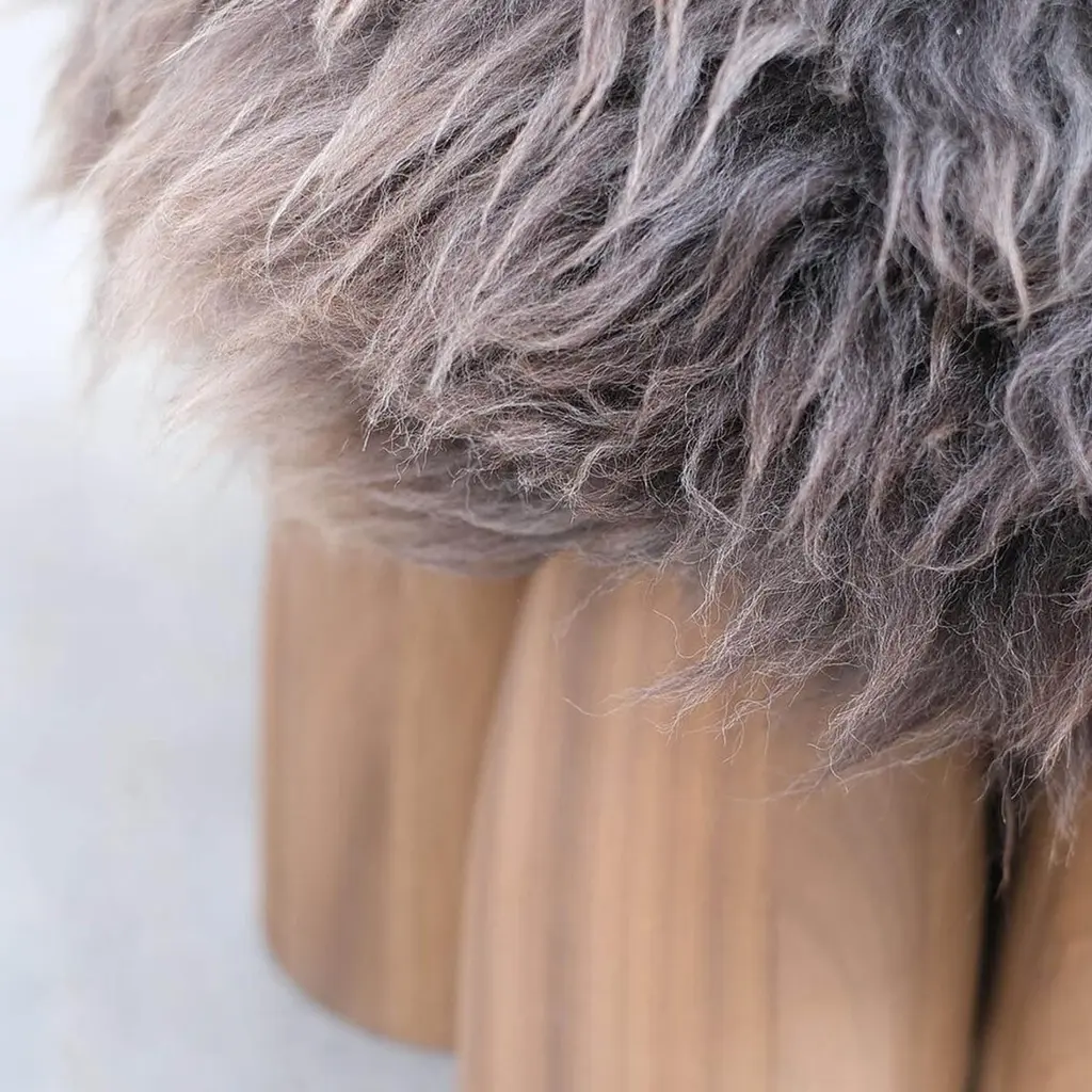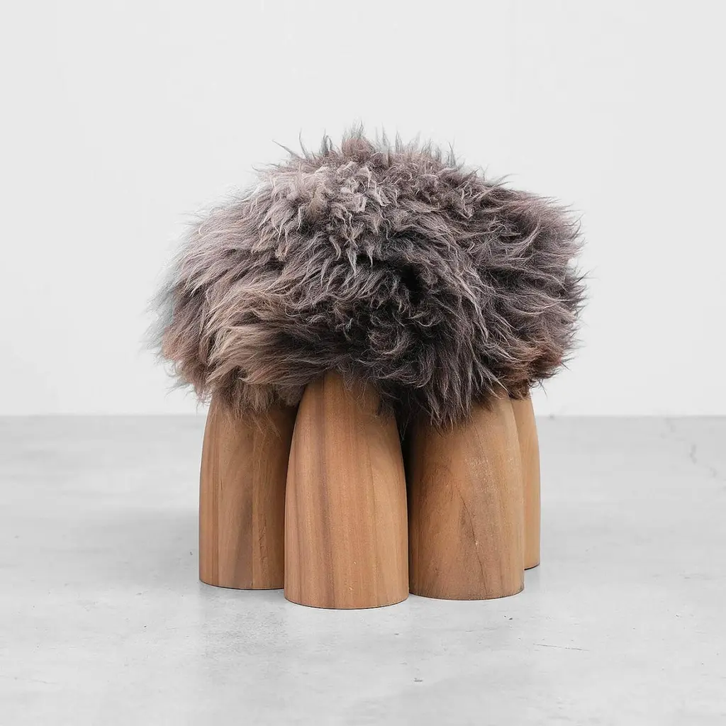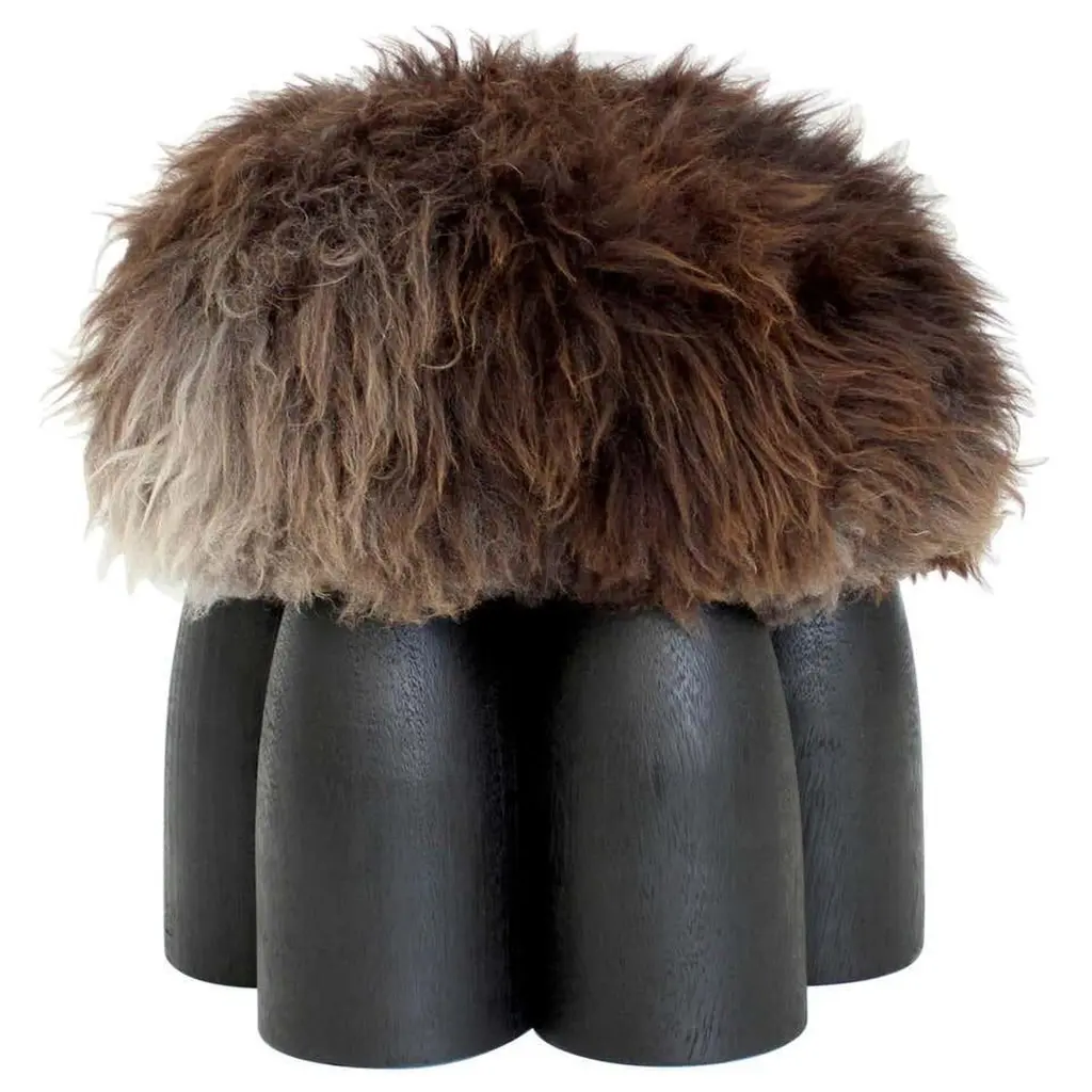 Senufo ottoman in African walnut by Arno DeclercqMade African walnut and sheep wool. (ask for different wool colors)Fur color based on availabilityMeasures: L 45 cm x W 45 cm x H 40 cm, L 17.7” x W 17.7” x H 15.7”Material: African walnutMade by handSigned by Arno DeclercqArno DeclercqBelgian designer and art dealer who makes bespoke objects with passion for design, atmosphere, history and craft. Arno grew up in a family with parents who like to work with beautiful brands and objects.His father studied at the Royal Academy of Arts Fashion Department, he worked for Bikkembergs and made his own fashion brands, but has also collected tribal arts for more than 20 years. His mother, who worked with his father from the beginning, bought a shoe store in 2010 where they sold brands as Rick Owens, Ann Demeulemeester, Maison Martin Margiela. With the interest in beauty he learned from his parents, Arno studied interior design, after learning a lot about materials and with great knowledge of history he designed interiors and opened his own gallery for ethnographic art and design.The collection has come to the idea that there are too few interiors where they no longer have the big and static vases and candlesticks that the people had in big houses over 100 years ago. By focusing on architecture, ancient arts and design, after war buildings, defense buildings (bunkers and fortresses) and tribal arts, he created a collection that became a Classic.Each piece is unique because it is entirely handcrafted by him. Made of tropical hardwood called Iroko this he discovered after one of his many trips to West Africa interested in voodoo arts.In these strange tribal arts, the wood "Iroko" is used in many objects, according to their culture, the ancestors lives in these trees, and they also call this tree "the king of the forest".Arno also combines this with Belgian oak that dried for more than 30 years, wood that was provided for the many furniture makers in Mechelen.By treating these objects through the Yakusugi technique or another mentioned "Shou Sugi Ban" an ancient Japanese technique where the objects are burned to protect the wood from weathering and subsequently fixed to get a patina look as long as possible. This gives each object a unique texture.