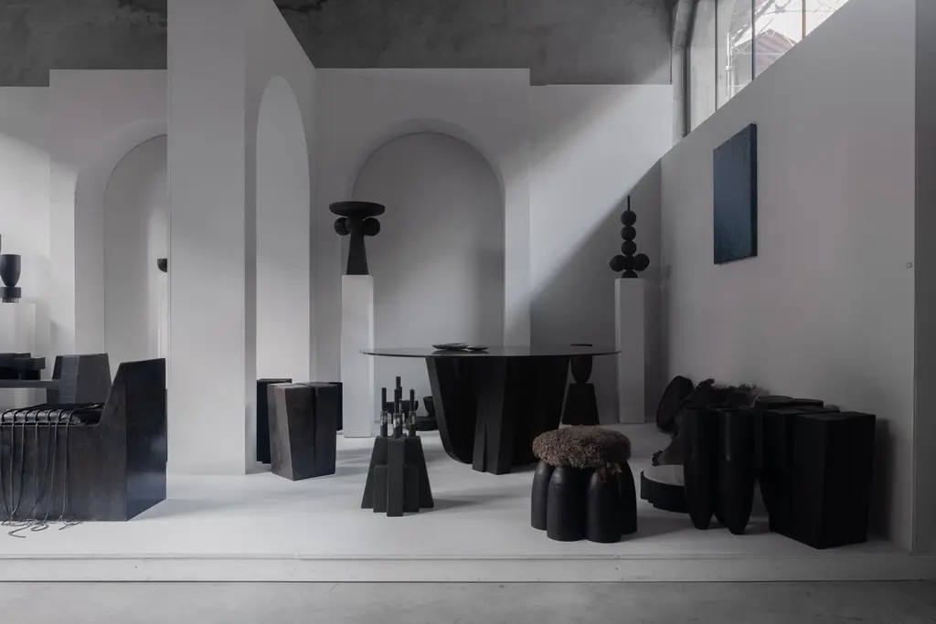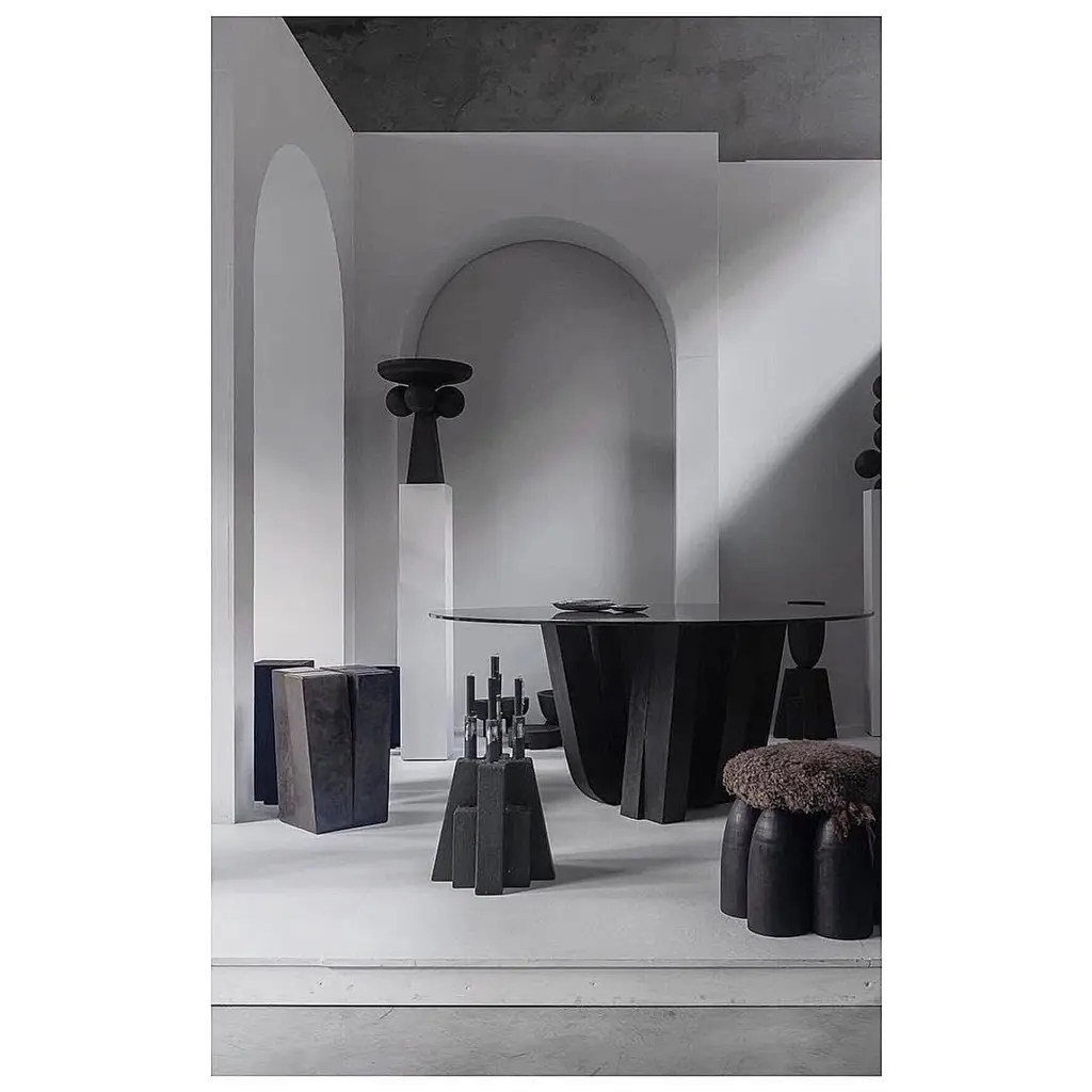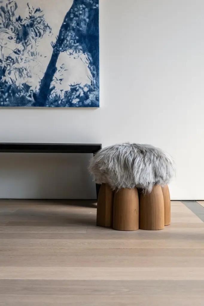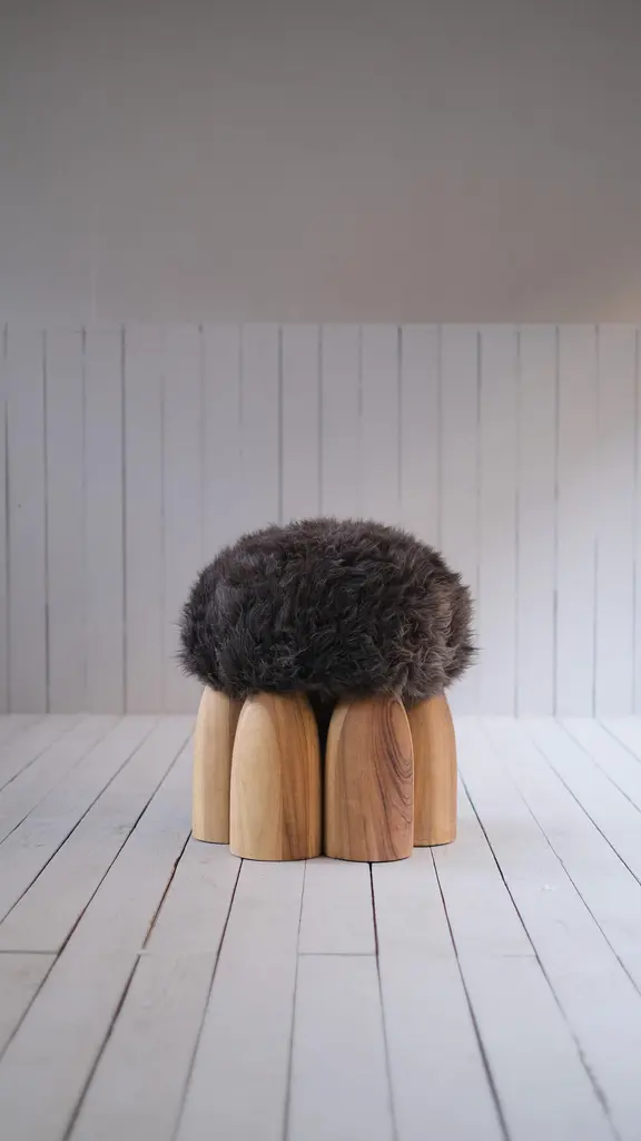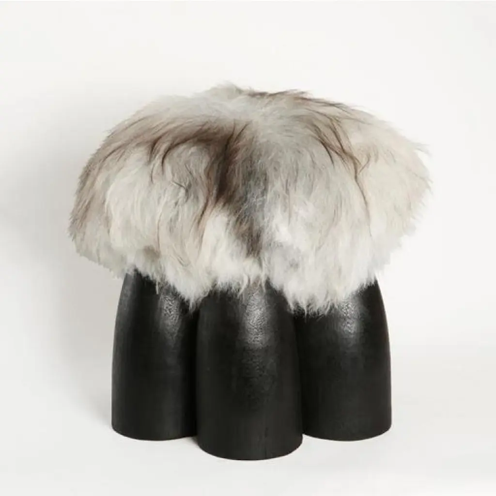 Senufo ottoman in African walnut by Arno DeclercqMade African walnut and sheep wool. (ask for different wool colors)Fur color based on availabilityMeasures: L 45 cm x W 45 cm x H 40 cm, L 17.7” x W 17.7” x H 15.7”Material: African walnutMade by handSigned by Arno DeclercqArno DeclercqBelgian designer and art dealer who makes bespoke objects with passion for design, atmosphere, history and craft. Arno grew up in a family with parents who like to work with beautiful brands and objects.His father studied at the Royal Academy of Arts Fashion Department, he worked for Bikkembergs and made his own fashion brands, but has also collected tribal arts for more than 20 years. His mother, who worked with his father from the beginning, bought a shoe store in 2010 where they sold brands as Rick Owens, Ann Demeulemeester, Maison Martin Margiela. With the interest in beauty he learned from his parents, Arno studied interior design, after learning a lot about materials and with great knowledge of history he designed interiors and opened his own gallery for ethnographic art and design.The collection has come to the idea that there are too few interiors where they no longer have the big and static vases and candlesticks that the people had in big houses over 100 years ago. By focusing on architecture, ancient arts and design, after war buildings, defense buildings (bunkers and fortresses) and tribal arts, he created a collection that became a Classic.Each piece is unique because it is entirely handcrafted by him. Made of tropical hardwood called Iroko this he discovered after one of his many trips to West Africa interested in voodoo arts.In these strange tribal arts, the wood "Iroko" is used in many objects, according to their culture, the ancestors lives in these trees, and they also call this tree "the king of the forest".Arno also combines this with Belgian oak that dried for more than 30 years, wood that was provided for the many furniture makers in Mechelen.By treating these objects through the Yakusugi technique or another mentioned "Shou Sugi Ban" an ancient Japanese technique where the objects are burned to protect the wood from weathering and subsequently fixed to get a patina look as long as possible. This gives each object a unique texture.