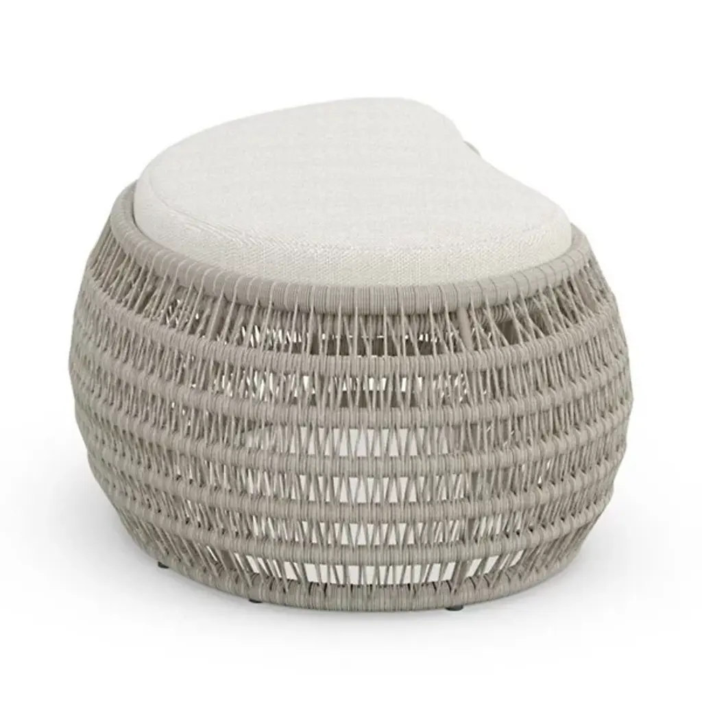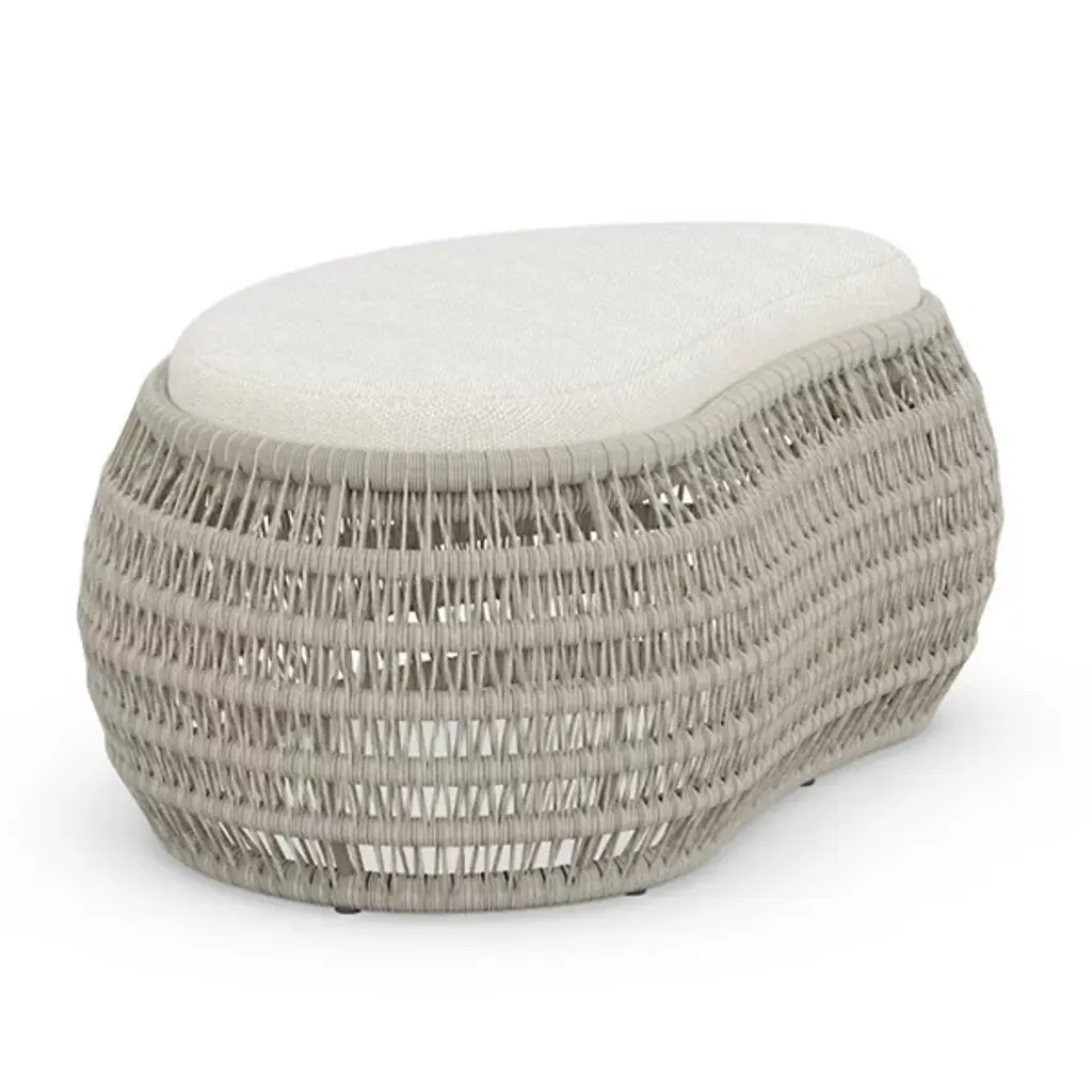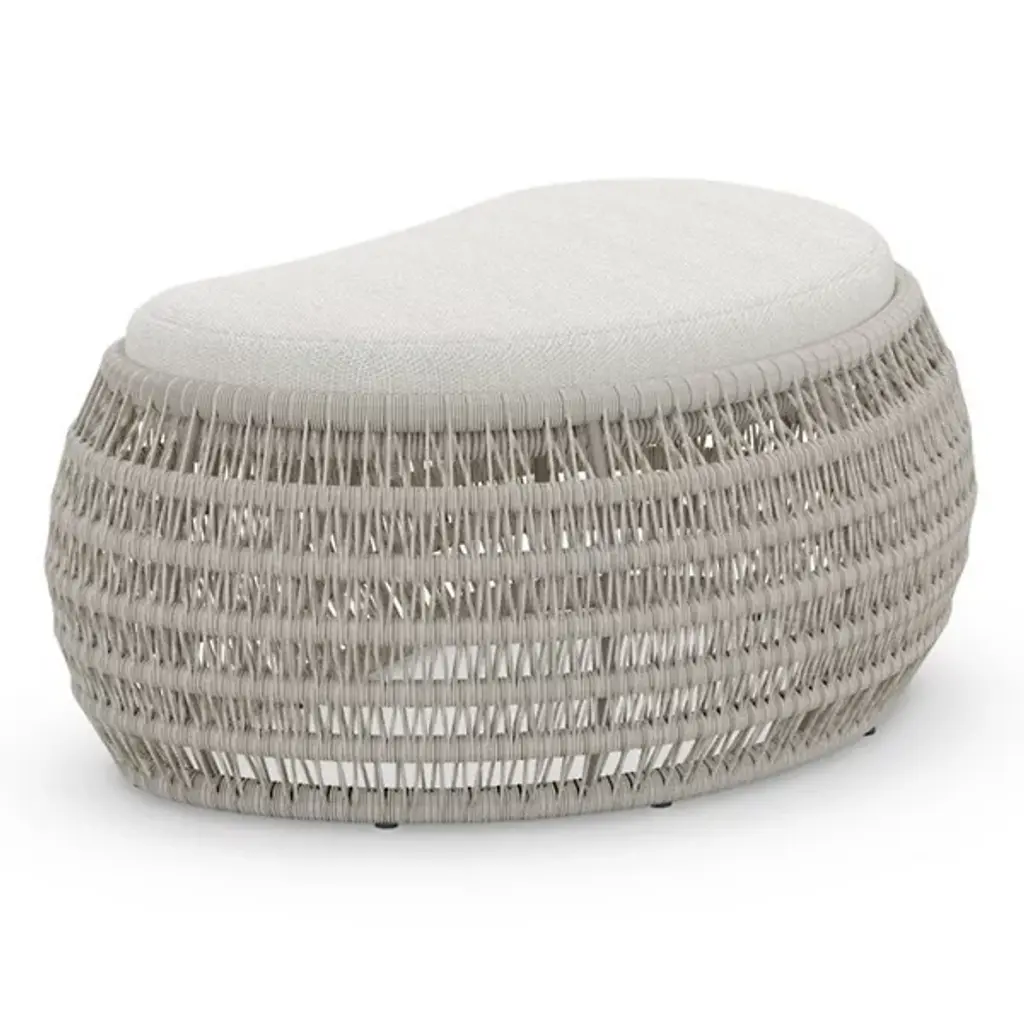 The Sicily Ottoman with Cushion from Azzurro Living features irregular basket weaving that creates rich texture through varied rope densities and carefully placed open patterns. This piece strikes a balance between substantial comfort and artisanal craftsmanship, with its aluminum frame supporting generous cushioning wrapped in soft, performance fabric. The ottoman's woven body displays natural variations in rope placement, giving each piece individual character. Its rounded form and organic weaving techniques establish a relaxed aesthetic that complements both structured and casual outdoor arrangements.