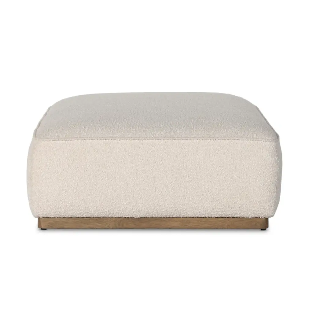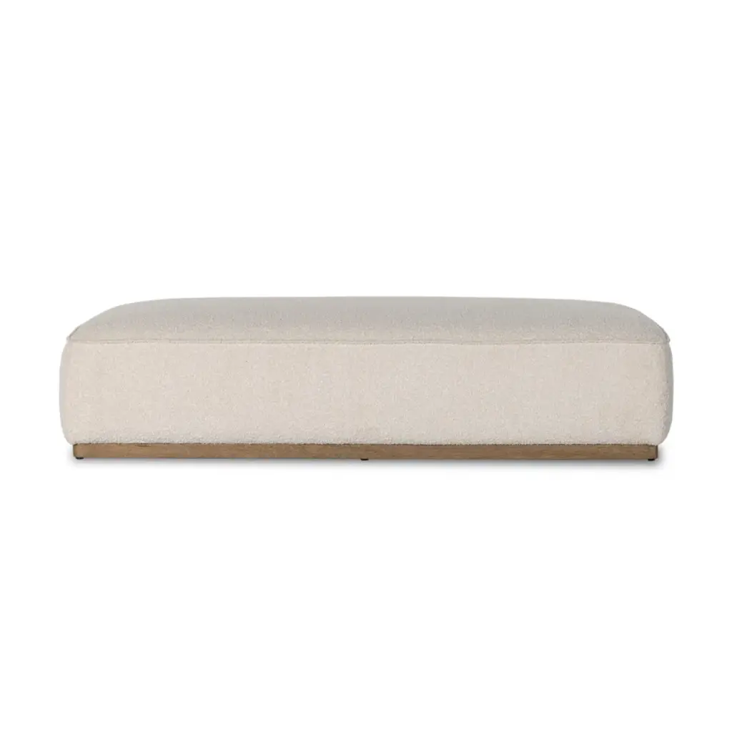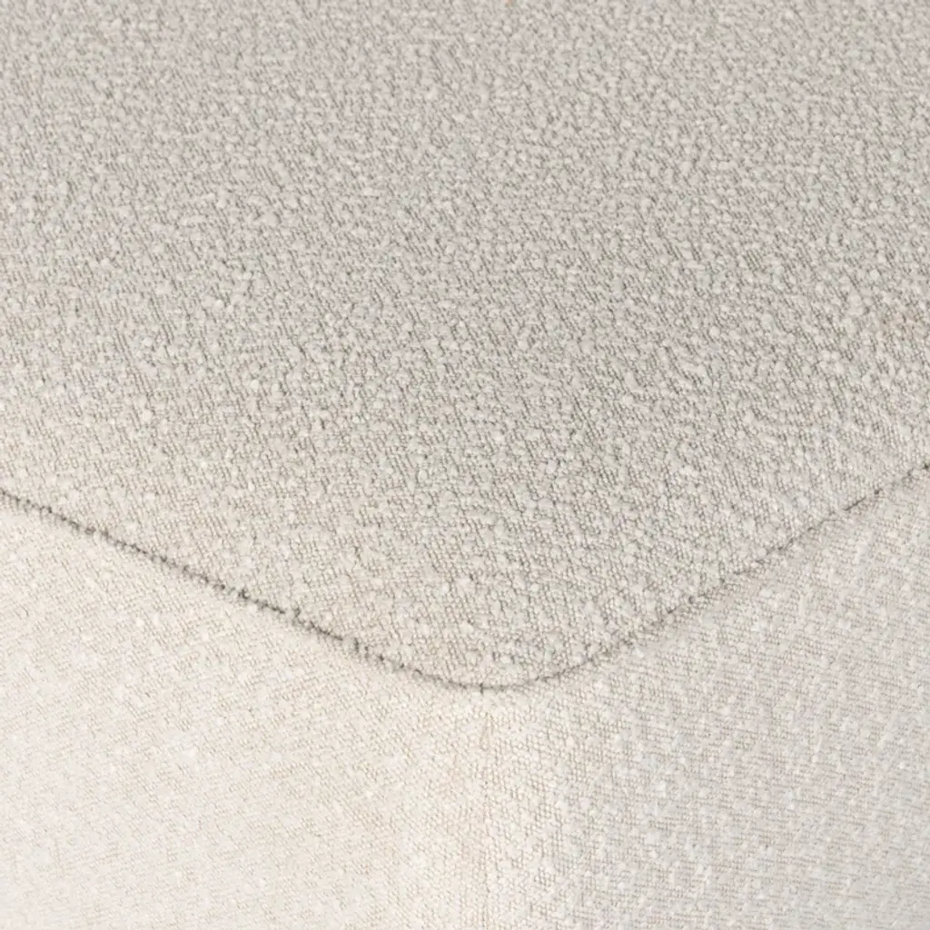 Upholstered in a chunky, textural boucle performance fabric and paired with a subtly distressed para wood base, this large, rectangular ottoman can be placed just about anywhere – bringing with it a retro vibe. Style with a tray as a design-forward coffee table. Performance fabrics are specially created to withstand spills, stains, high traffic, and wear, ensuring long-term comfort and unmatched durability.