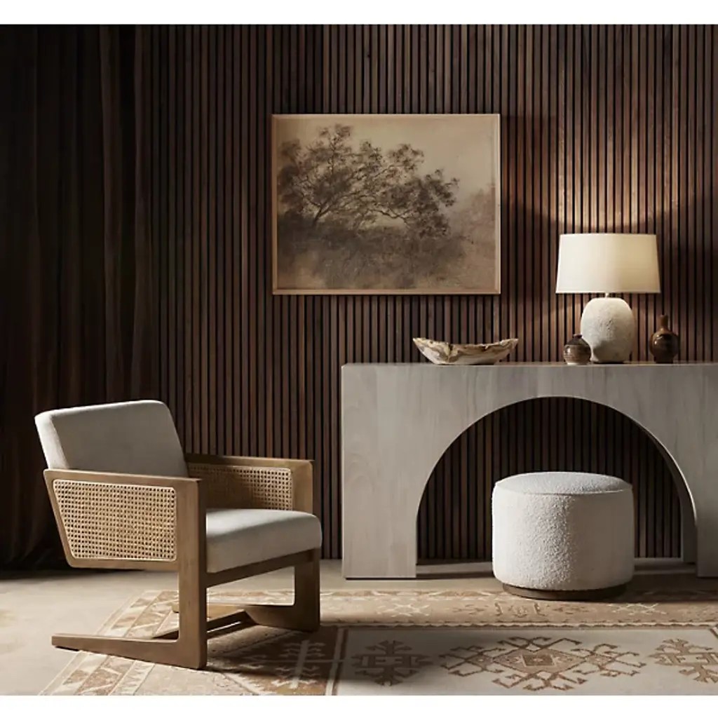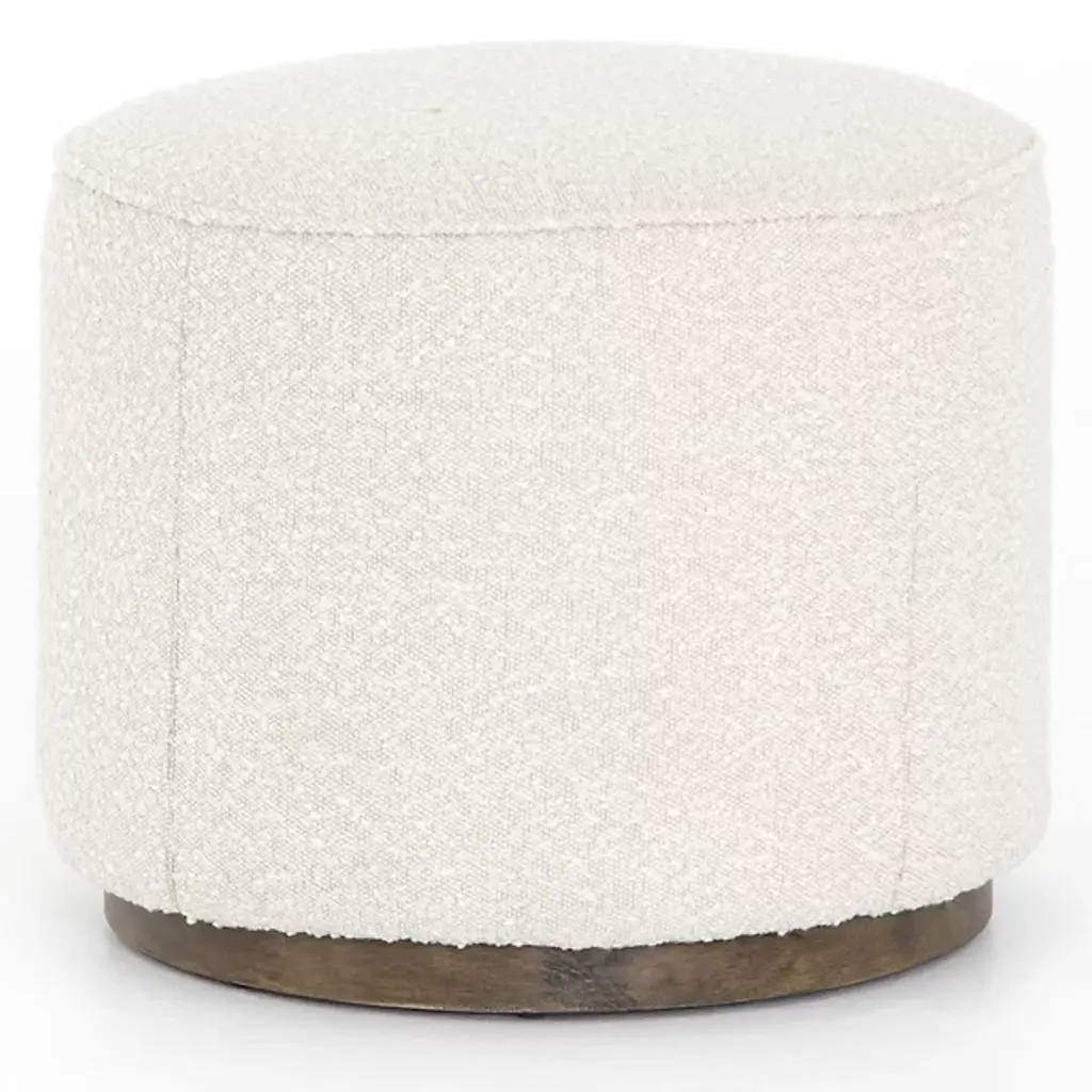 The Sinclair Round Ottoman from Four Hands fuses style and comfort. Crafted from solid parawood for durability, this ottoman is upholstered with fine fabric, providing a touch of luxury for your space. Filled with a plush combination of 95% polyester and 5% acrylic, it is an inviting seating option. The round shape adds a convenient and versatile element to your interior setting. Simple yet sophisticated, Sinclair completes the look of your home.