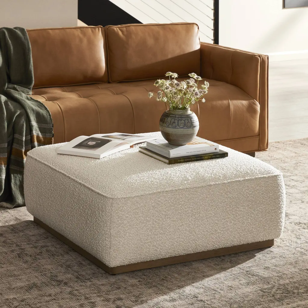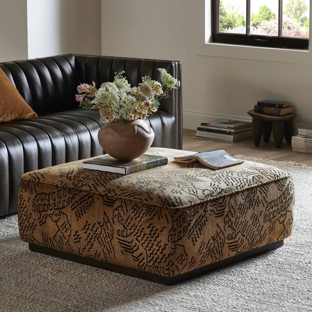 Elevate your favorite living or lounge space with the Sinclair Square Ottoman from Four Hands. Upholstered in a stunning, one-of-a-kind fabric, this ottoman adds a touch of global influence to any room, while its solid wood base adds a touch of warmth and durability. Versatile and eye-catching, this ottoman is a must-have for any tasteful home. Highlights