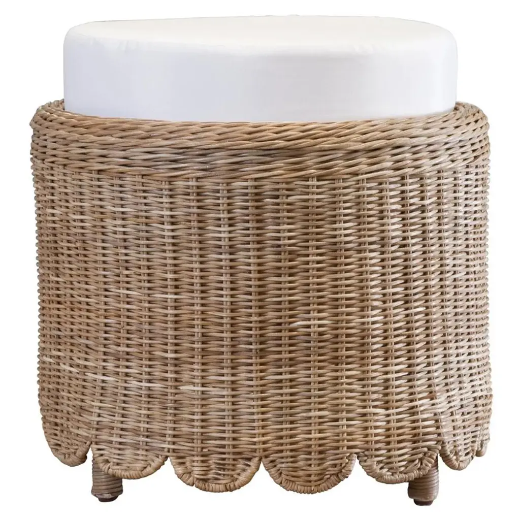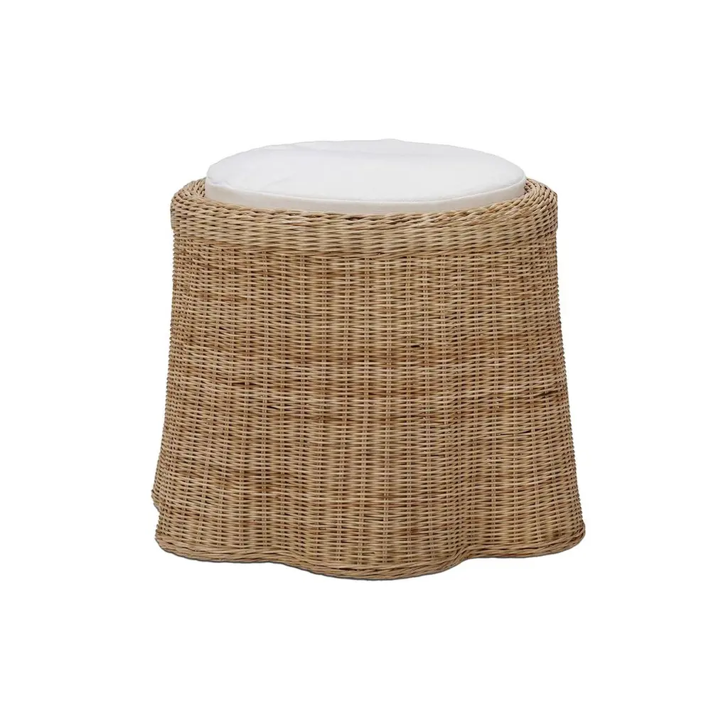Crafted with high-quality rattan, this round stool features a charming natural finish that adds a warm and inviting vibe to your decor and has a round arctic white upholstered cushion. The round shape and delicate curves create a sophisticated draped silhouette, making it an eye-catching addition to your living room, sunroom, or patio.Ideal for hosting guests or enjoying a cozy evening at home, this versatile seat seamlessly complements any decor style. Brand new and ready to enhance your space, this piece is the perfect blend of beauty and practicality.Dimensions: 22" W x 22" D x 20" HCustom finish options are also available. Contact us to learn more.